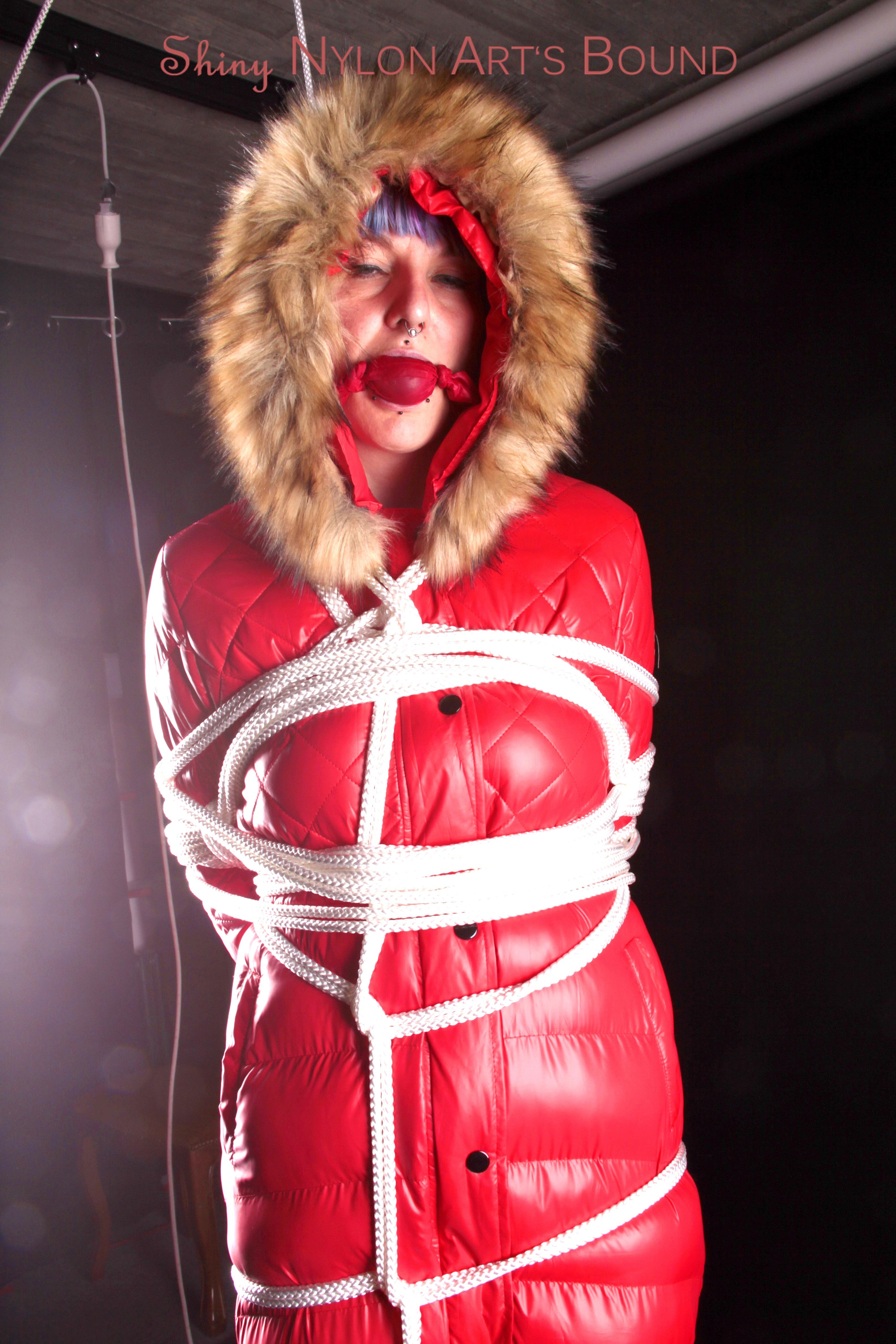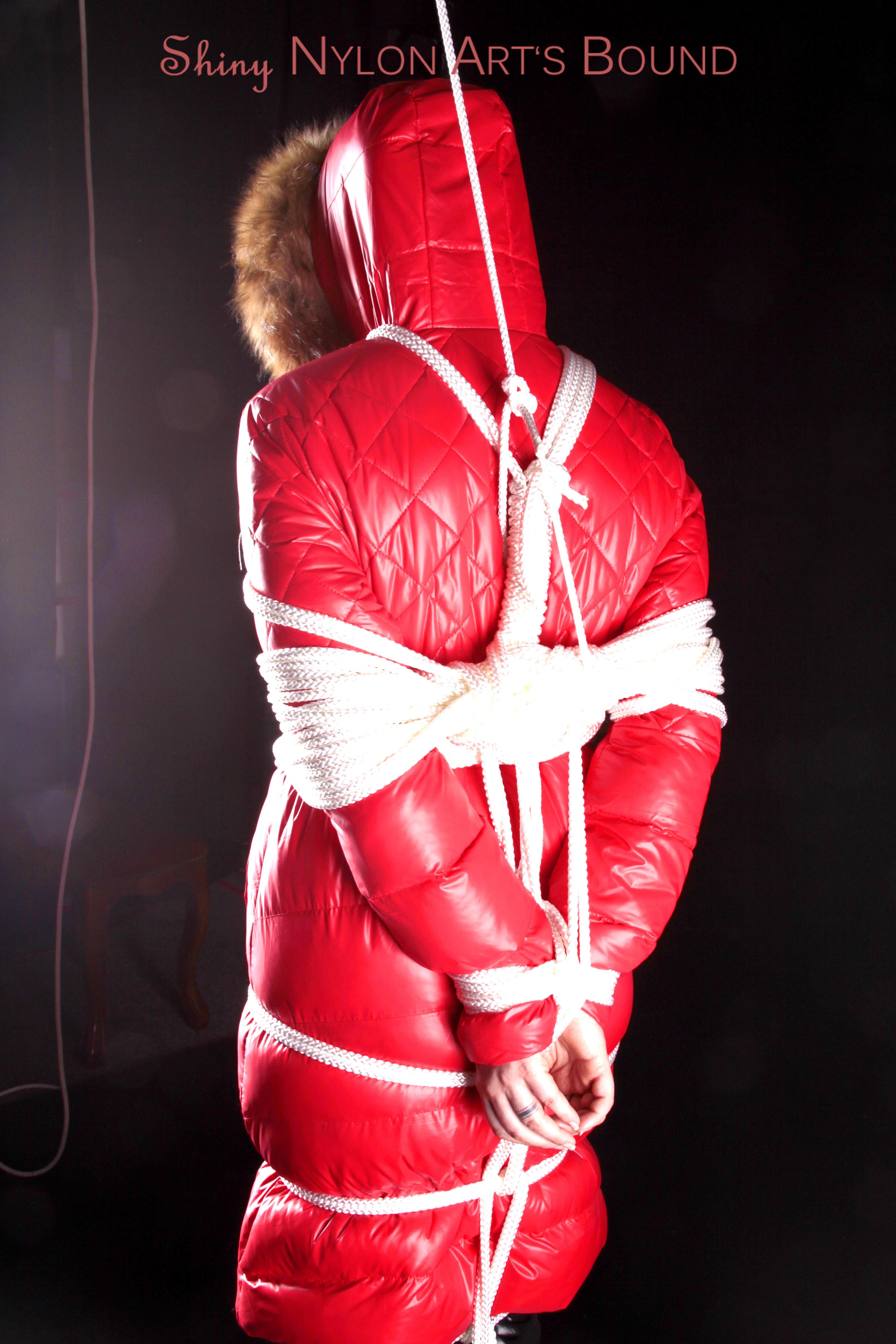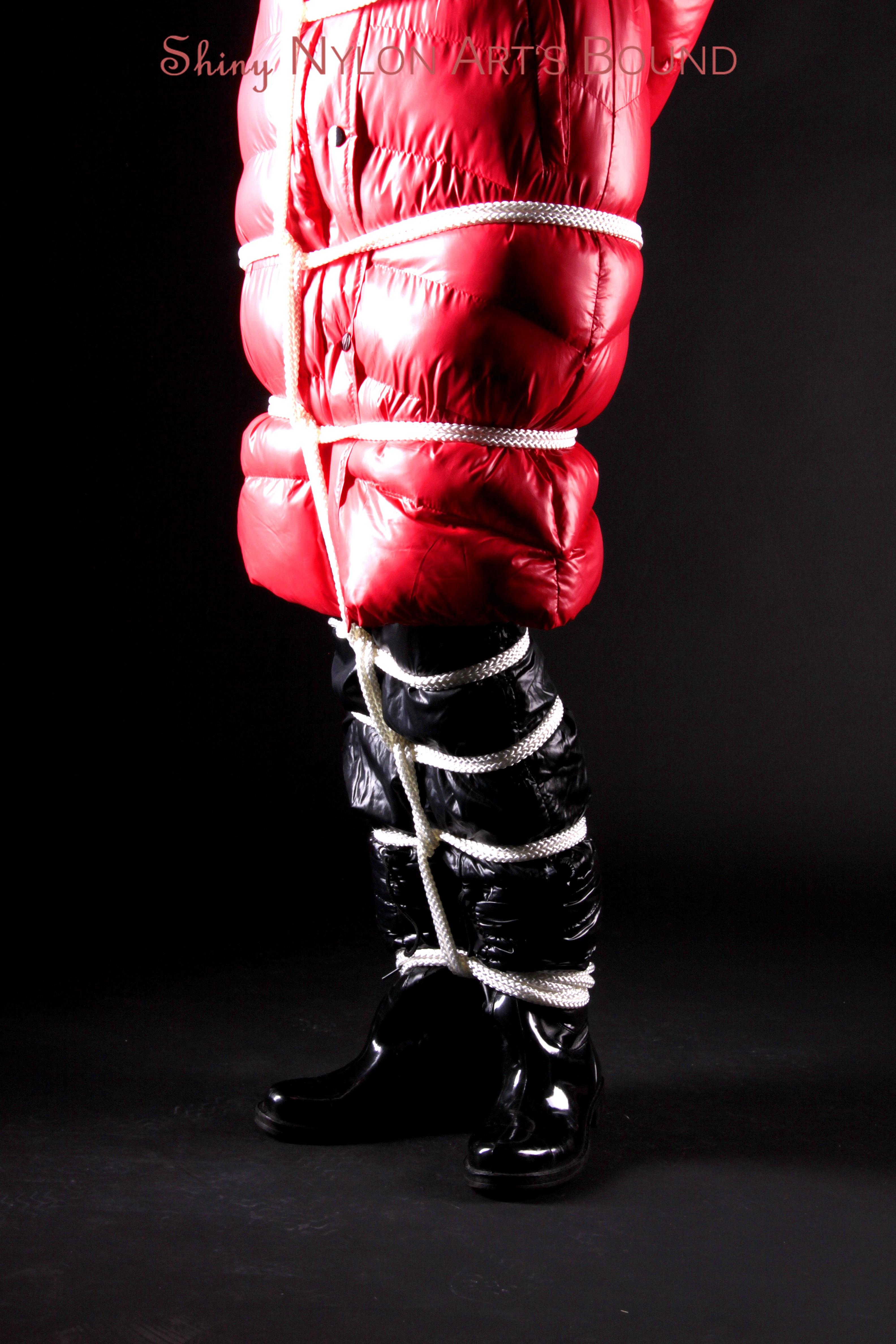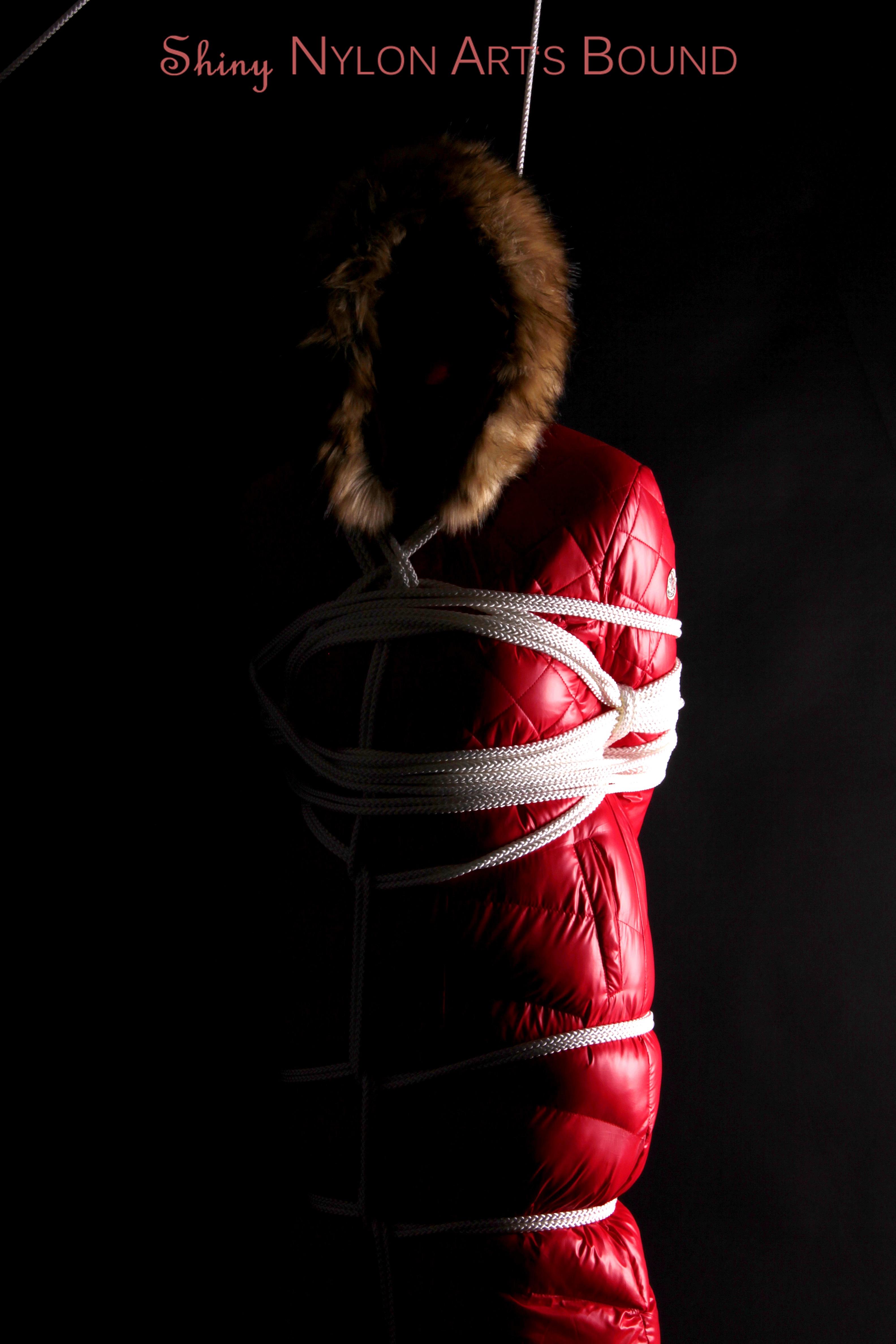 Mara wearing a sexy black shiny nylon down pants and a brandnew red special down jacket tied and gagged overhead with ropes (Pics)