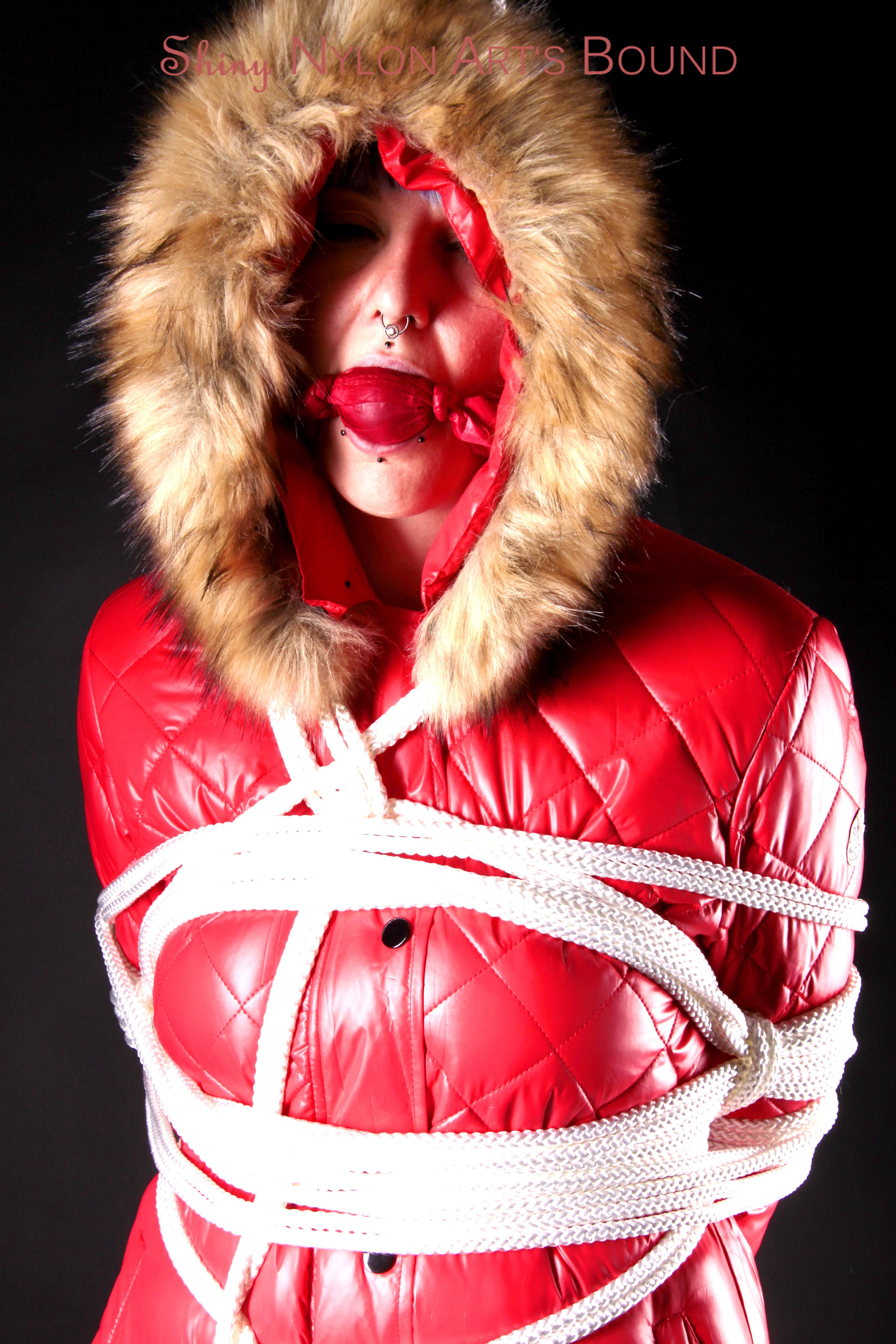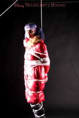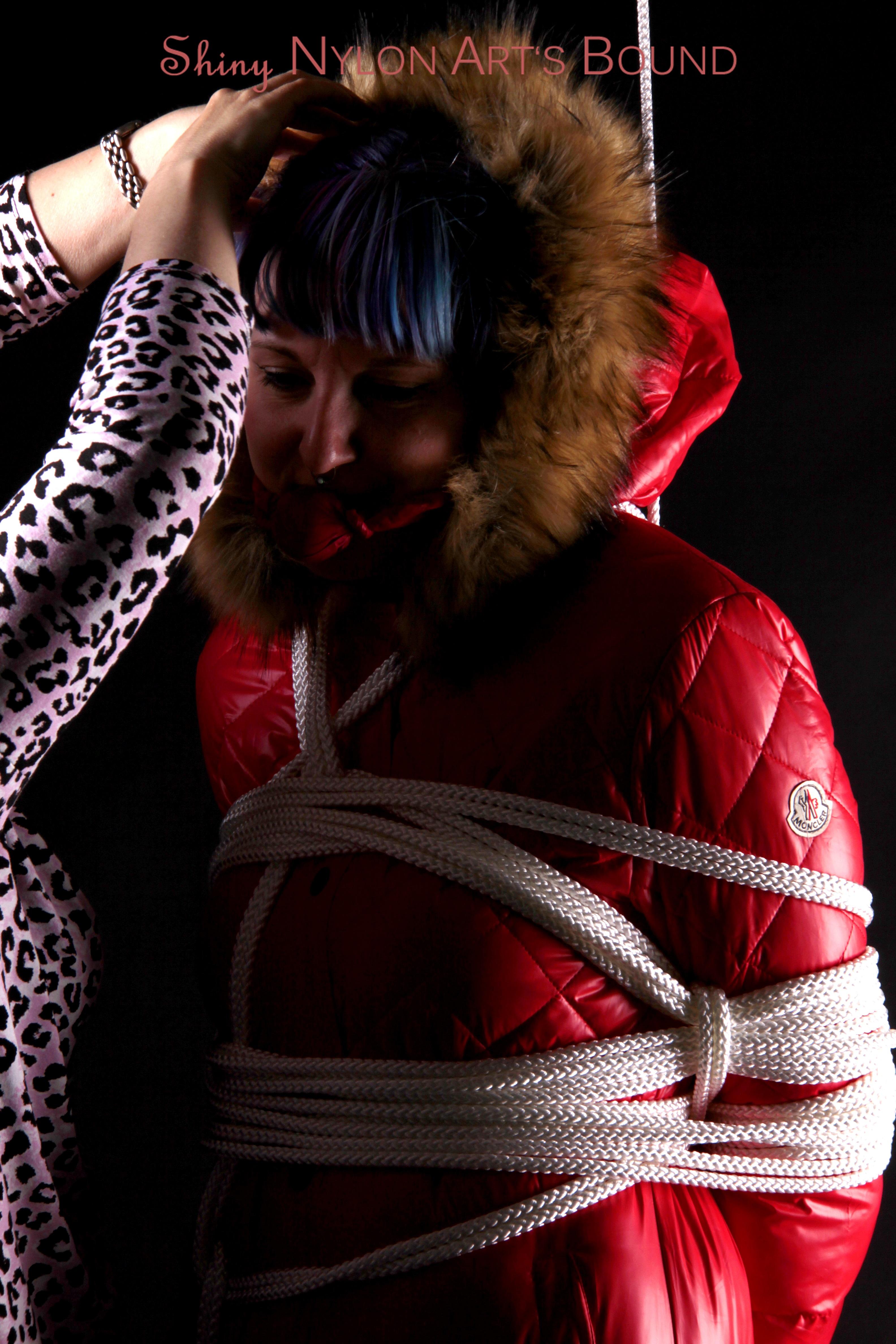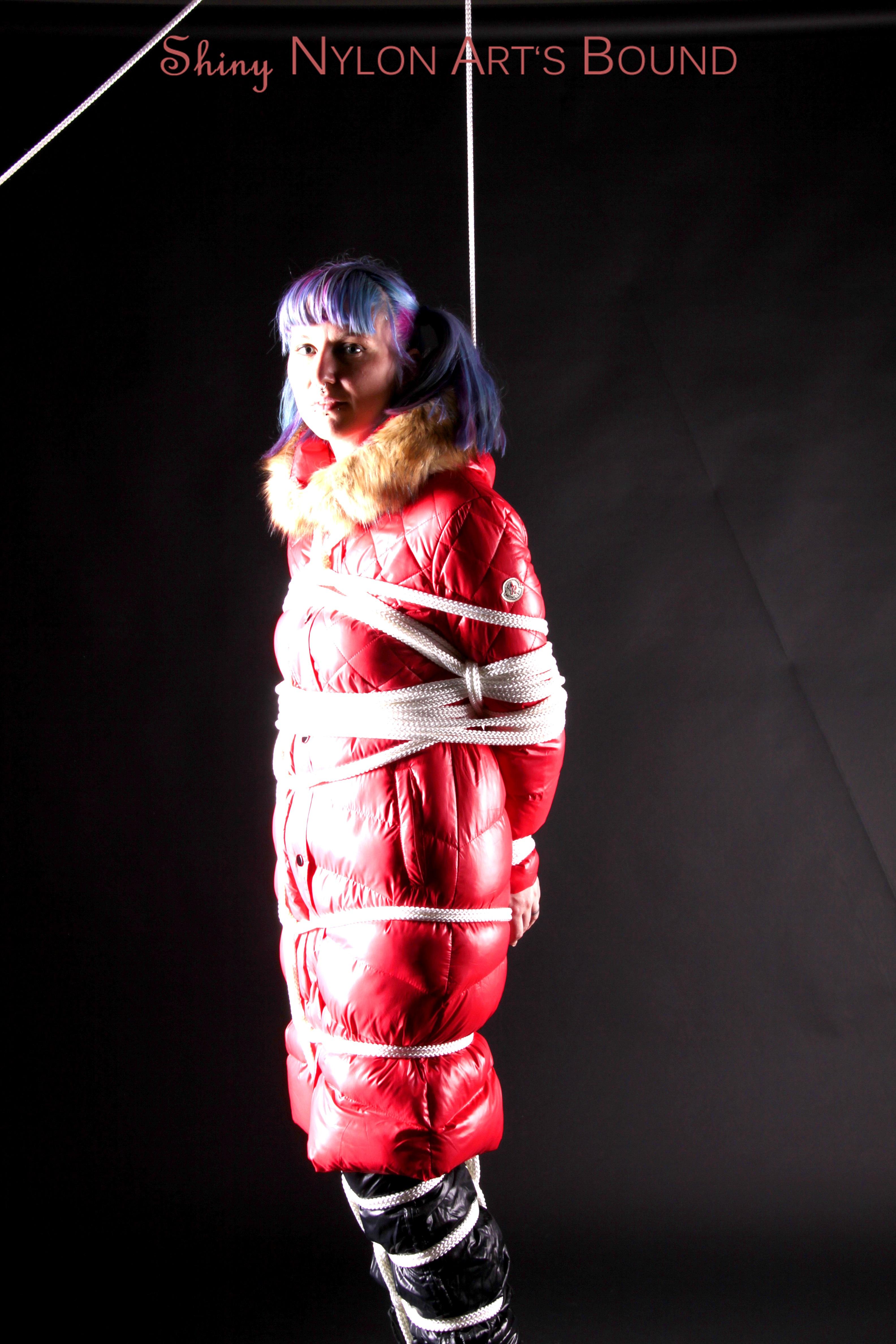 Mara wearing a sexy black shiny nylon down pants and a brandnew red special down jacket tied and gagged overhead with ropes (Pics)