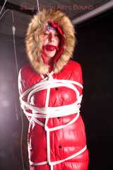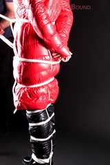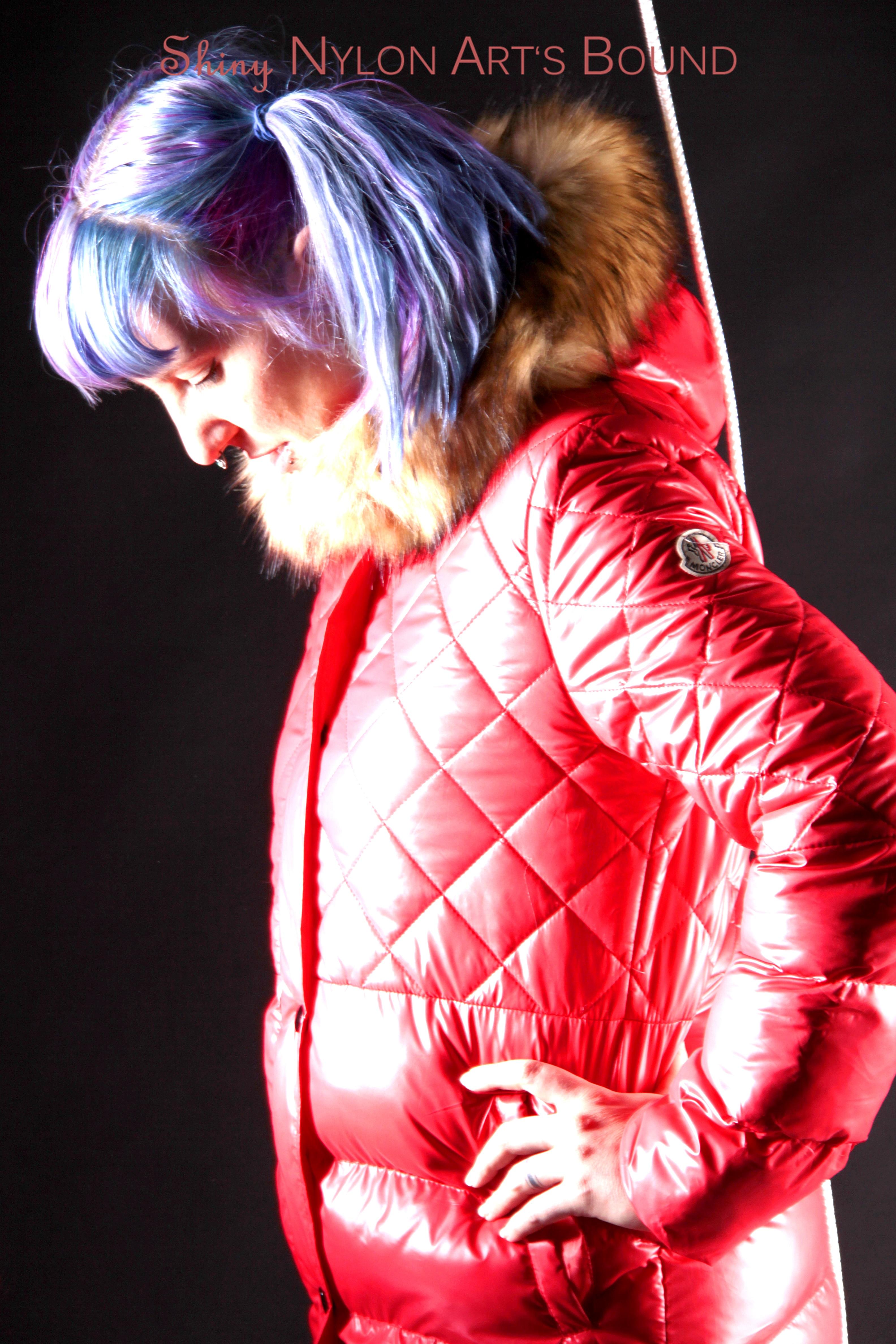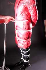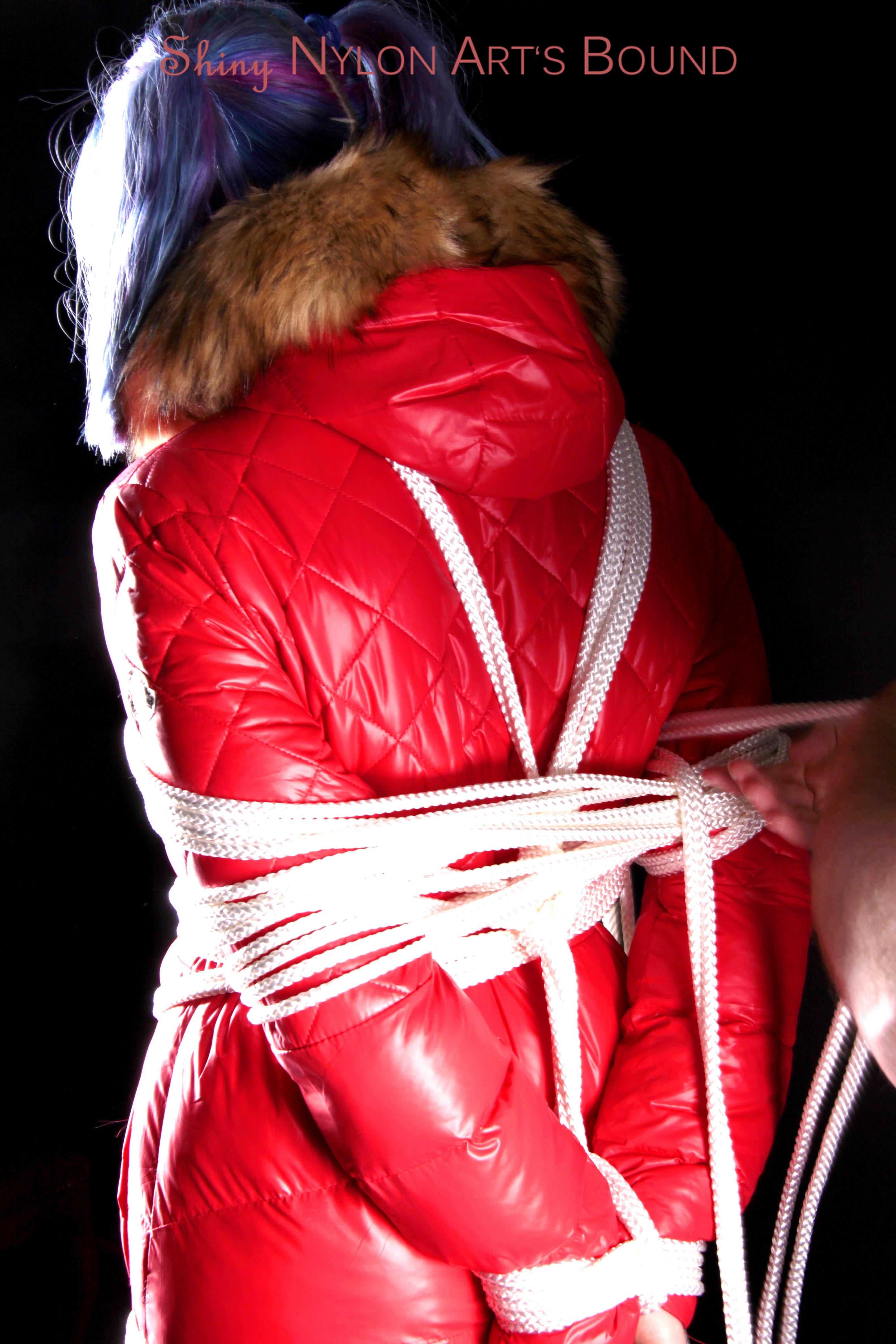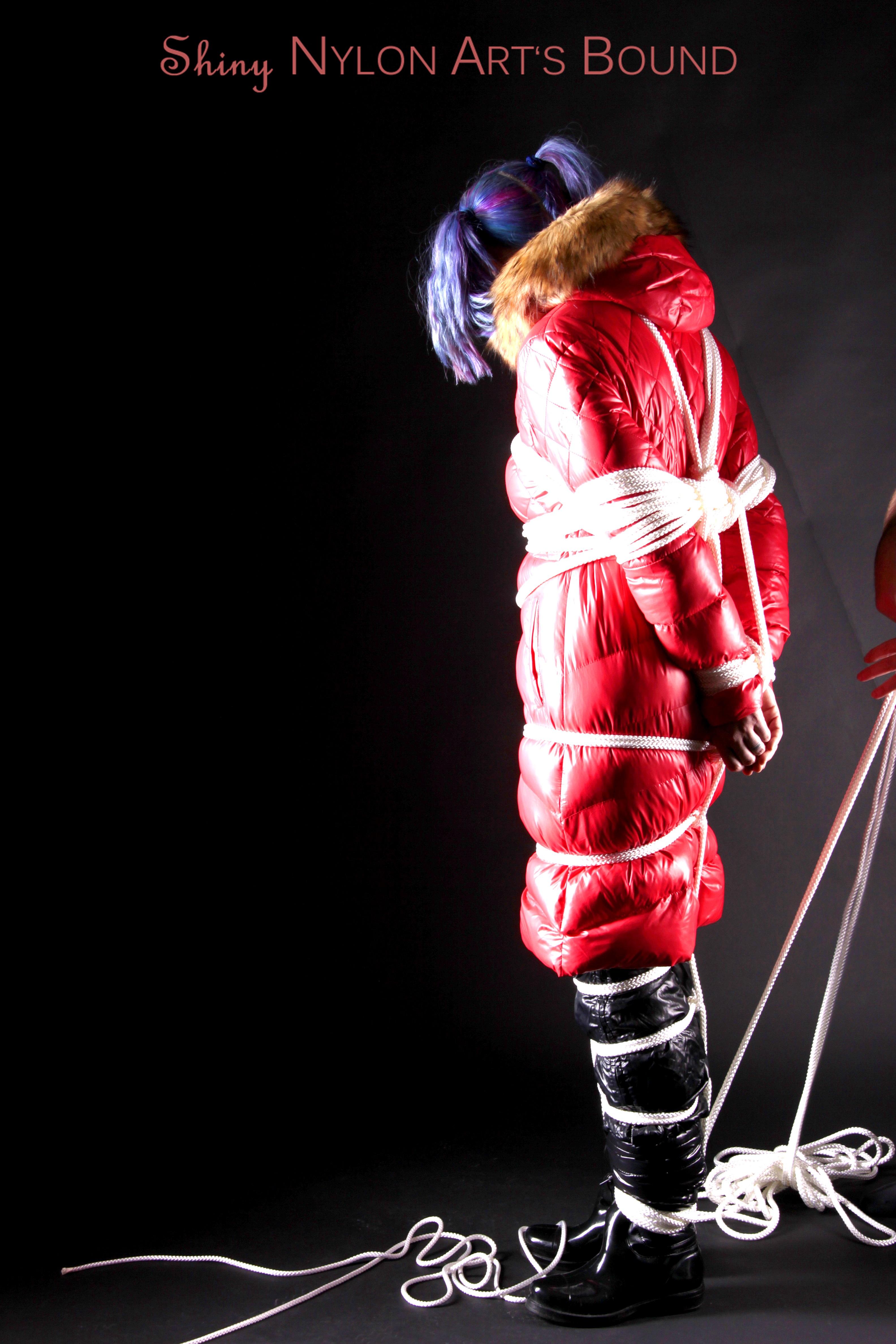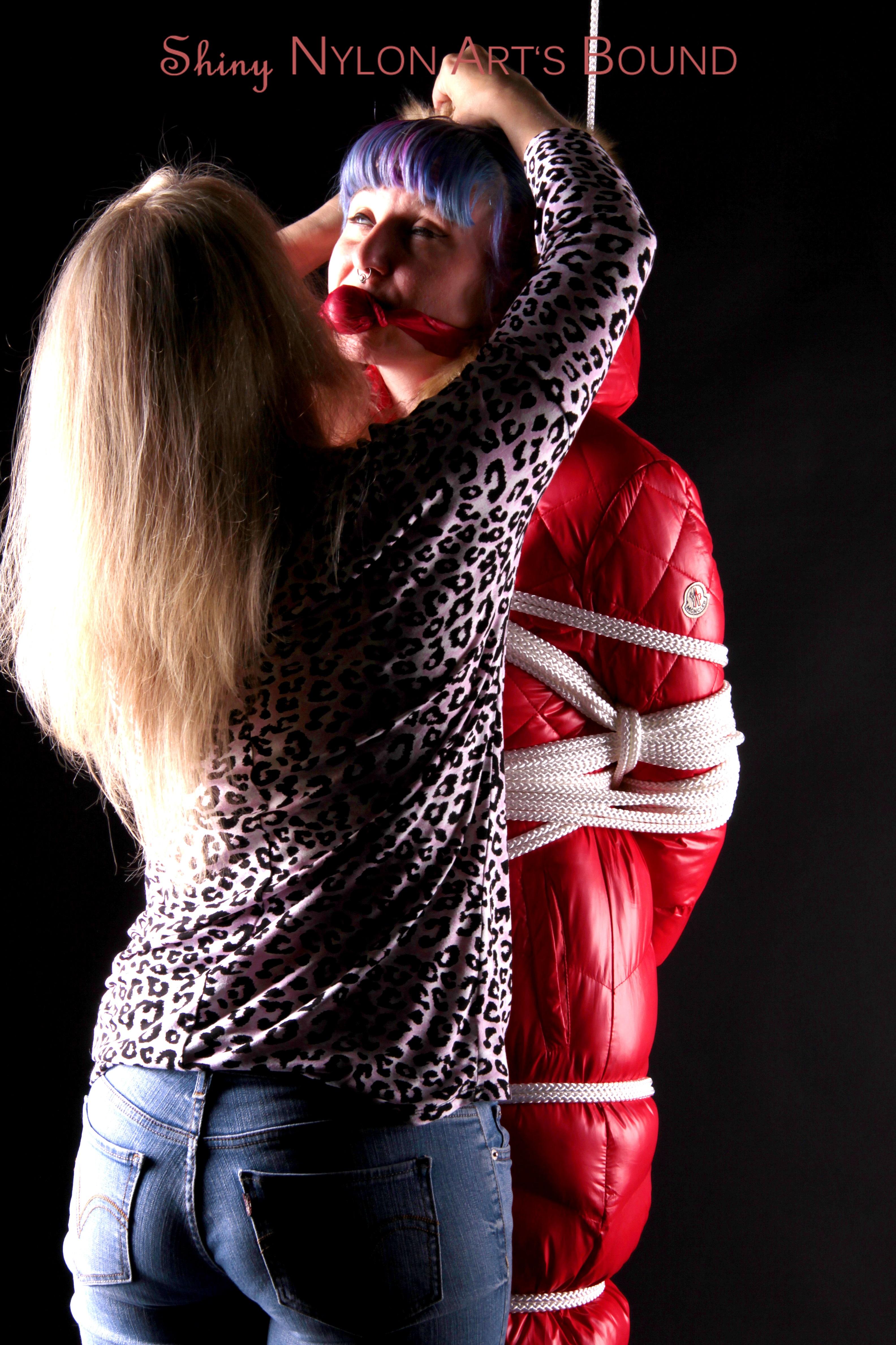Mara wearing a sexy black shiny nylon down pants and a brandnew red special down jacket tied and gagged overhead with ropes (Pics)