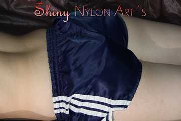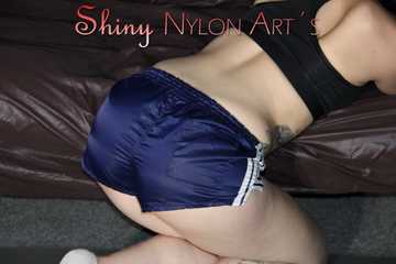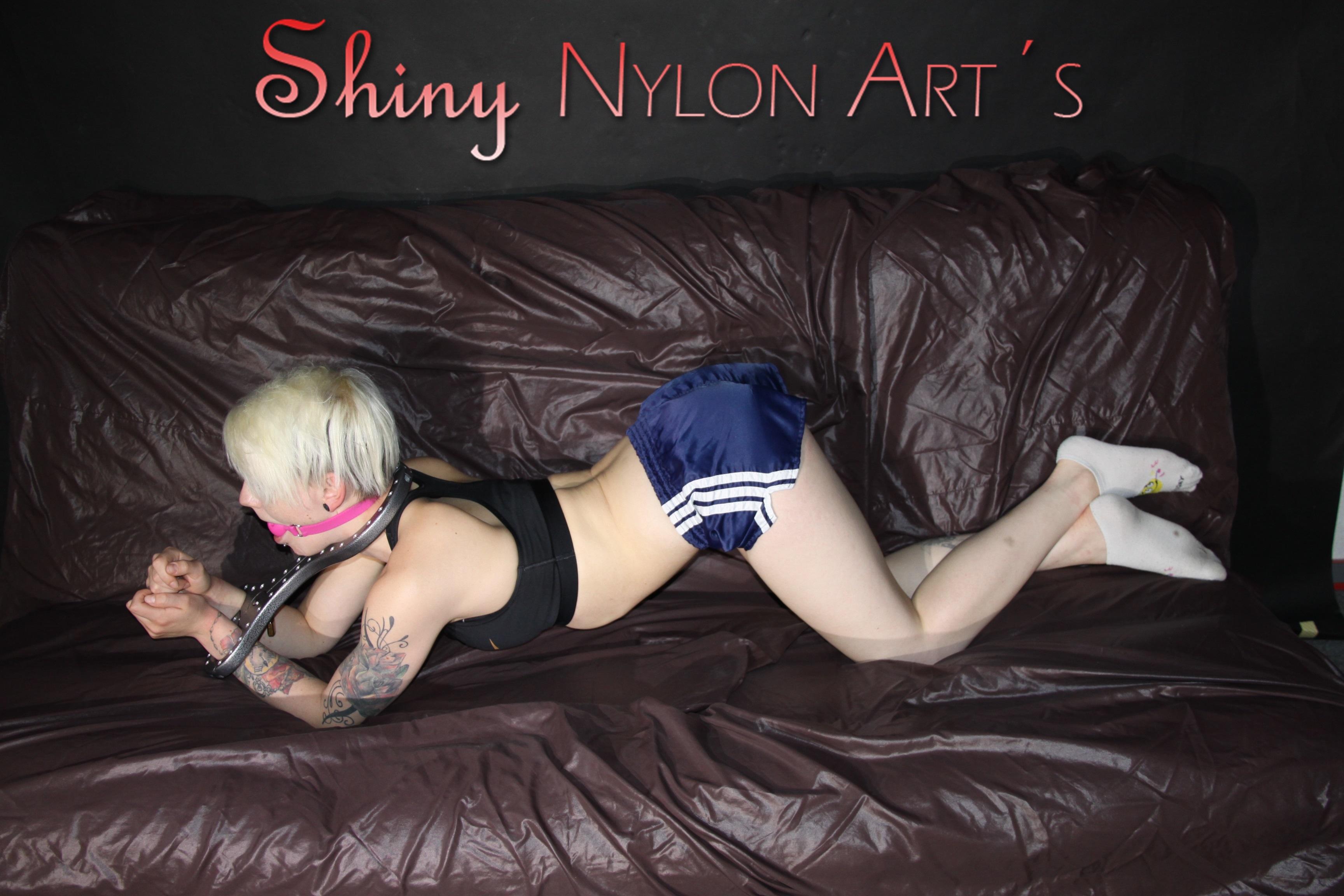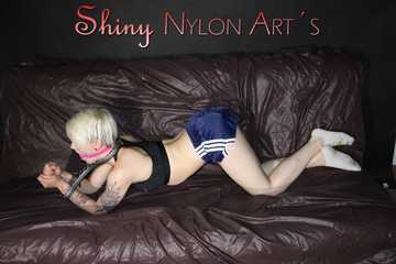 New Modell COURTNEY wearing a sexy oldschool blue shiny nylon shorts and a black top being tied and gagged with a pillory and a ballgag (Pics)