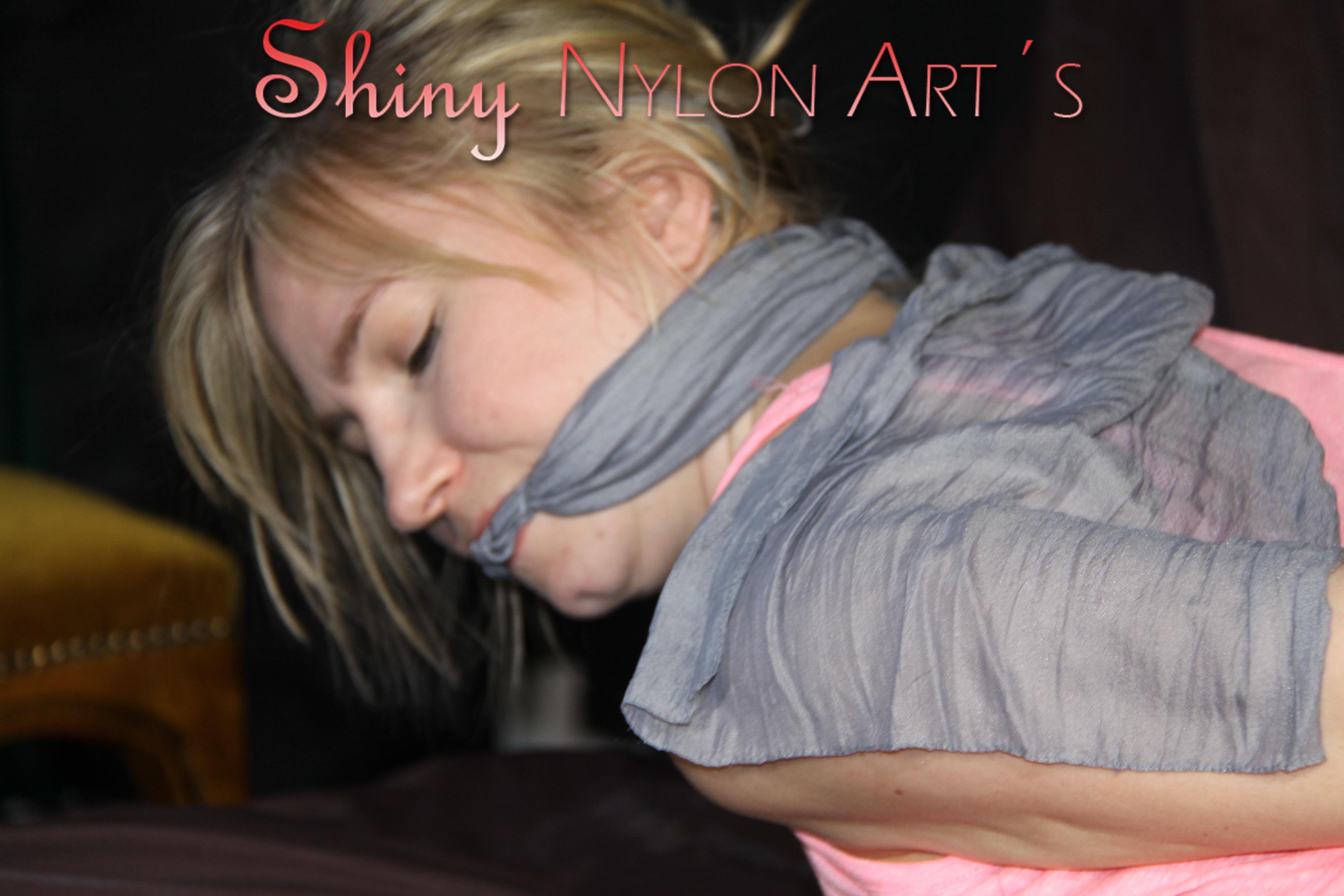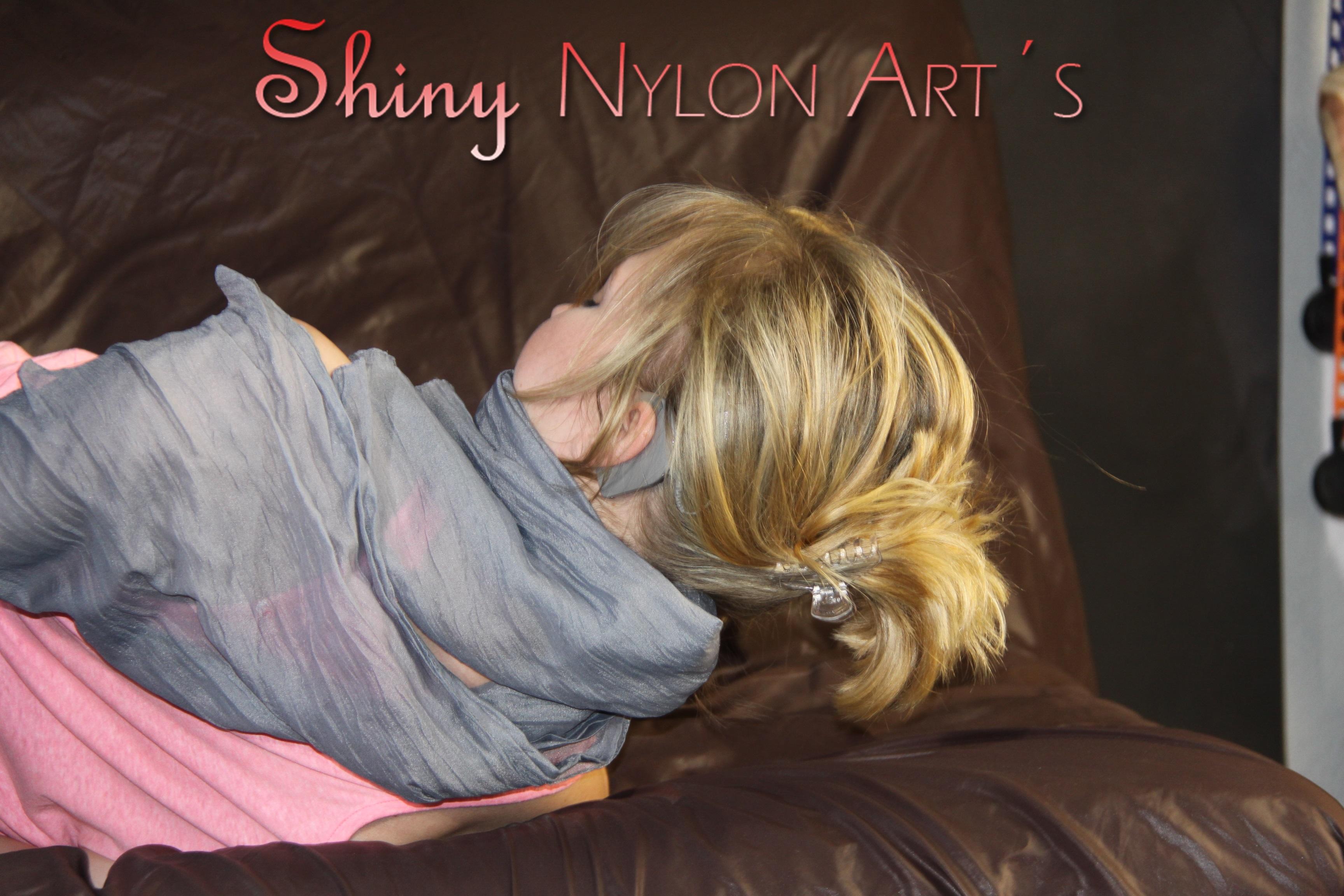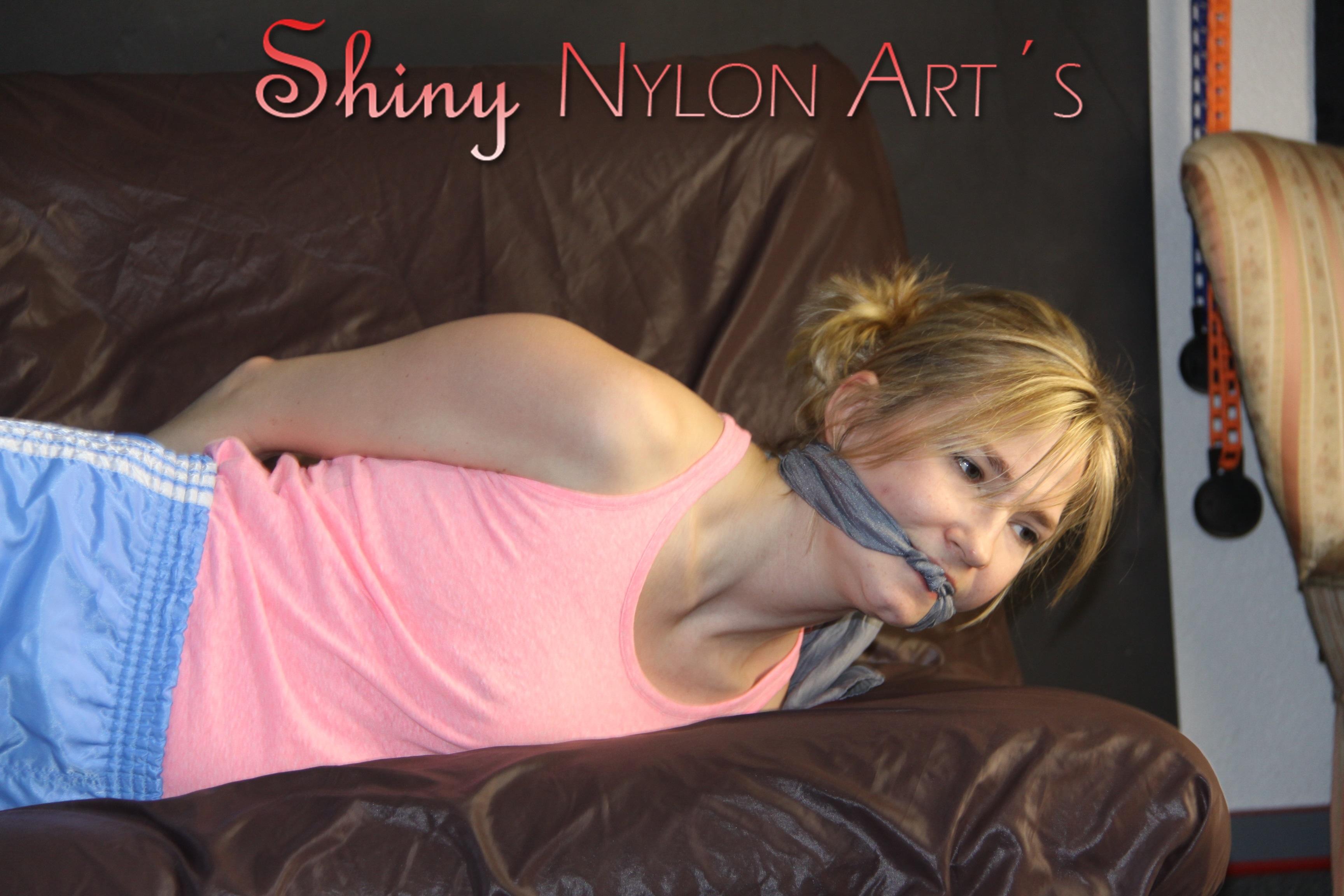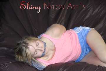 ***NEW MODELL MIA*** wearing a sexy lightblue shiny nylon shorts and a top being tied and gagged with ropes and a clothgag on a bed (Pics)