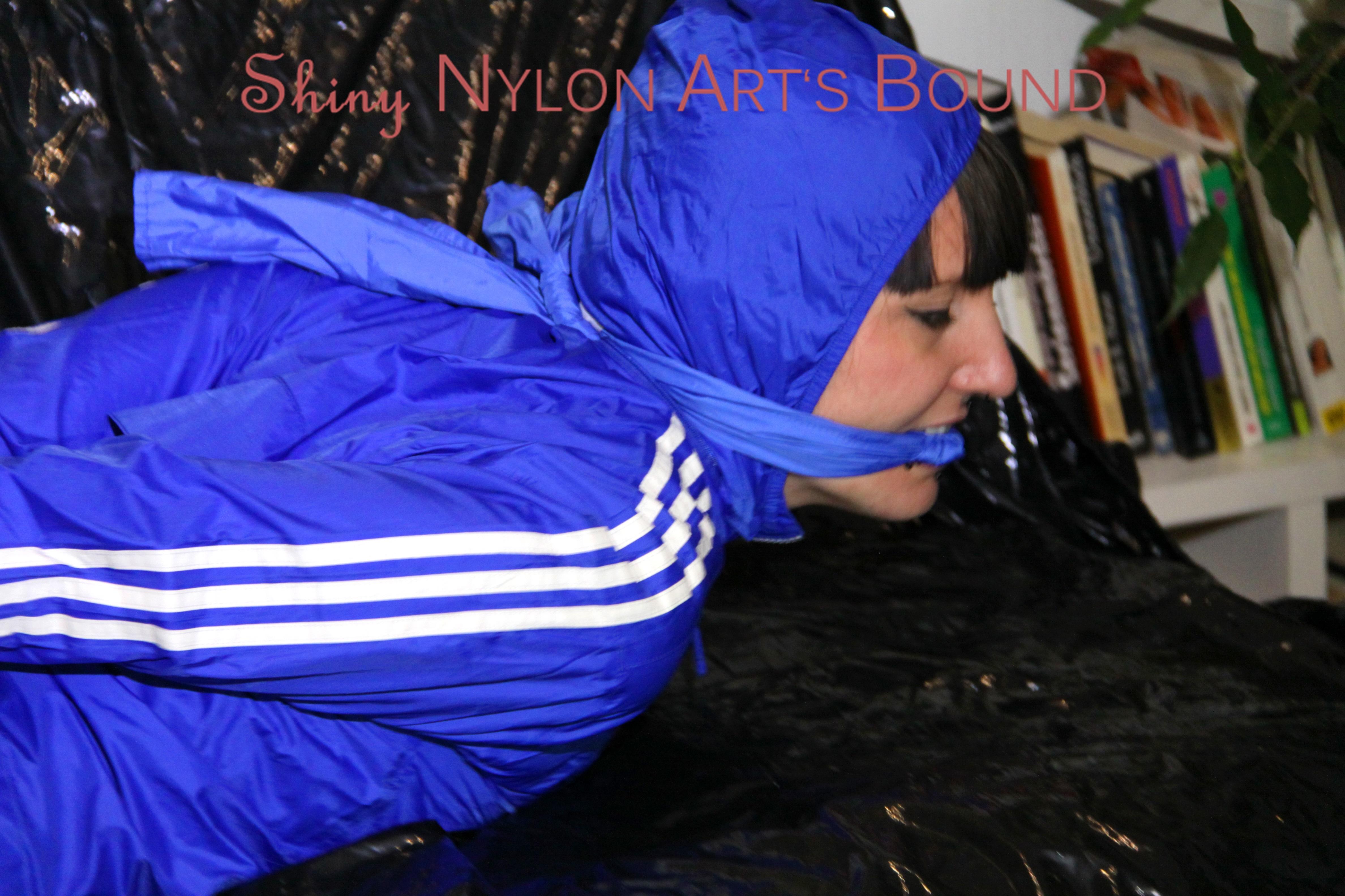Lucy tied and gagged on a red sofa wearing a supersexy blue shiny nylon pants and a blue rain jacket (Video)