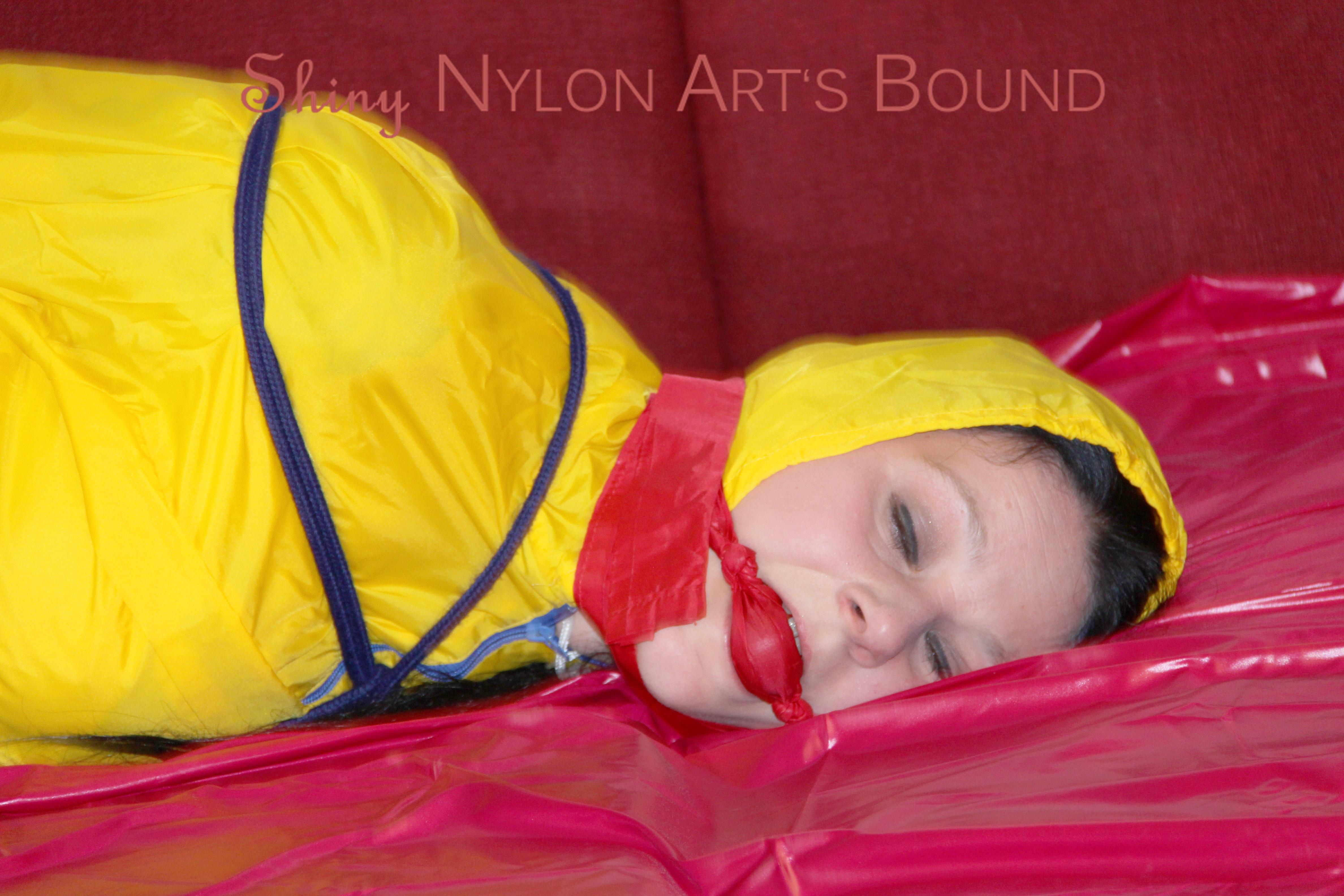 Lucy tied and gagged on a red sofa wearing a sexy red/yellow shiny nylon shorts and a yellow rain jacket (Video)