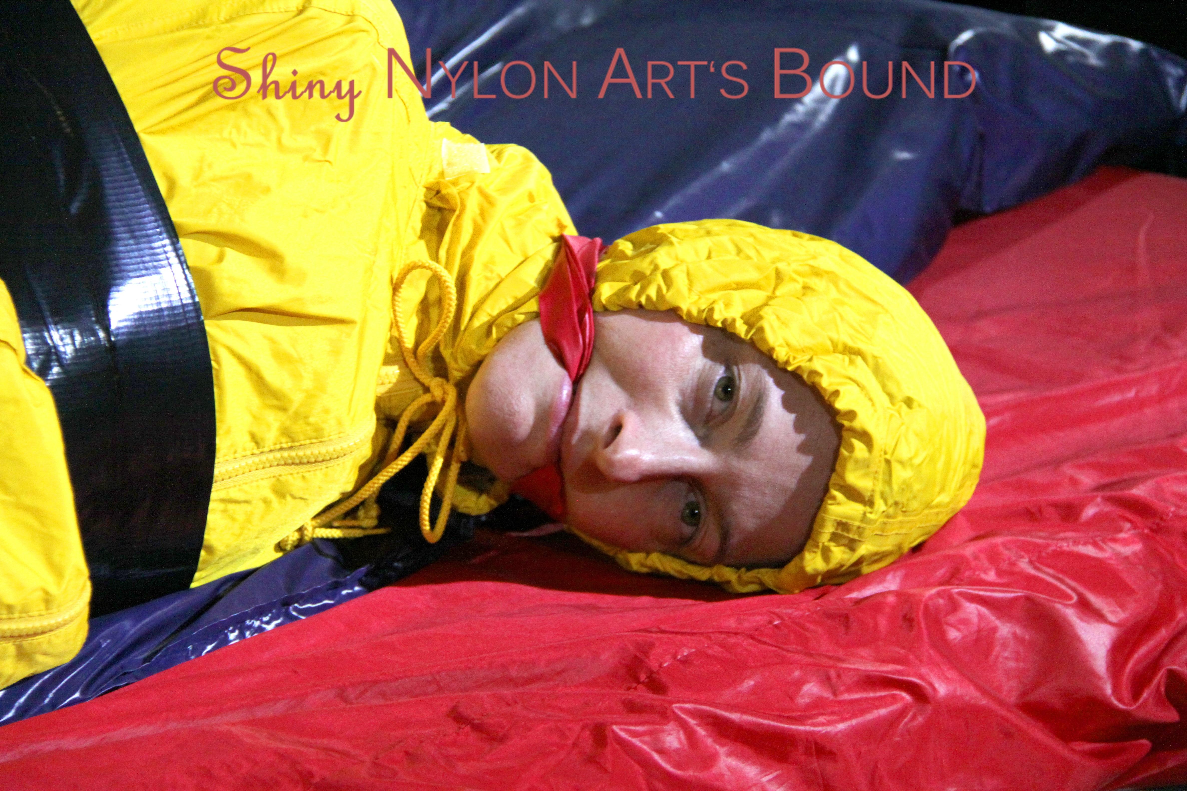 Mara tied and gagged with ropes on bed wearing a lightblue oldschool shiny nylon shorts and an oldschool lightblue/blue rain jacket (Video)