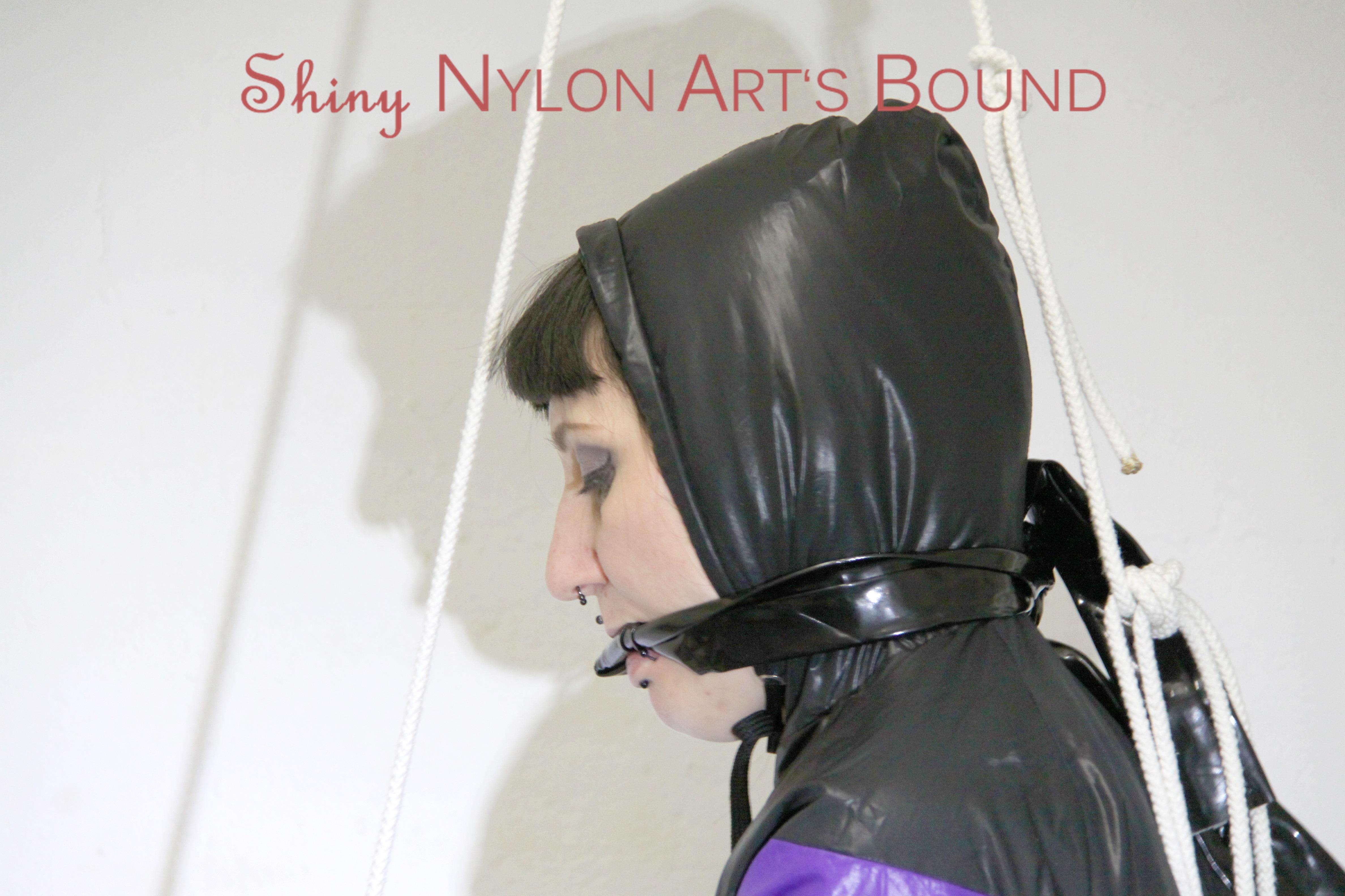 Jill tied, gagged and hooded in bed with a special bar in her back wearing sexy shiny nylon downwear (Video)