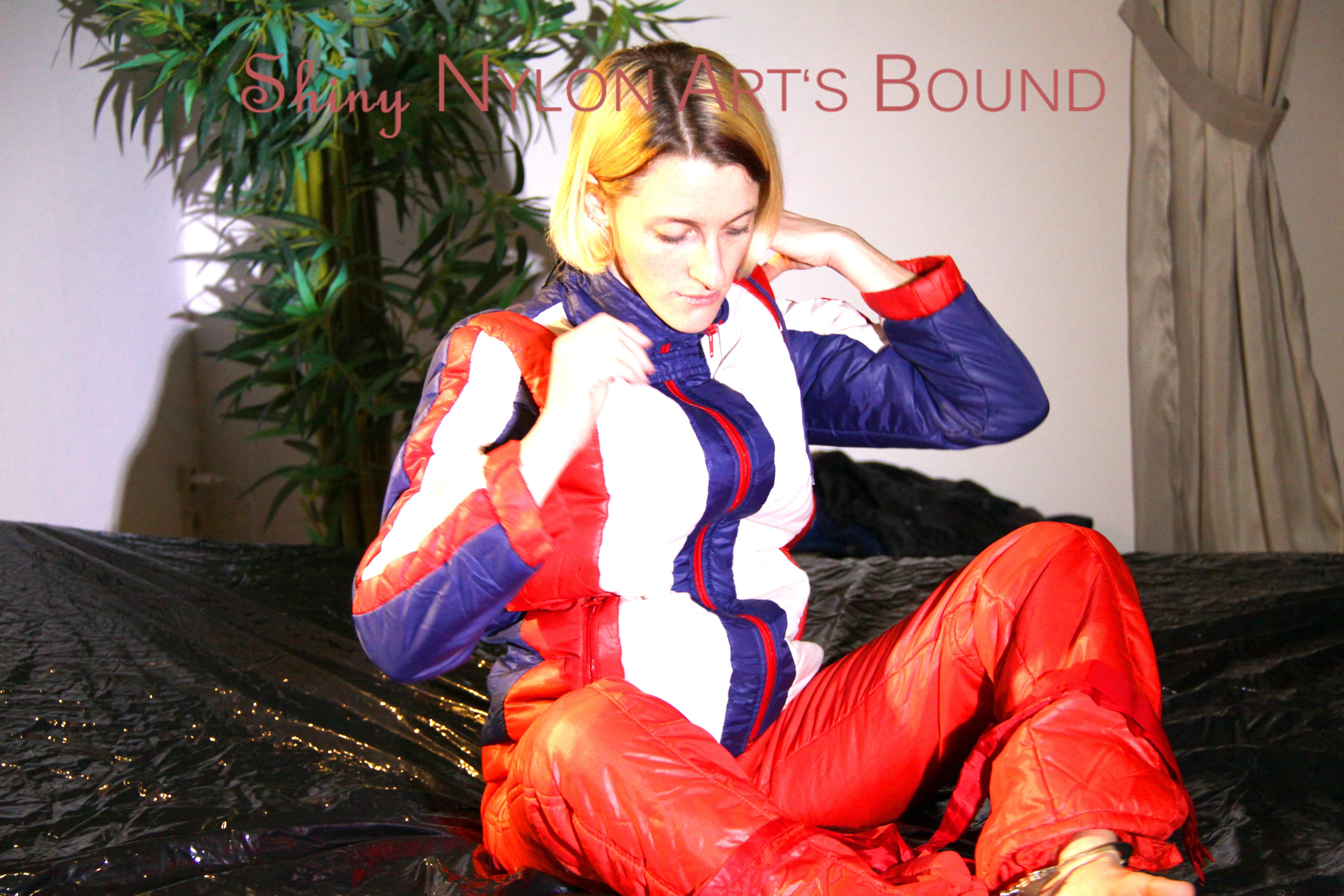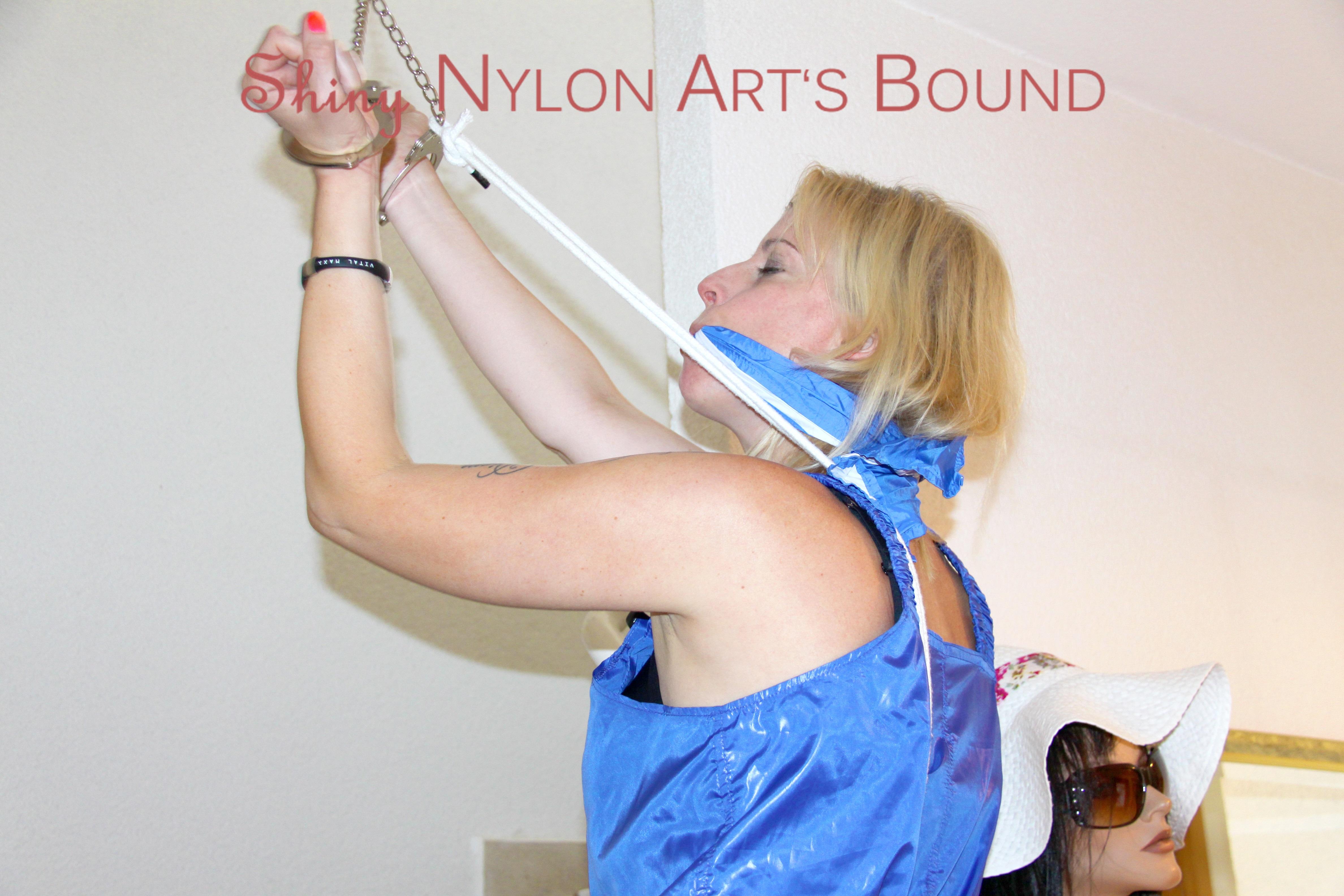 Sonja tied, gagged and hooded with a spreader bar on bed wearing a supersexy pink shiny nylon rainwear (Video)
