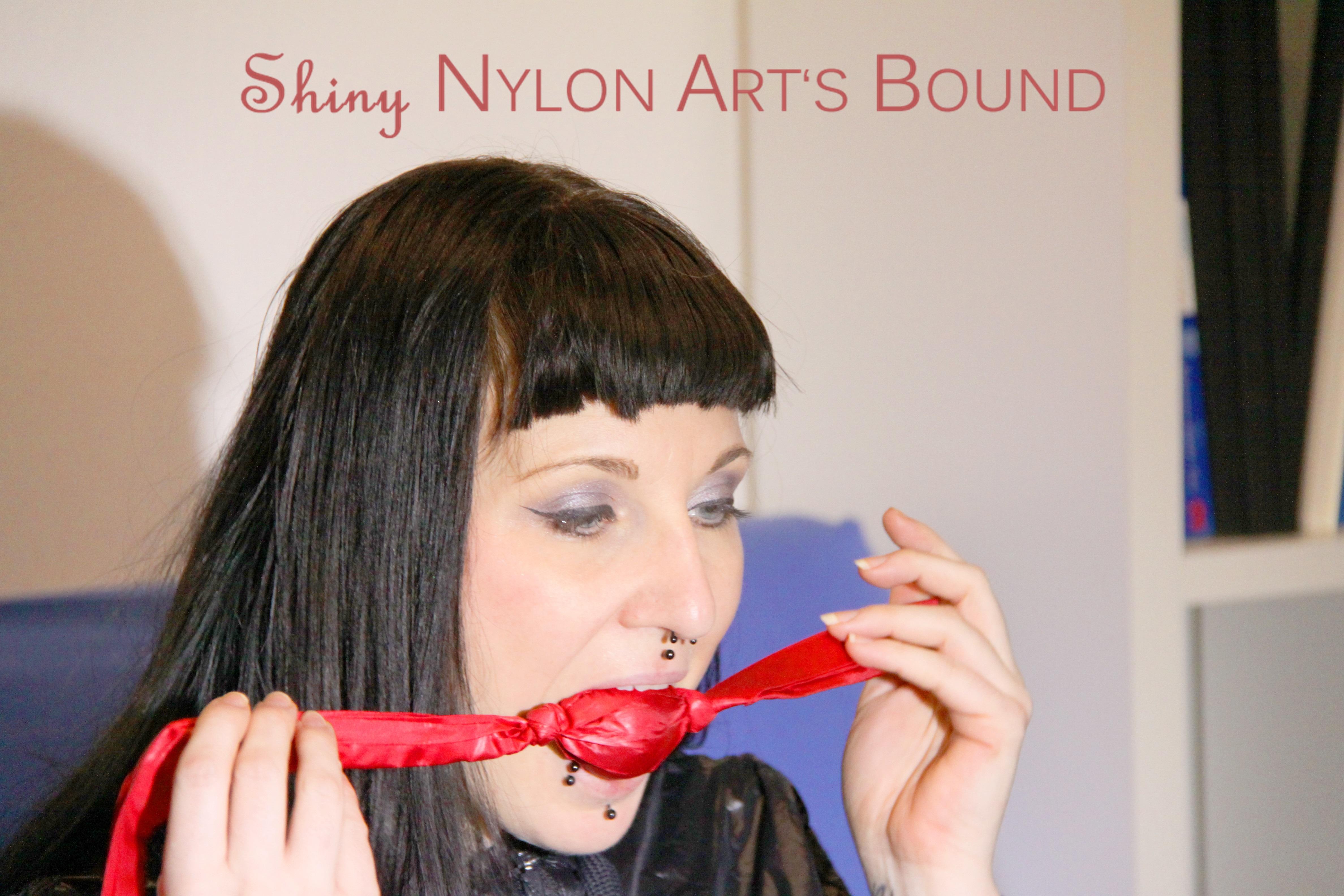 Lucy tied and gagged on bed by using a pillory wearing a sexy selfmade shiny nylon shorts and a rain jacket (Video)