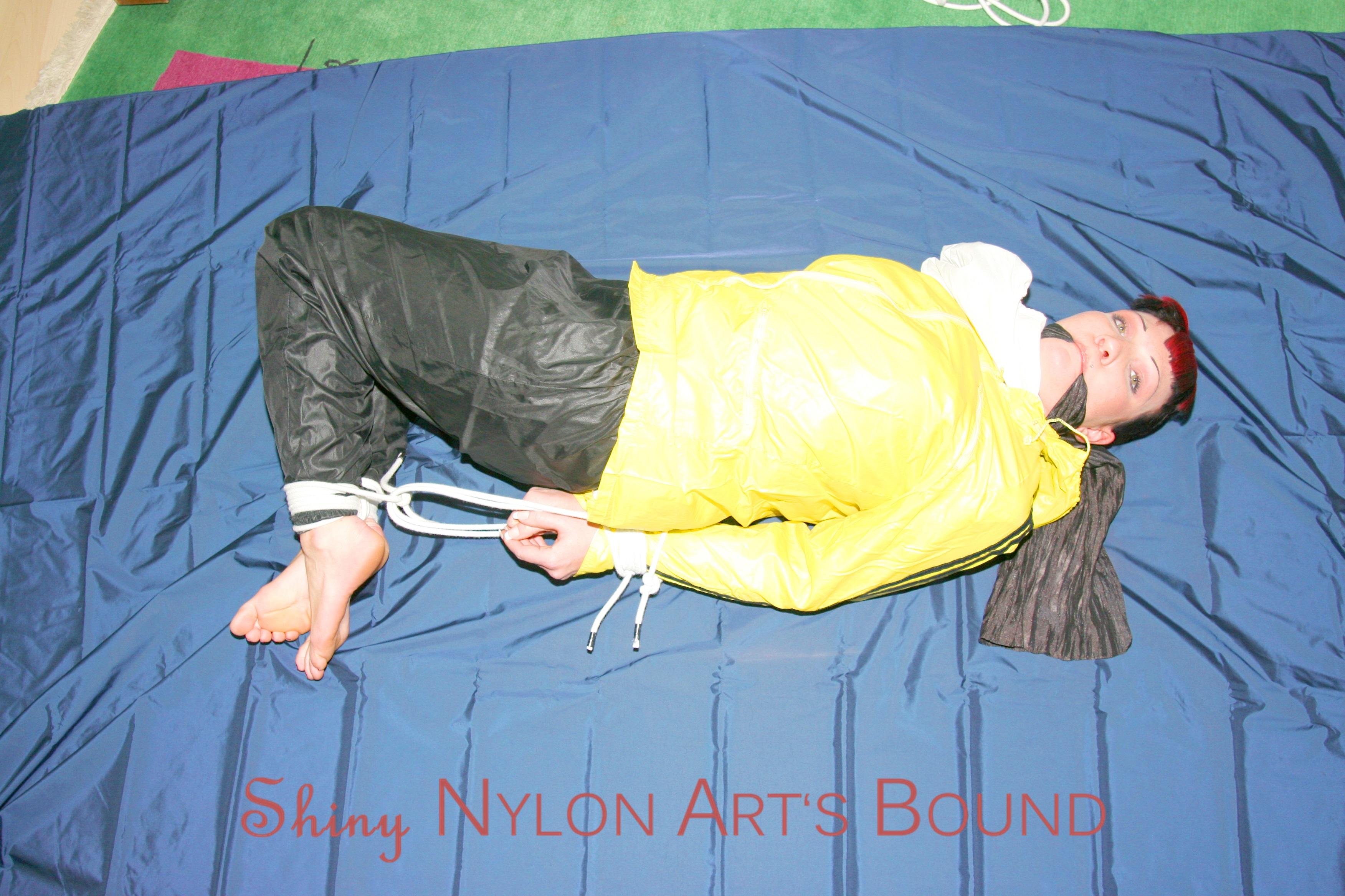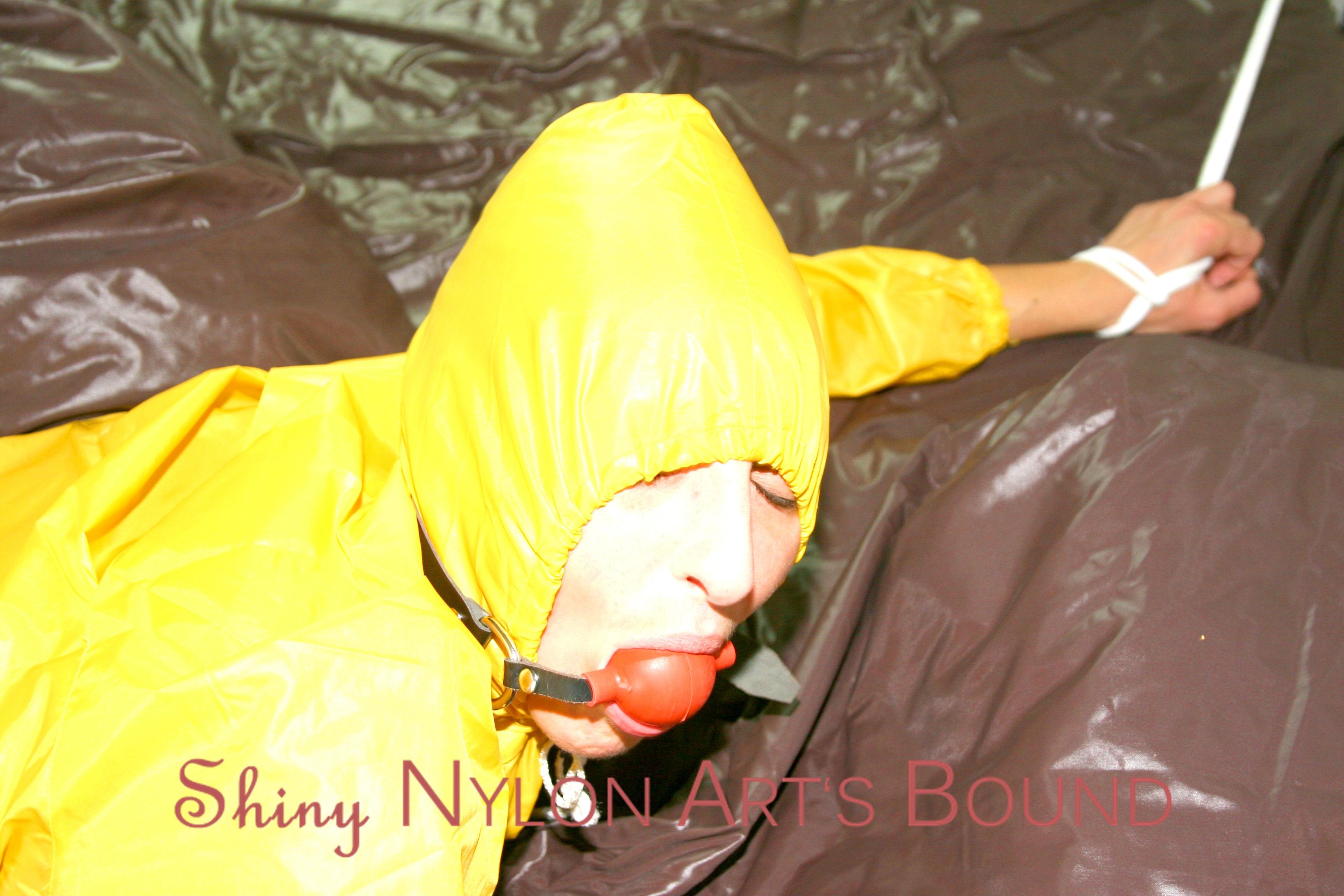 Jill tied and gagged on bed wearing a sexy black shiny nylon rain pants and a yellow and a white shiny nylon rain jacket (Pics)