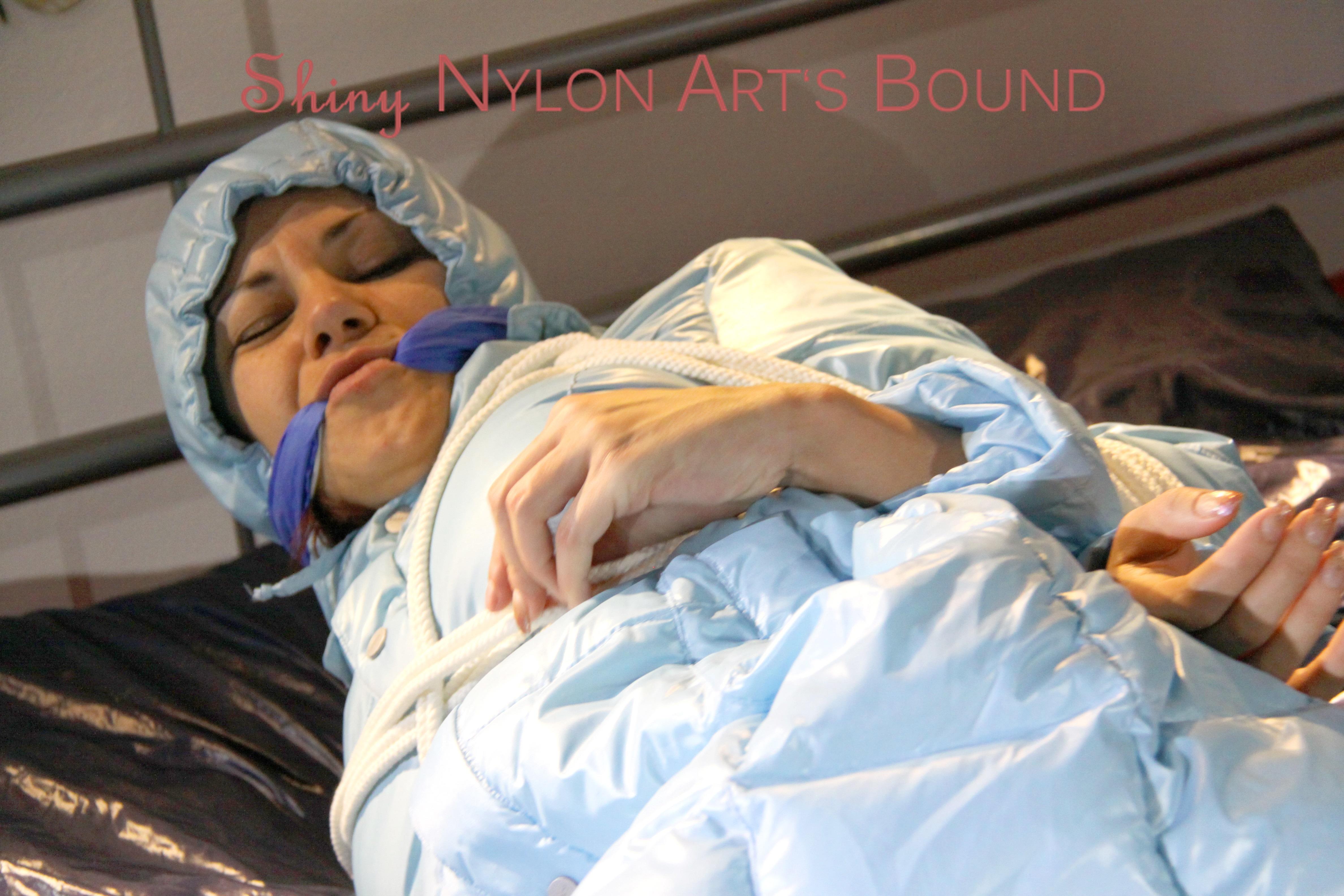 Jill tied and gagged on a chest wearing a sexy lightblue shiny nylon shorts and an oldschool shiny nylon rain jacket (Pics)