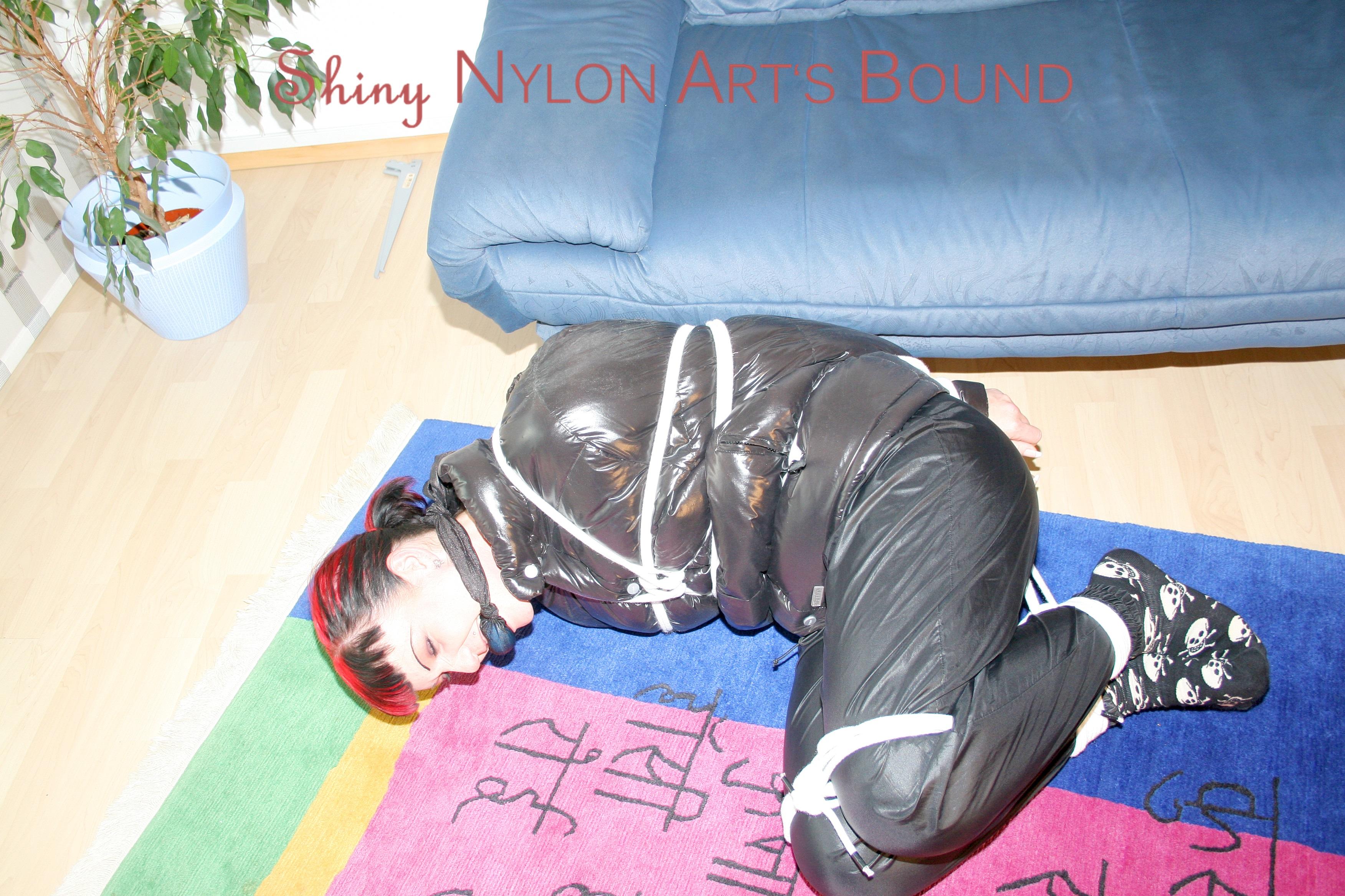 Jill tied, gagged anmd hooded with old handcuffs lying in an old cellar wearing a sexy lightblue skibib (Pics)