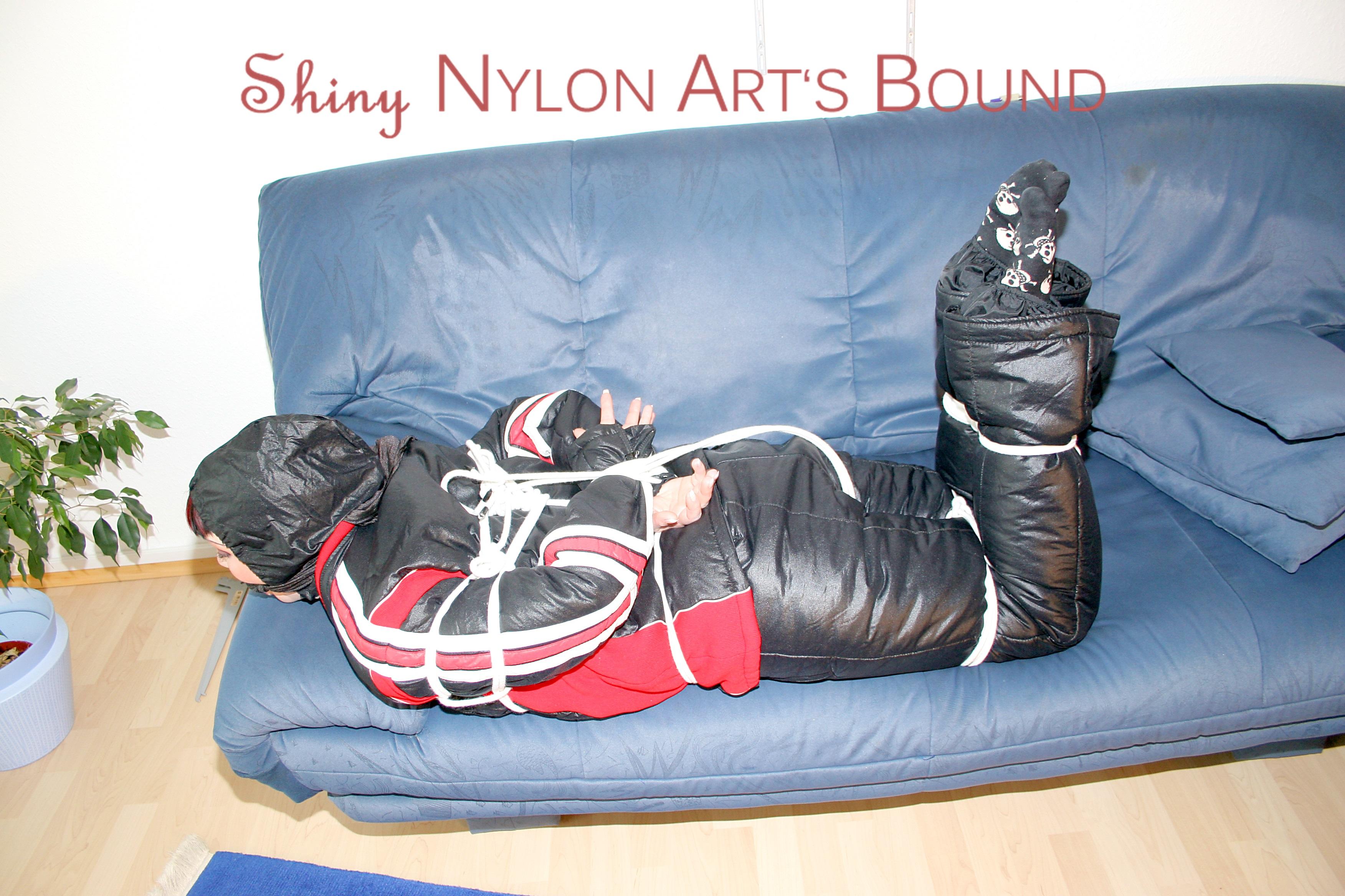 Mara tied and gagged on a white sofa in a reading lounge wearing a sexy purple shorts with shadow stripes and a black rain jacket (Video)
