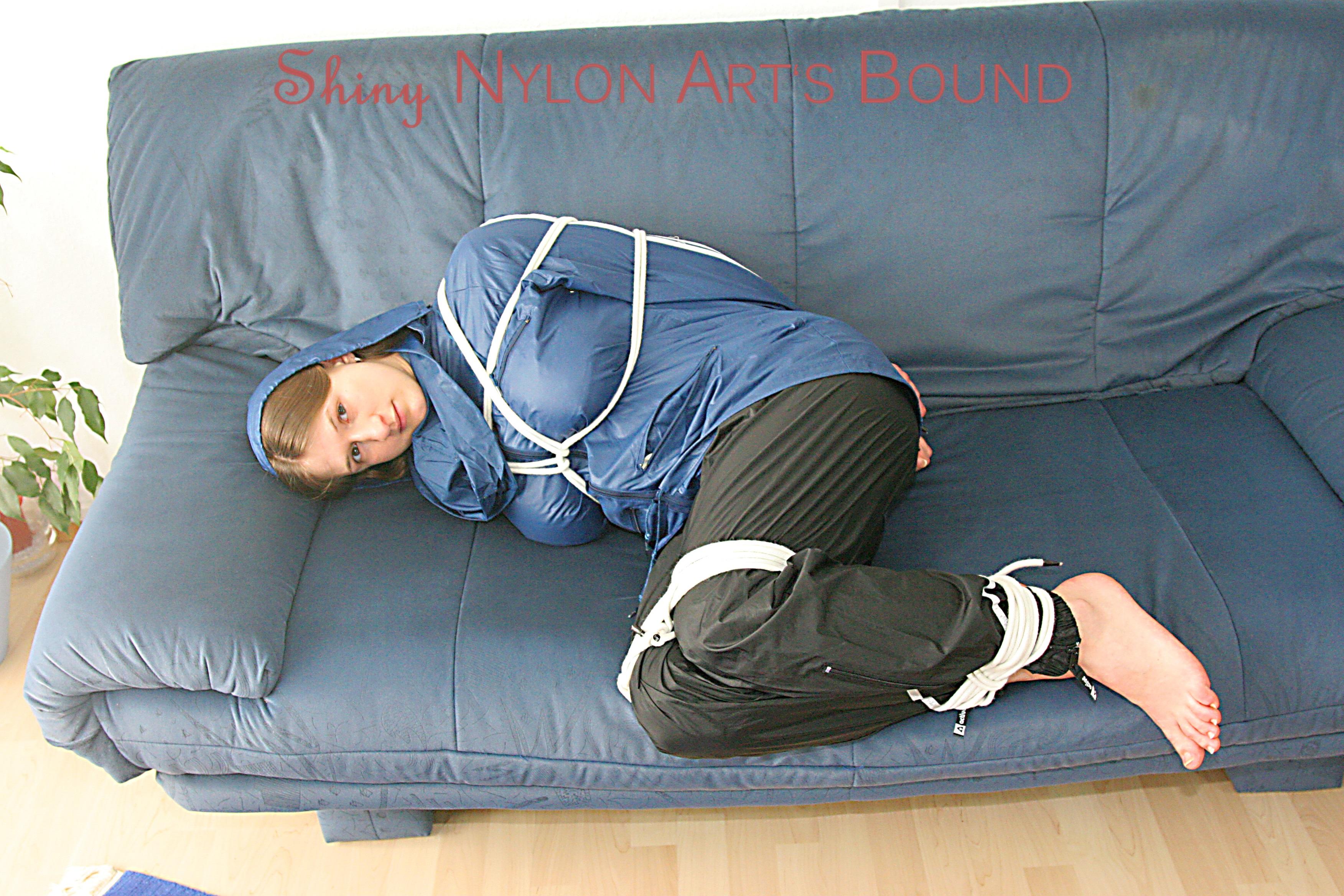 Jill tied and gagged on a sofa wearing a sexy blue shiny nylon shorts and a red/blue oldschool rain jacket (Video)