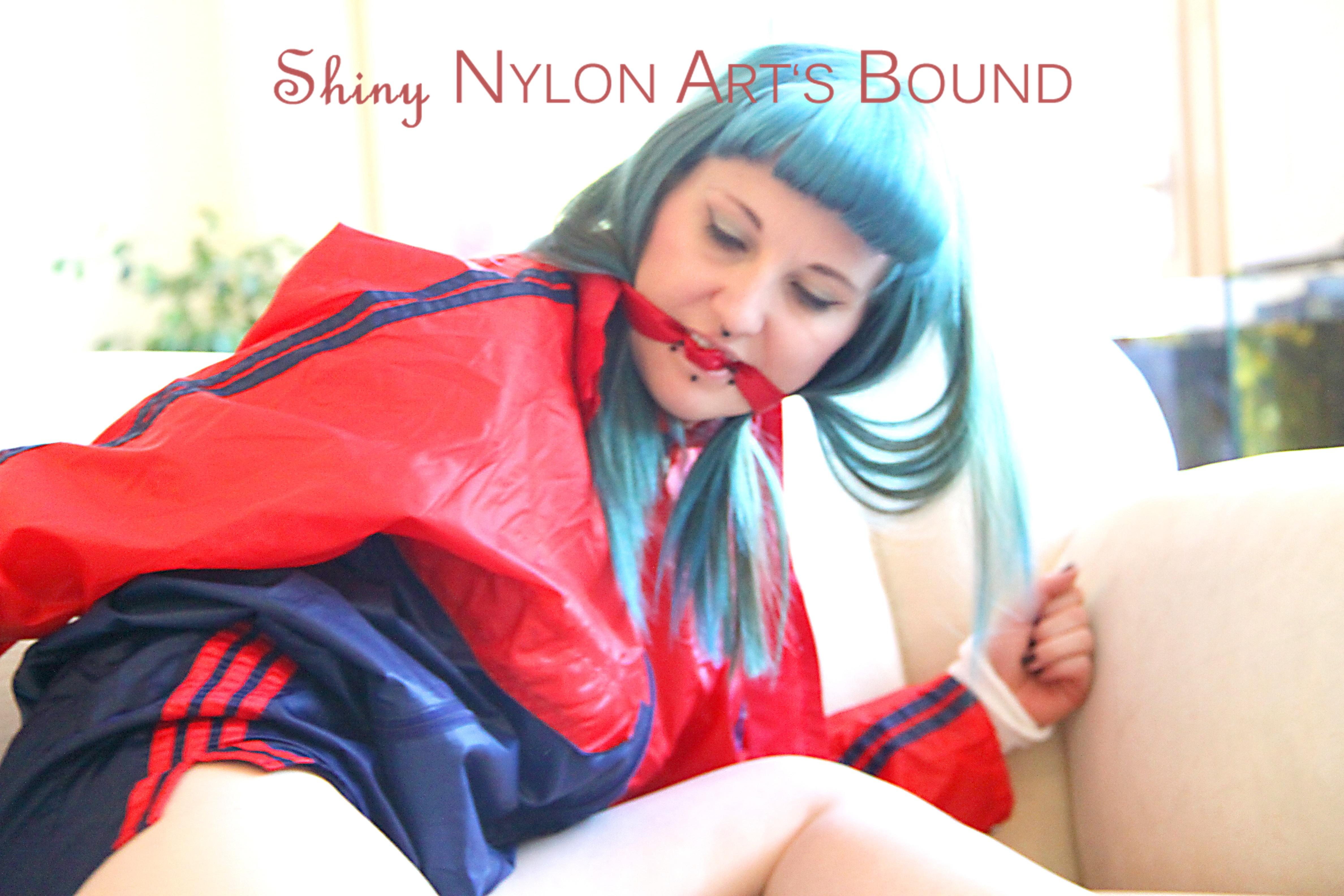 Katharina tied and gagged on a sofa wearing a shiny white nylon shorts and a shiny red/blue oldschool rain jacket (Video)