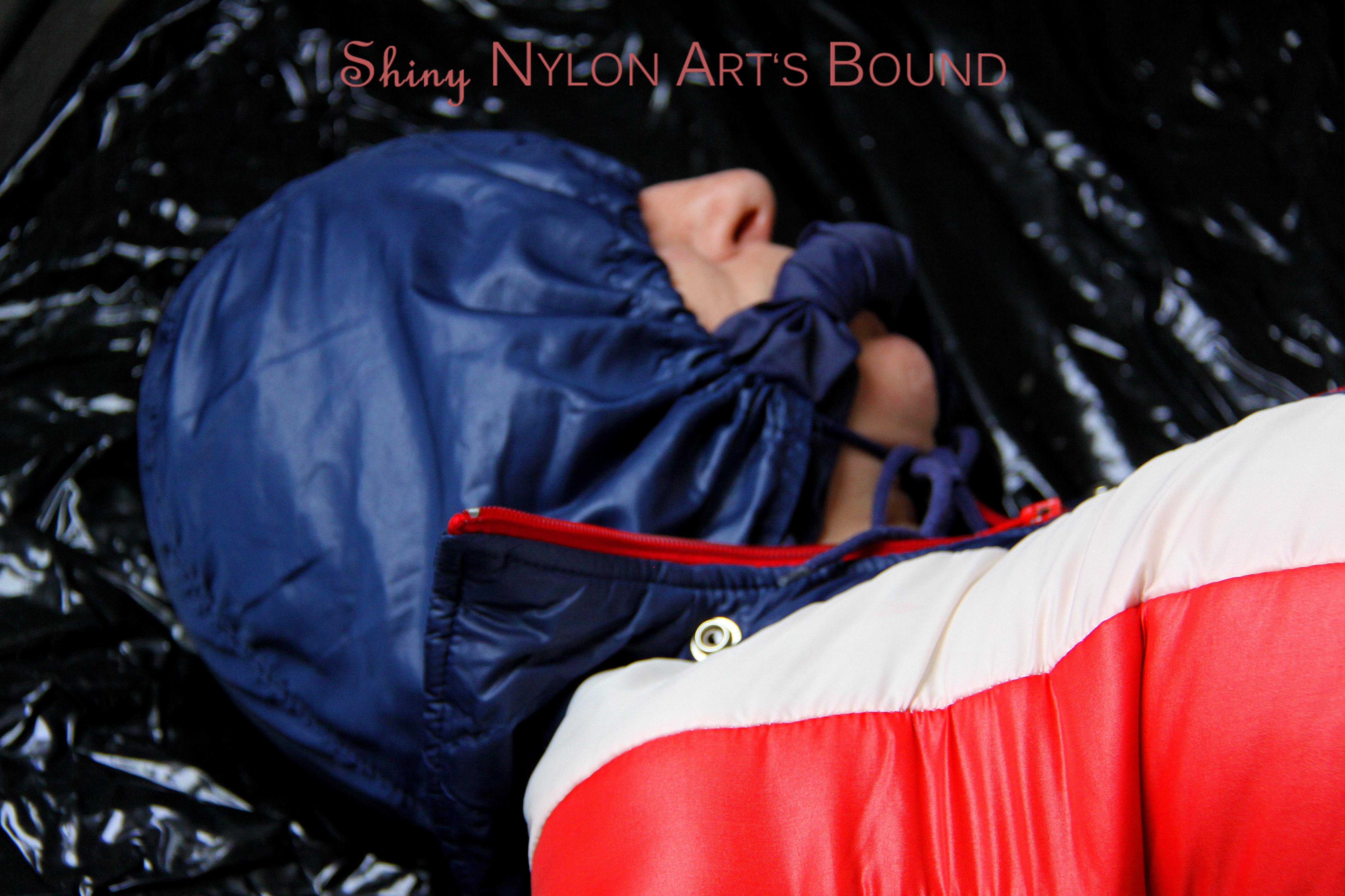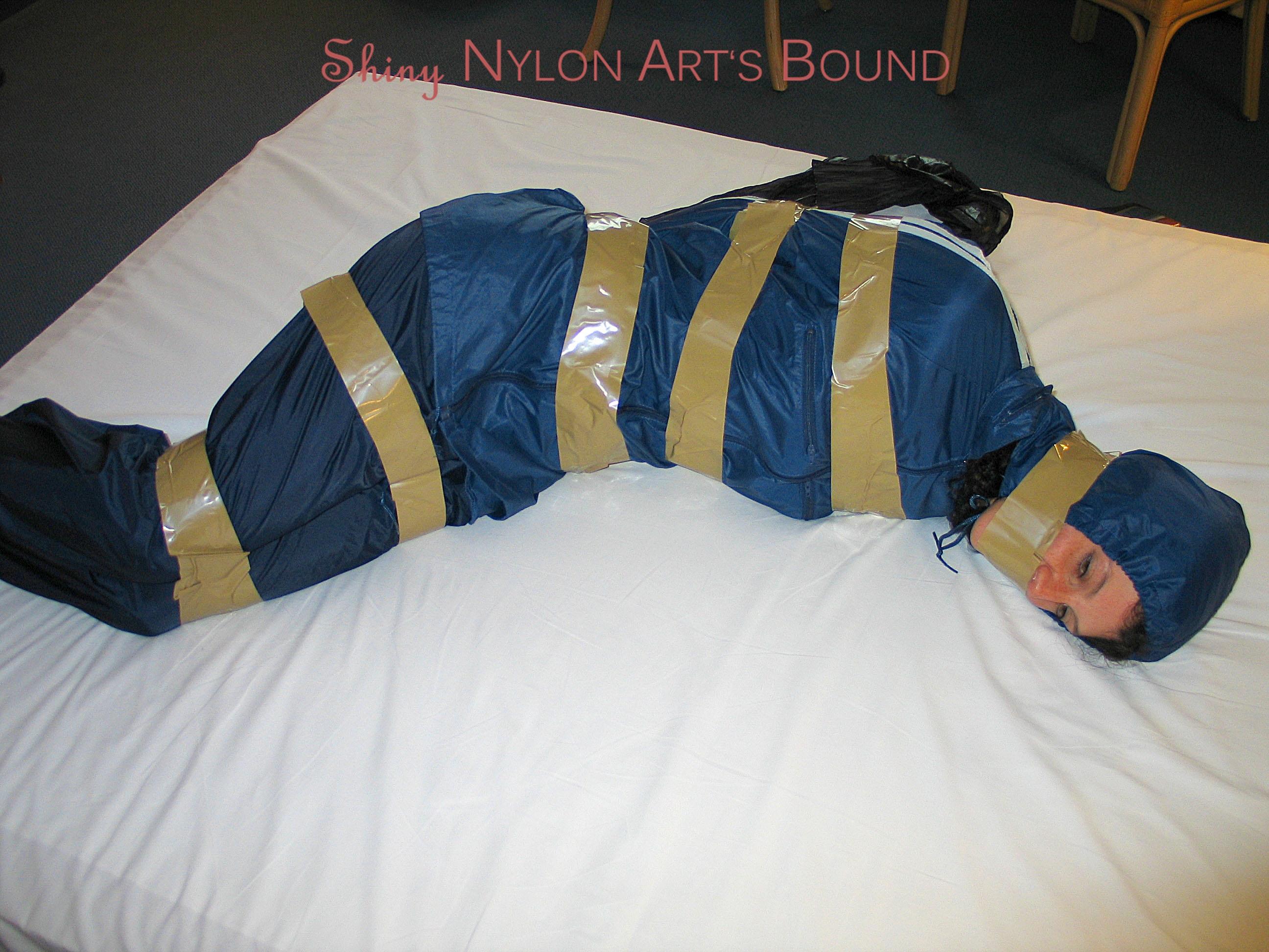 Katharina tied and gagged with a blue ball in a dark blue shiny nylon shorts with white stripes and a dark blue rain jacket 0
