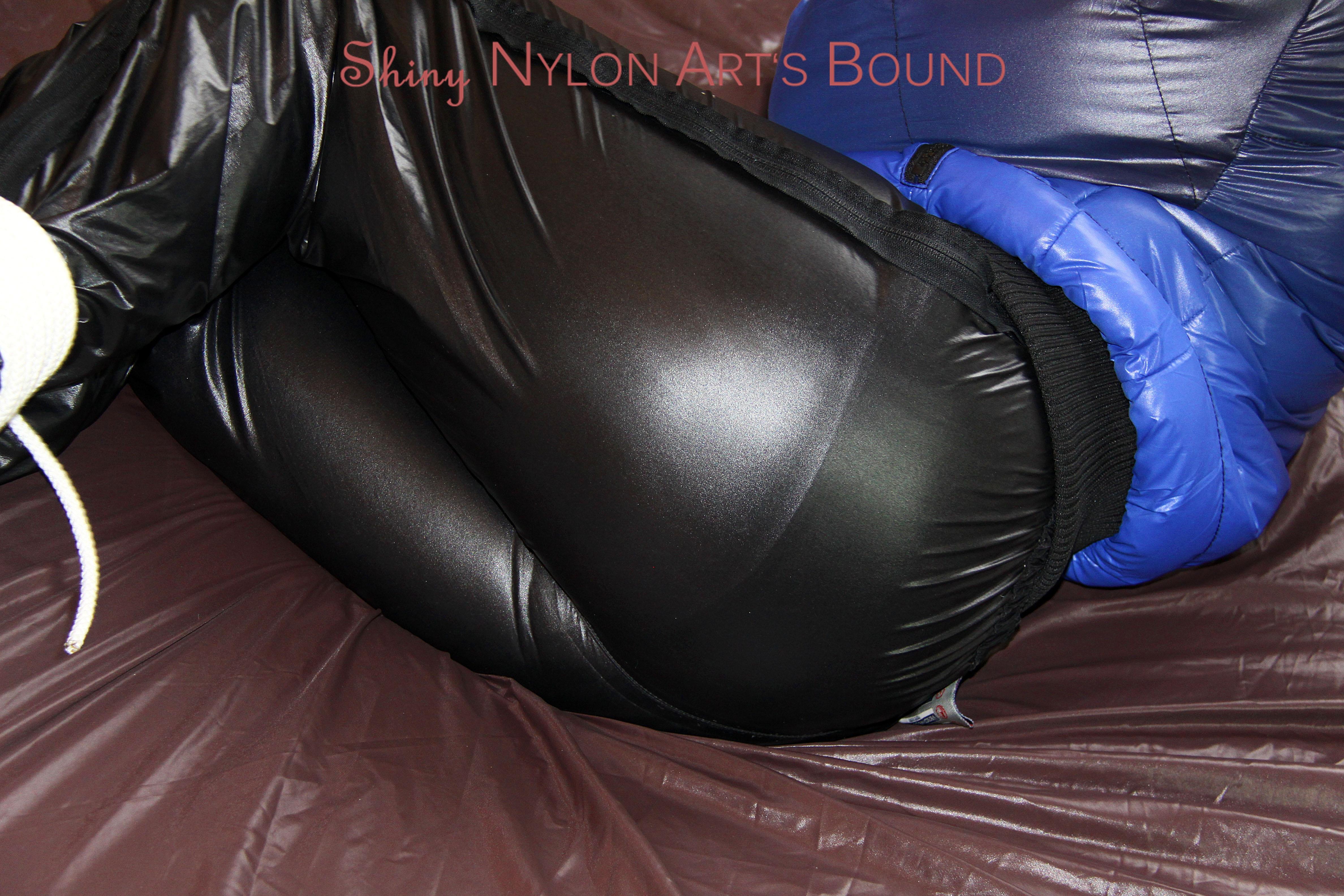 03:40 Min. video with Jill in a green shiny nylon short and a black rain jacket tied and gagged in her bed