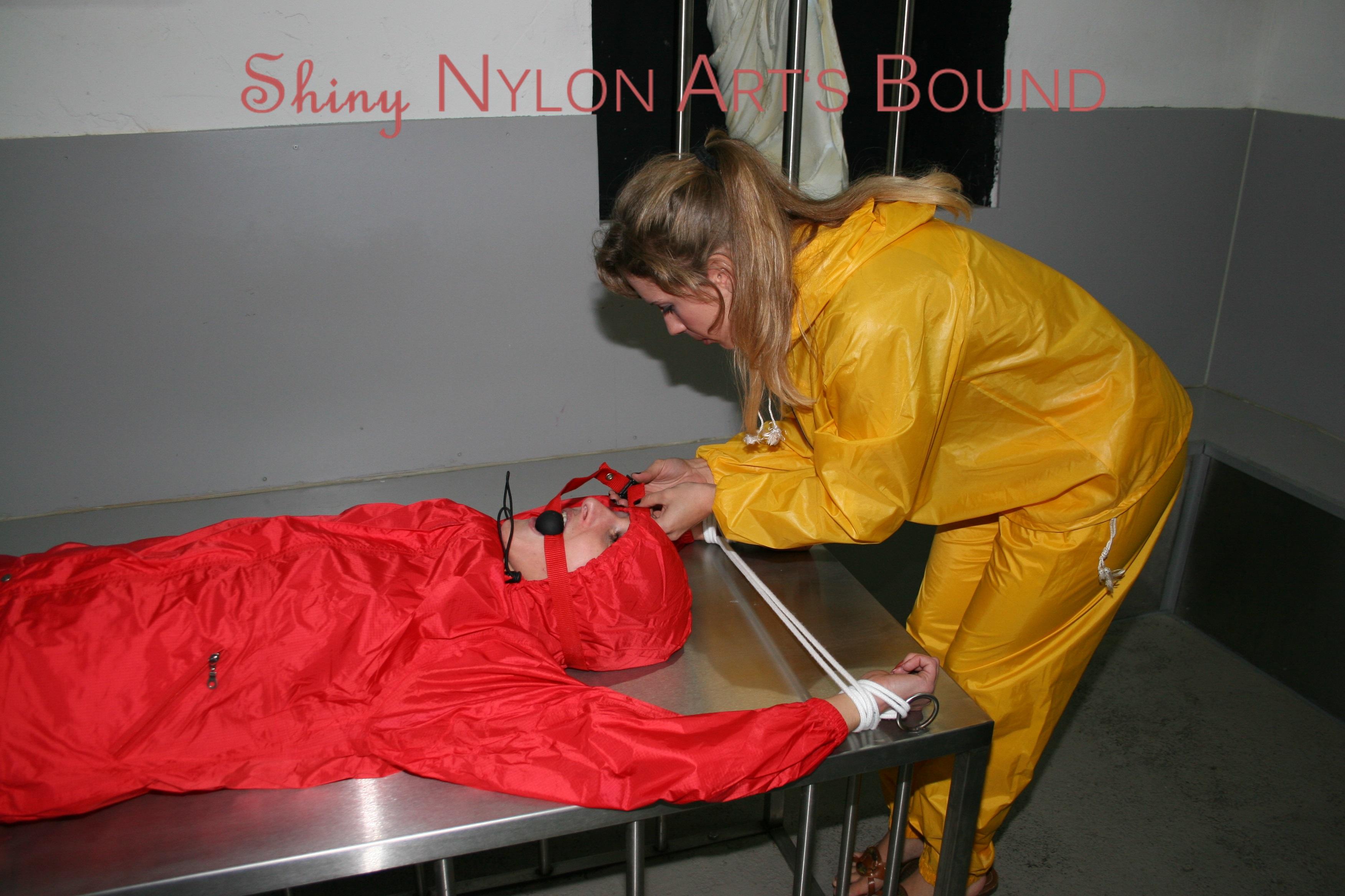 Watching sexy Pia wearing a sexy blue oldschool shiny nylon shorts and a rain jacket being tied and gagged on hands and feet on the ceiling lying on the floor (Pics)