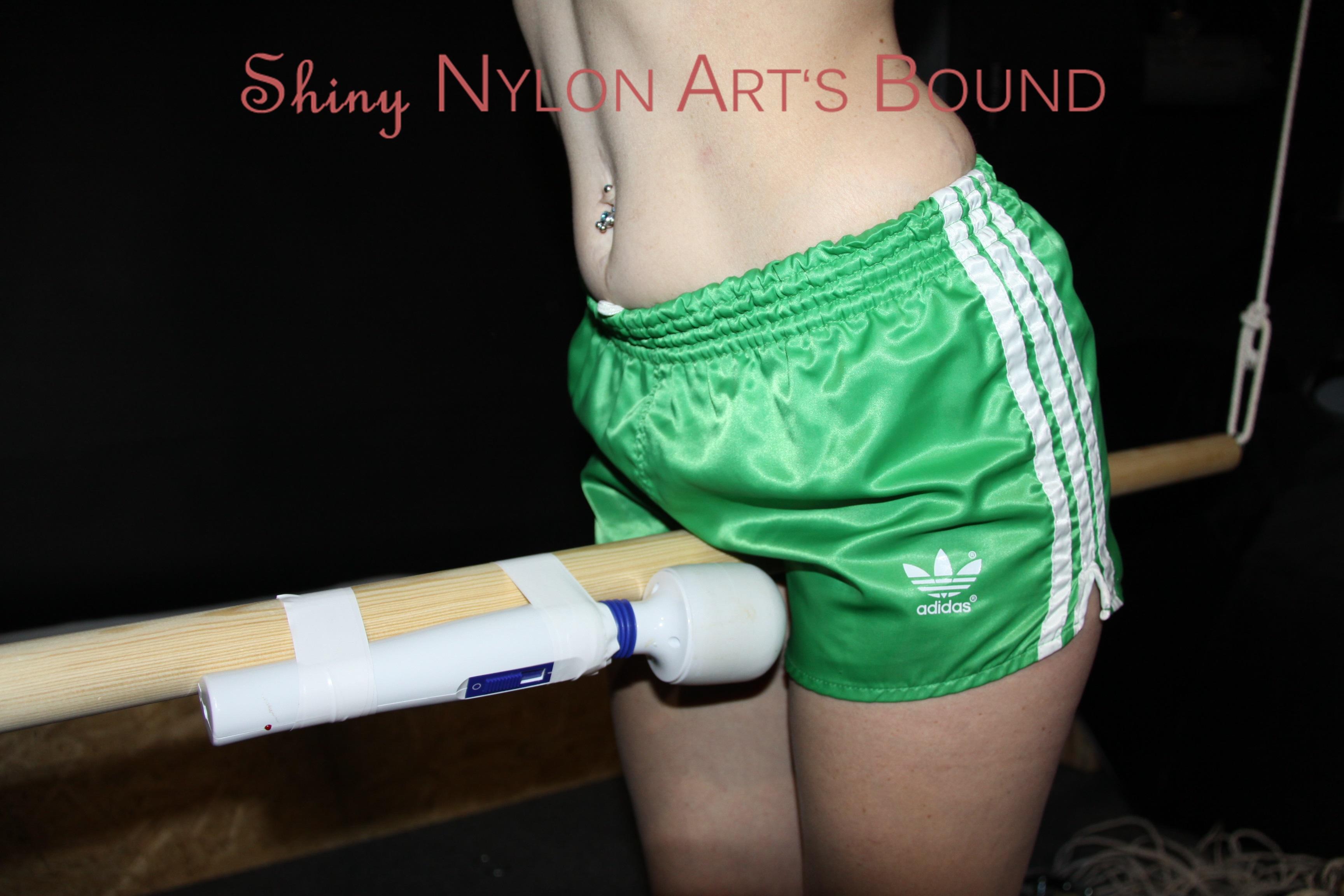 Sonja being tied and gagged overhead on a bar with a massager wearing a sexy green shiny nylon shorts and a black rain jacket (Pics)