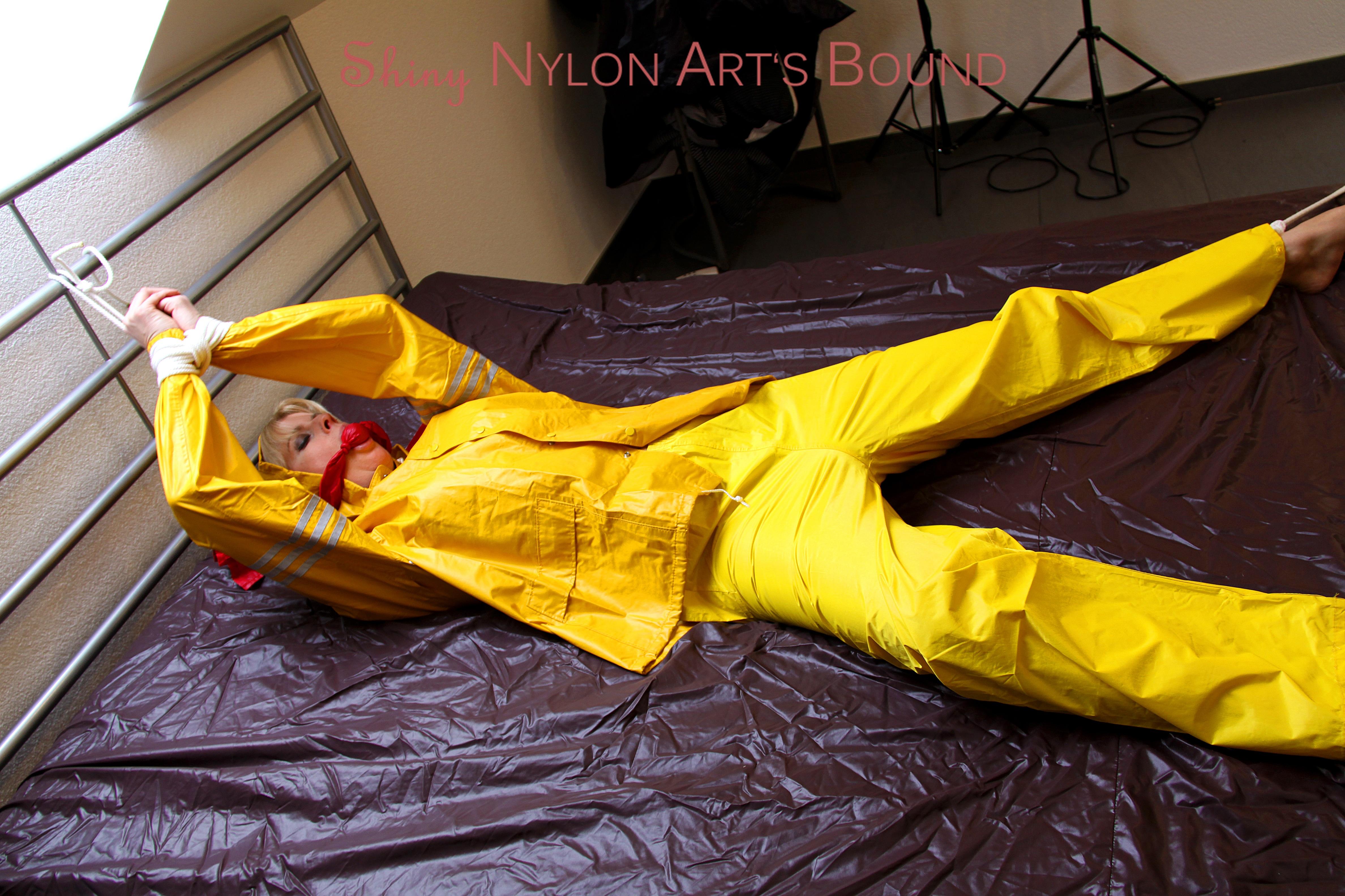 Pia tied and gagged in bed in a yellow rainsuit and a red gag