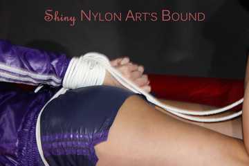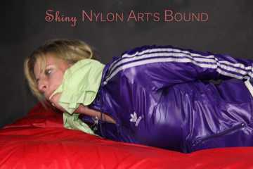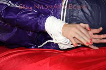 Sexy Pia being tied and gagged with ropes and a clothgag on a bed wearing a sexy darkblue shiny nylon shorts and a sexy blue/purple rain jacket (Pics)