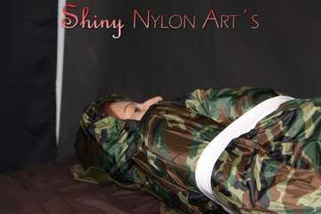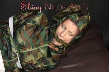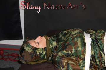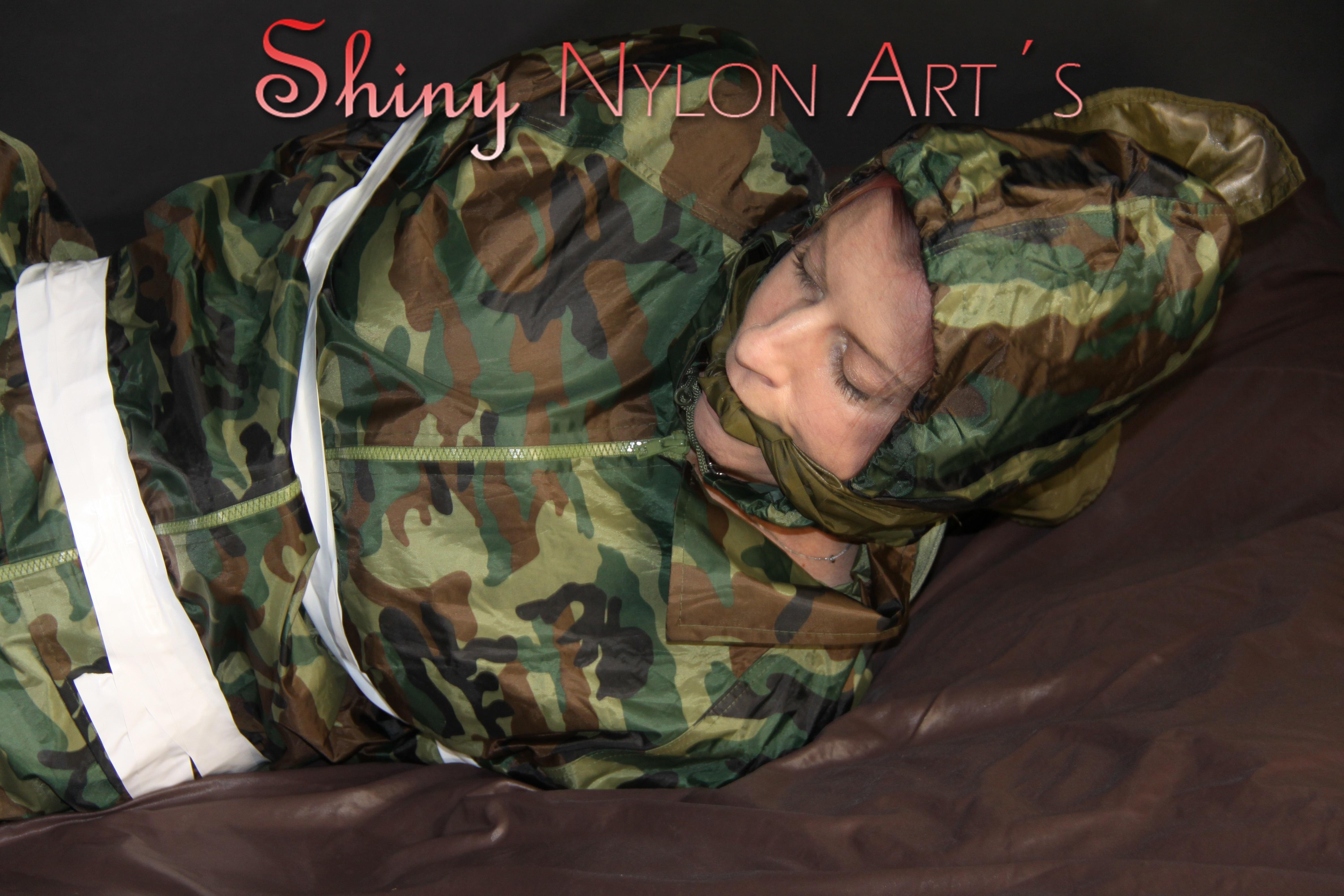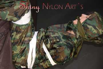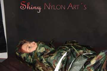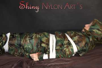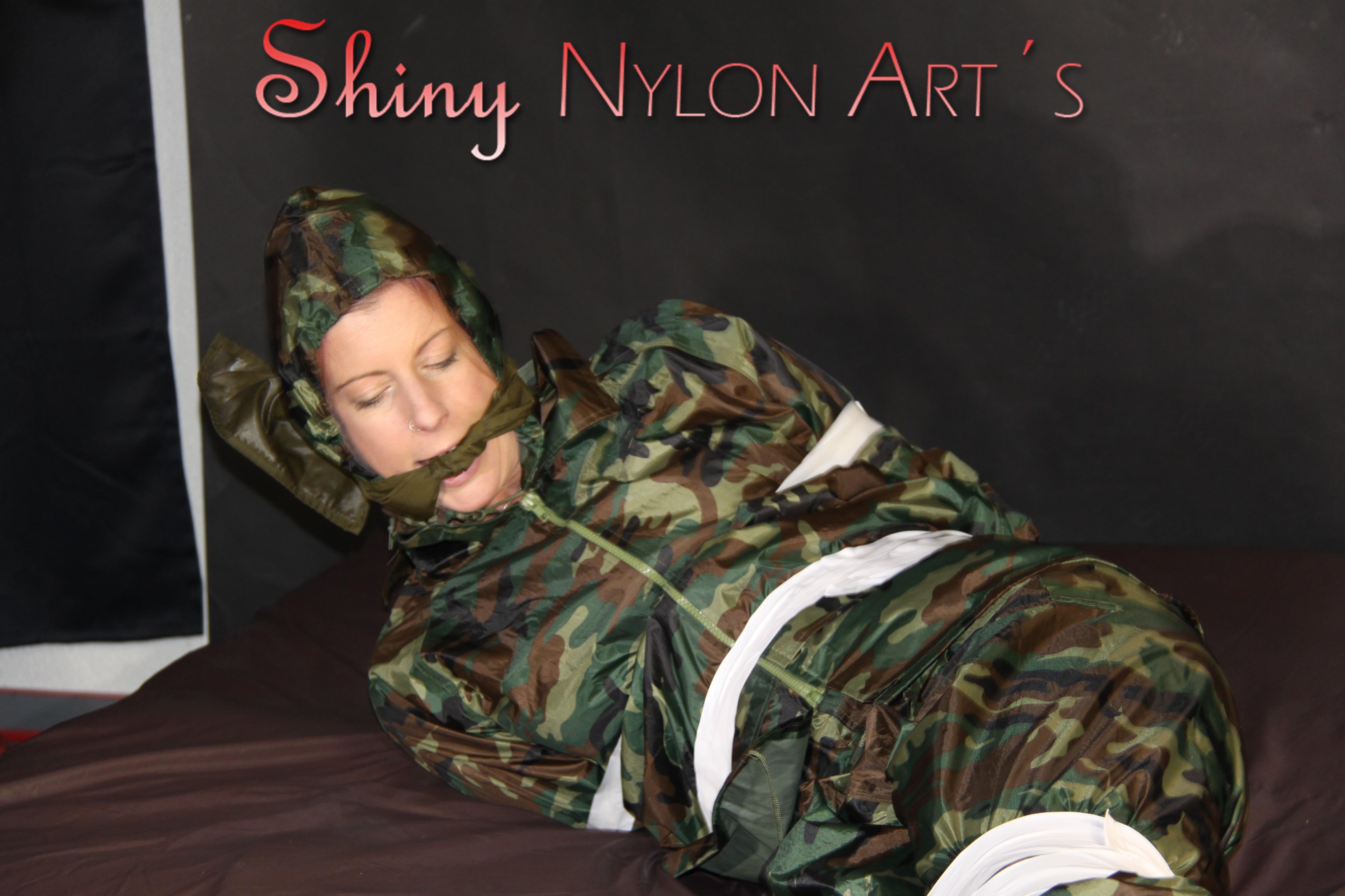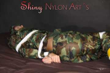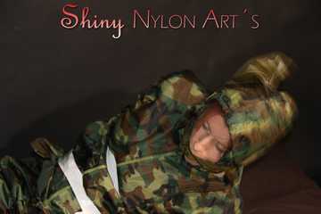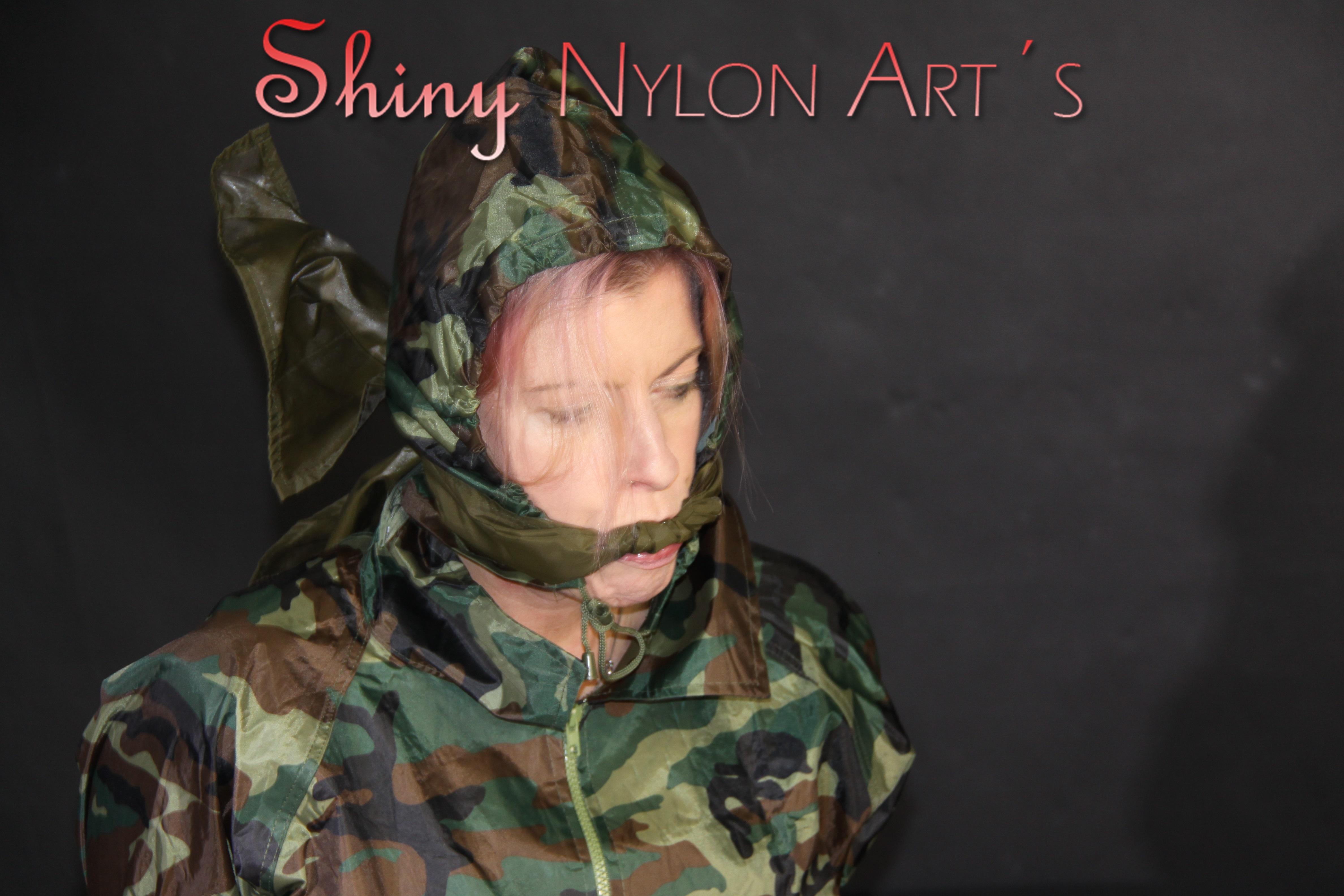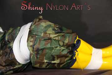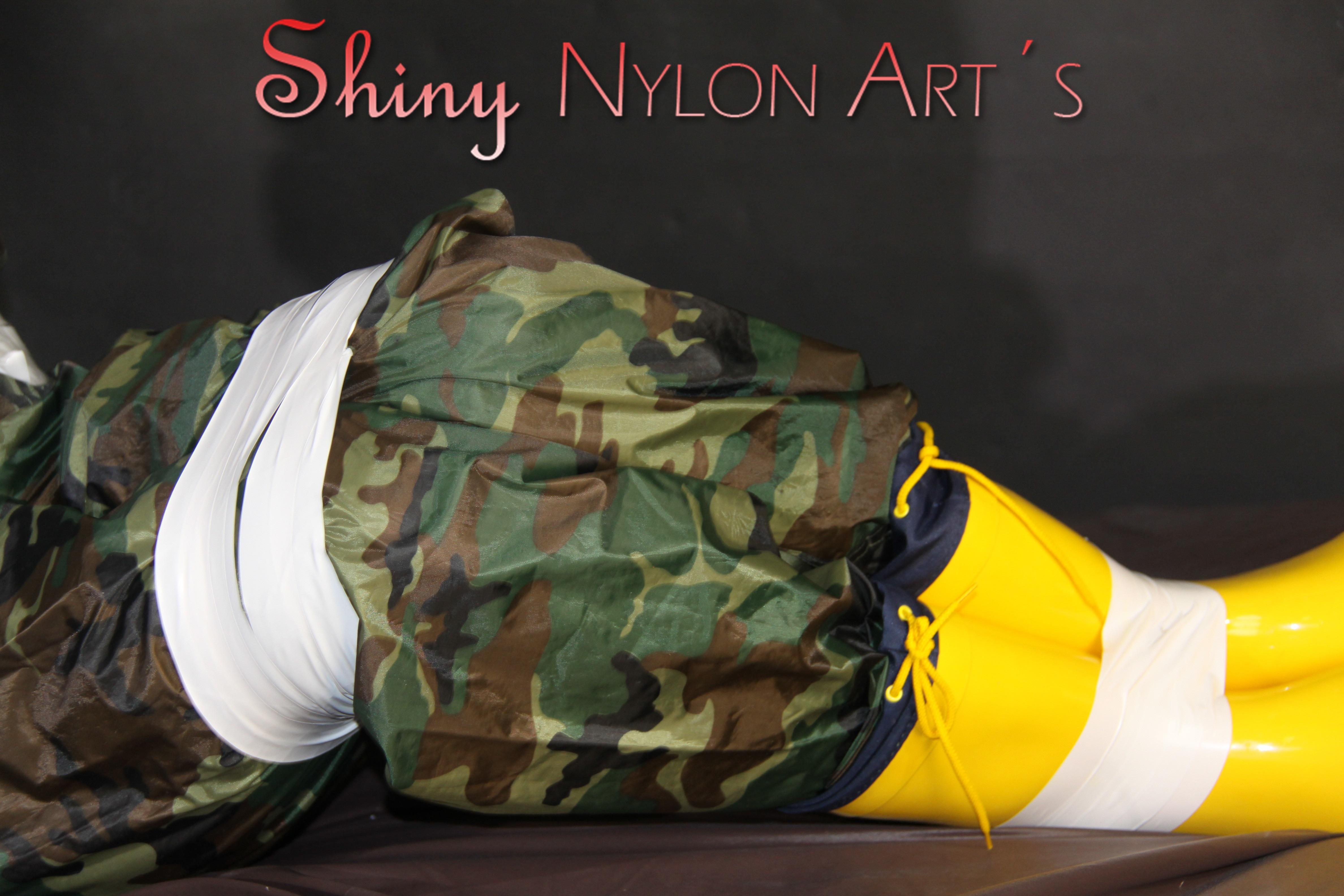 Sexy PIA being tied and gagged with tape and a clothgag on the sofa wearing a camouflage rainsuit and yellow rubber boots (Pics)