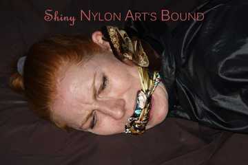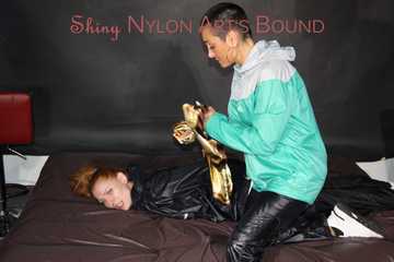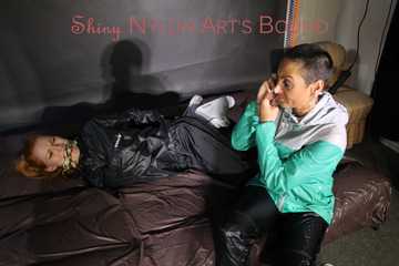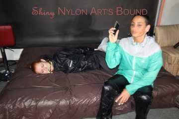 SEXY RONJA being overhelmed, tied and gagged from Stella with ropes and a ballgag on a sofa both wearing shiny nylon rainwear (Pics) Part 2
