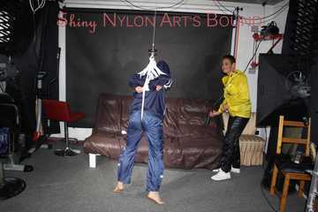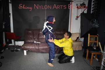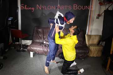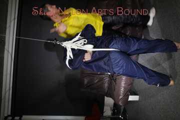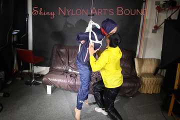 SEXY RONJA being tied and gagged with ropes overhead and a ballgag from SEXY STELLA both wearing sexy shiny nylon rainwear (Pics)