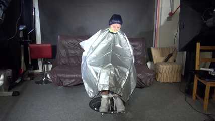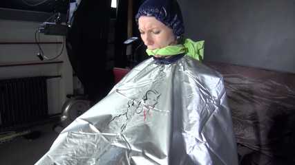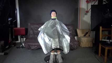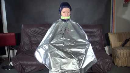 Sexy Ronja being tied, gagged and hooded on a chair with a clothgag wearing sexy blue shiny nylon rainwear (Video)