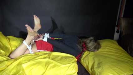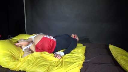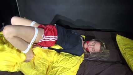 Sexy Sandra being tied and gagged feet on the hands with ropes and a clothgag wearing a sexy red shiny nylon shorts and a shirt (Video)