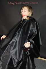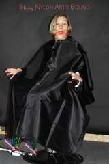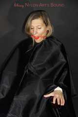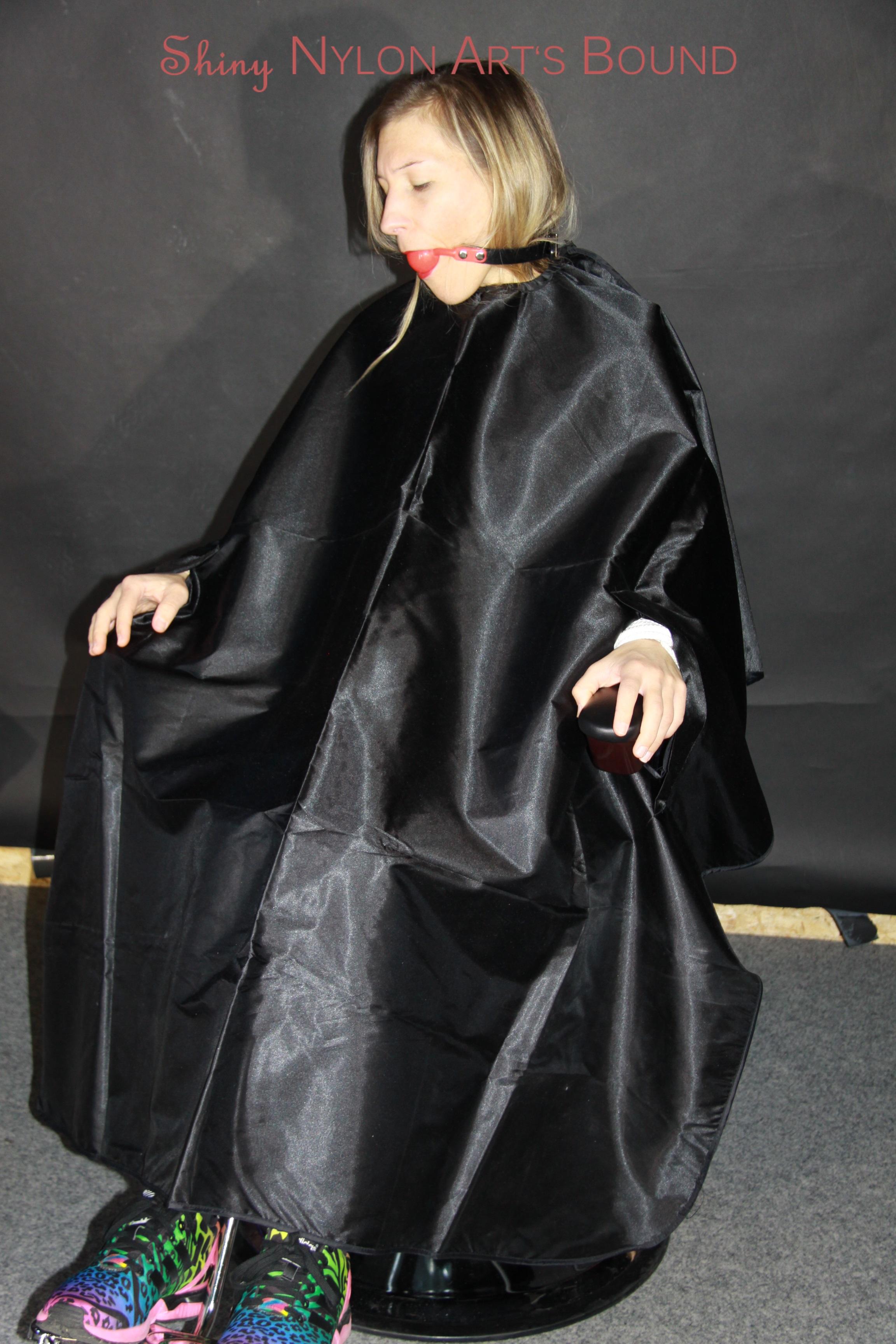 Sexy Sandra being tied and gagged on a haircutter`s chair with ropes and a ball gag wearing a supershiny sexy black rain bib overall (Pics)