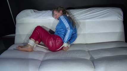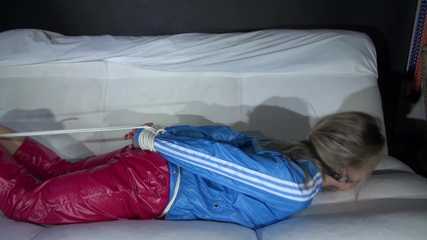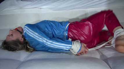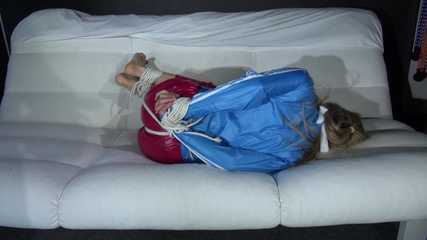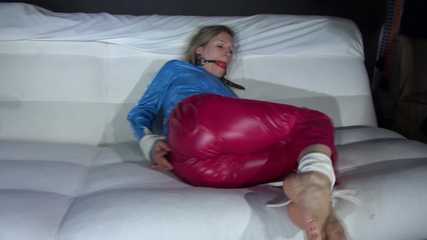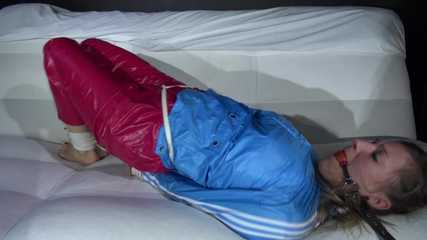Sexy Sandra being tied and gagged on a sofa with ropes and a ball gag wearing a supershiny sexy red rain pants and a lightblue rain jacket (Video)