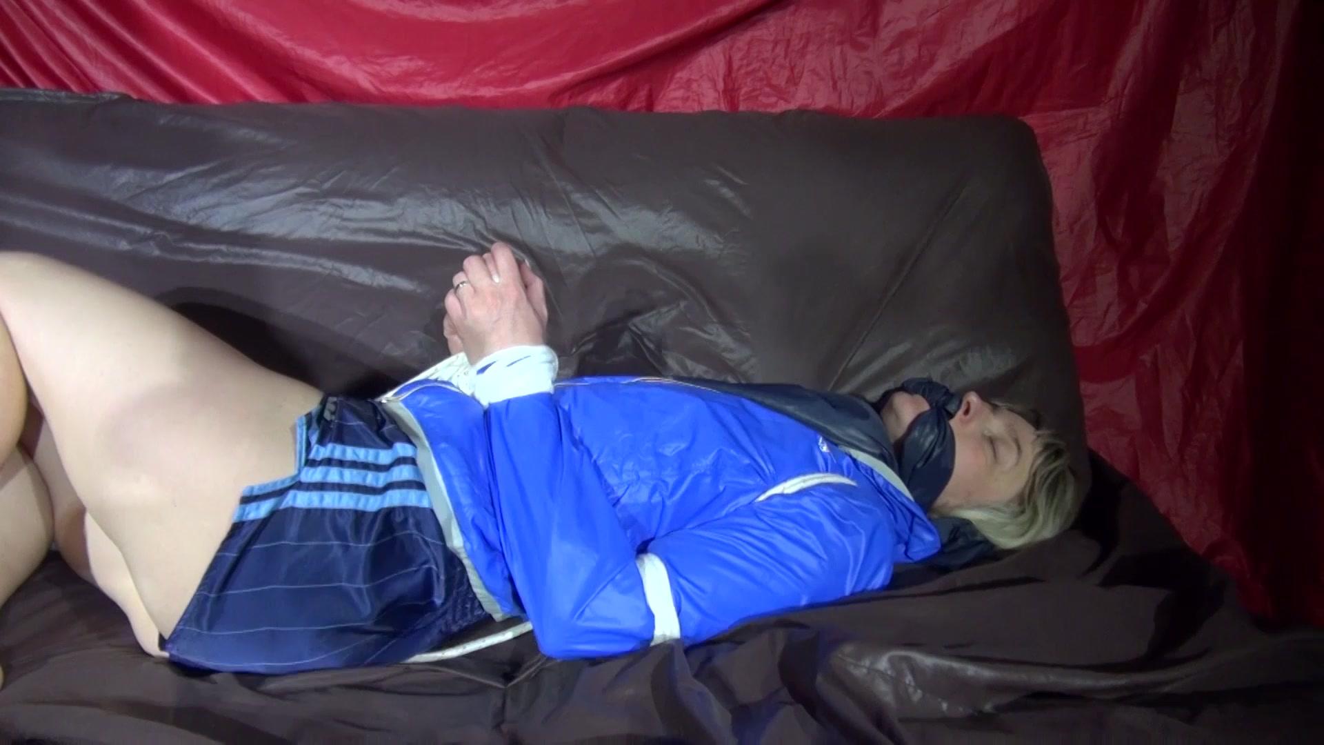 Sexy Sonja being tied and gagged on a sofa with ropes and a clothgag wearing a sexy oldschool blue shiny nylon shorts and a blue rain jacket (Video)