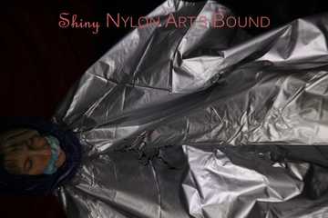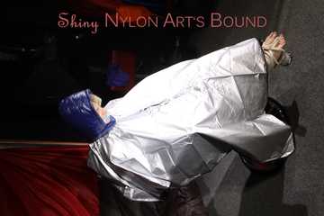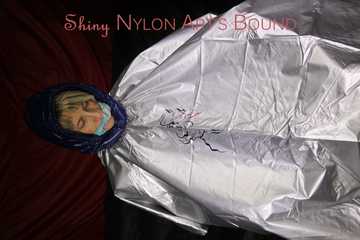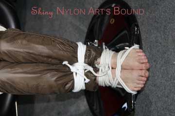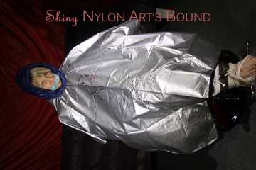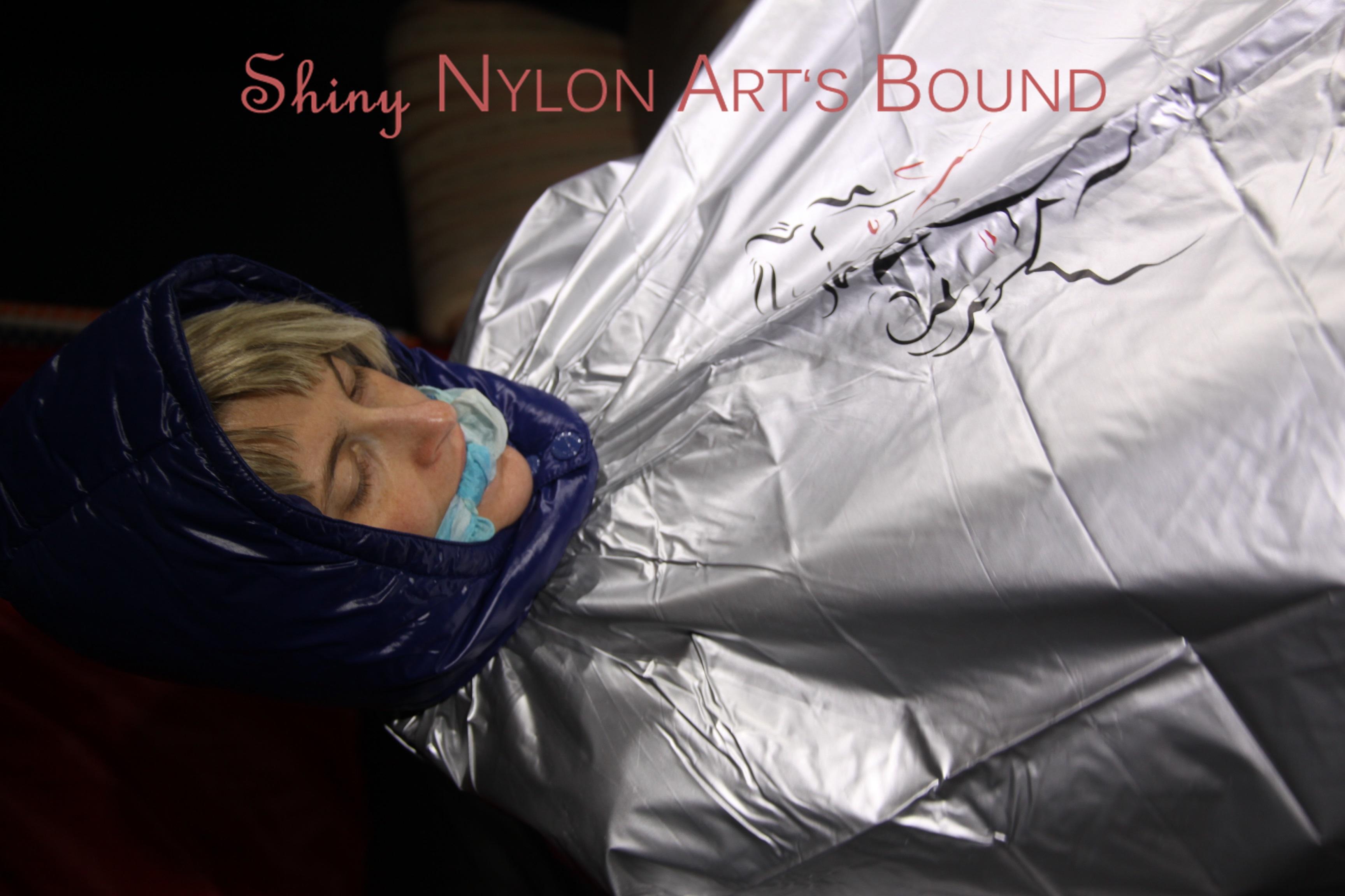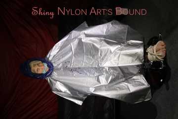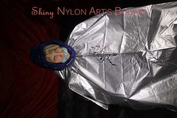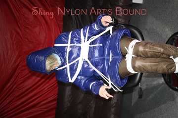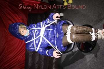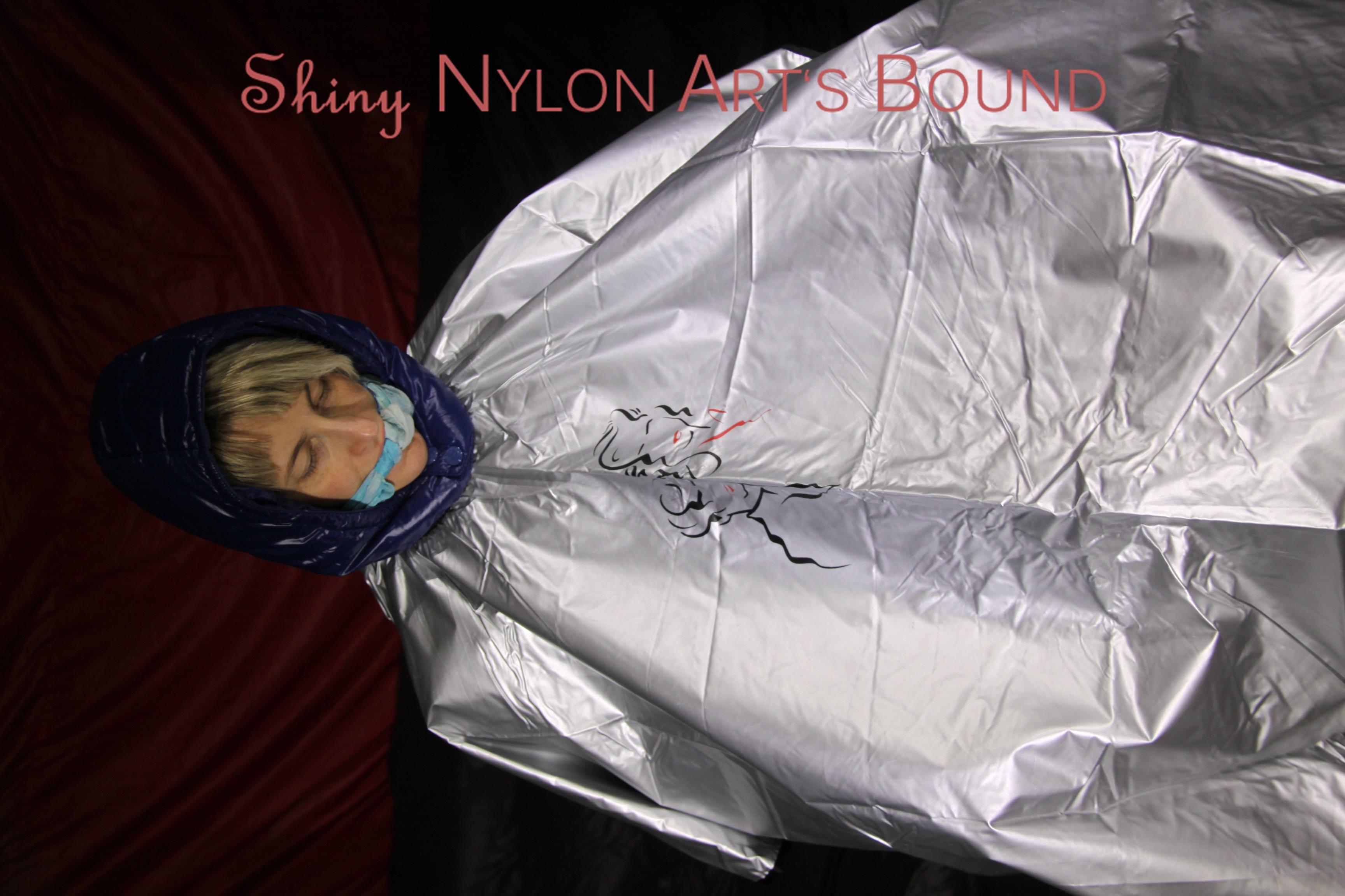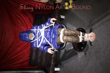 Sexy Sonja being tied and gagged on a stool with ropes and a clothgag wearing sexy shiny nylon dowmwear and a rain cape (Pics)