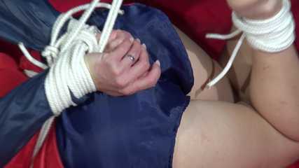 Sexy Sonja being tied and gagged with ropes and a clothgag on the ceiling overhead wearing a sexy blue shiny nylon shorts and a sexy blue/red rain jacket (Video)