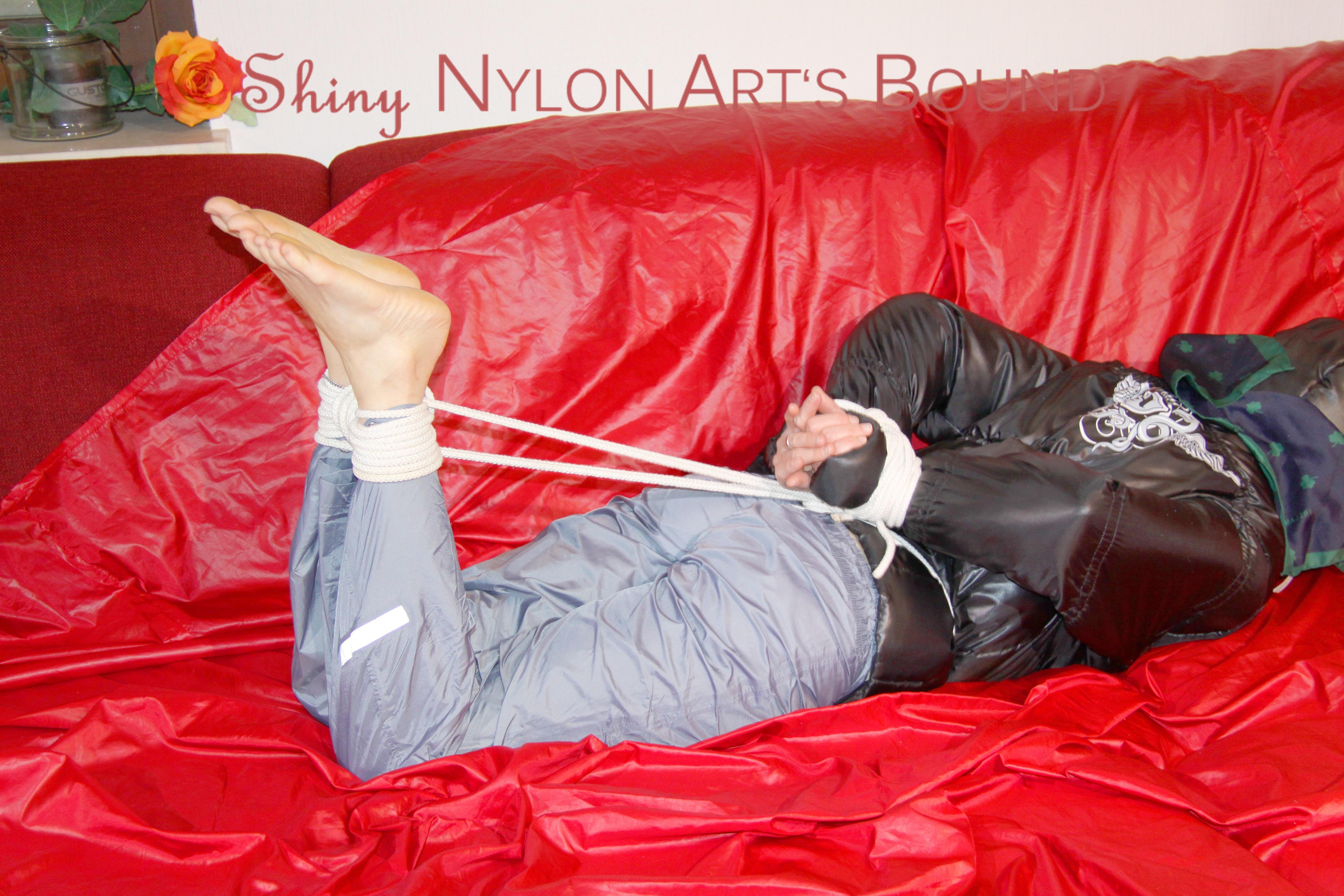 Sonja tied and gagged with ropes and a ball gag wearing a sexy grey shiny nylon rain pants and a black down jacket (Pics)