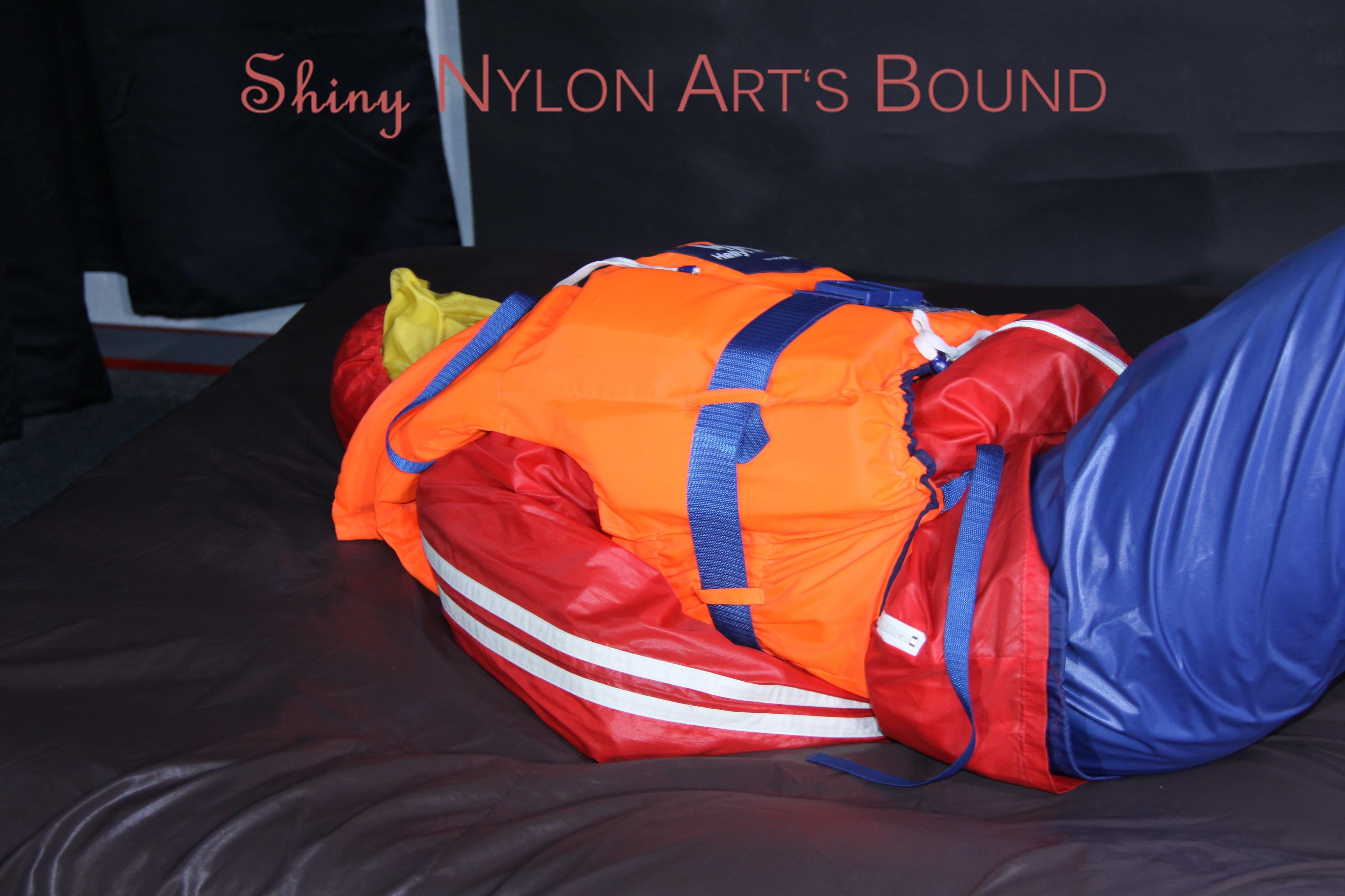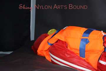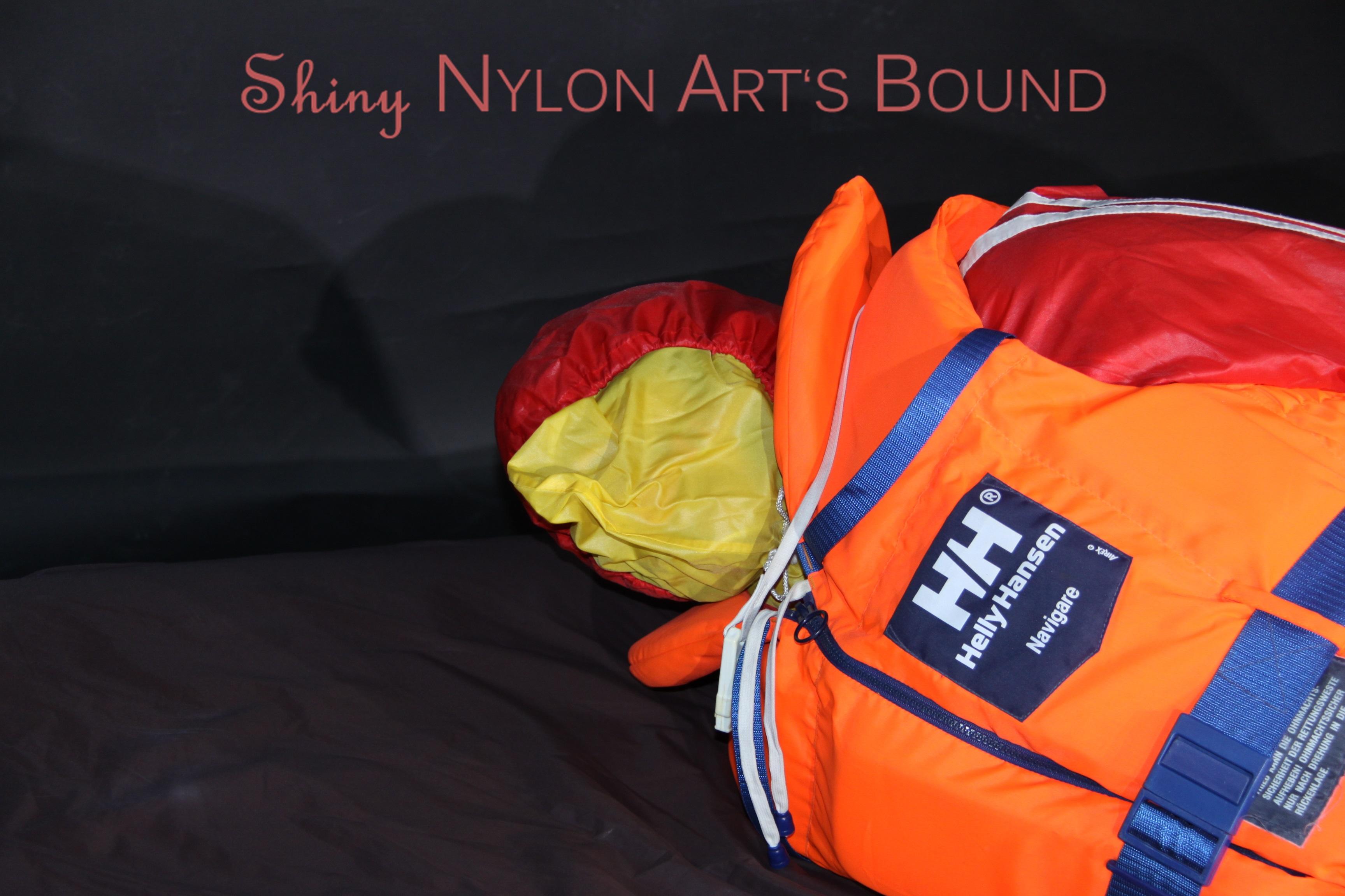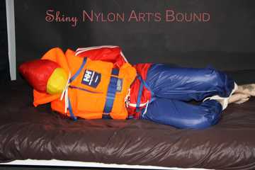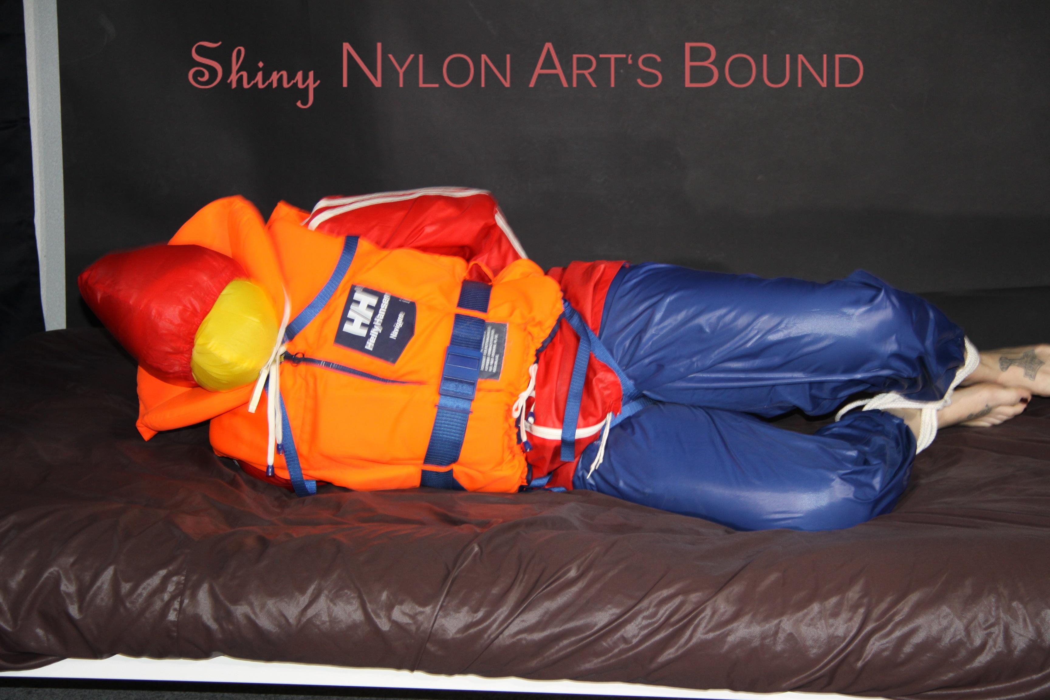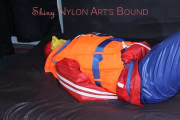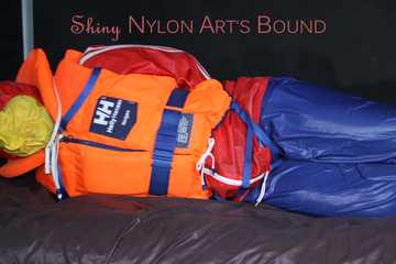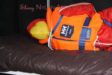 Watching Jill wearing a sexy shiny nylon rain pants and three shiny nylon rain jackets and a life jacket being tied and gagged and HOODED three times (Pics)
