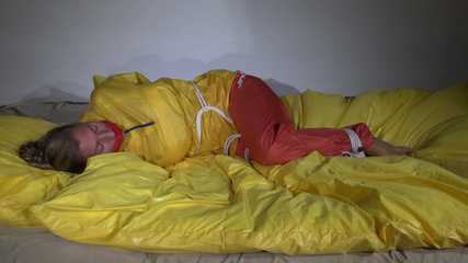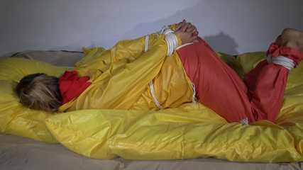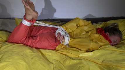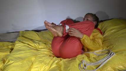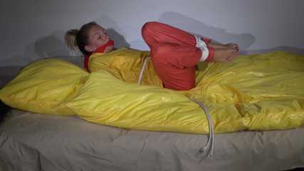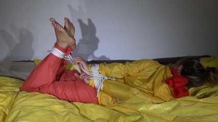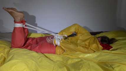 Watching Sandra wearing an orange shiny nylon rain pants and a yellow shiny nylon rain jacket being tied and gagged on a bed with ropes and a clothgag (Video)