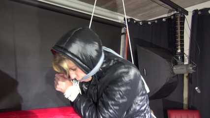 Watching sexy Pia being tied and gagged overhead with ropes and a clothgag wearing a sexy red/black crazy sensation combination (Video)