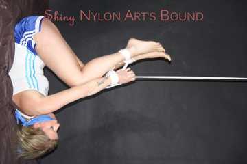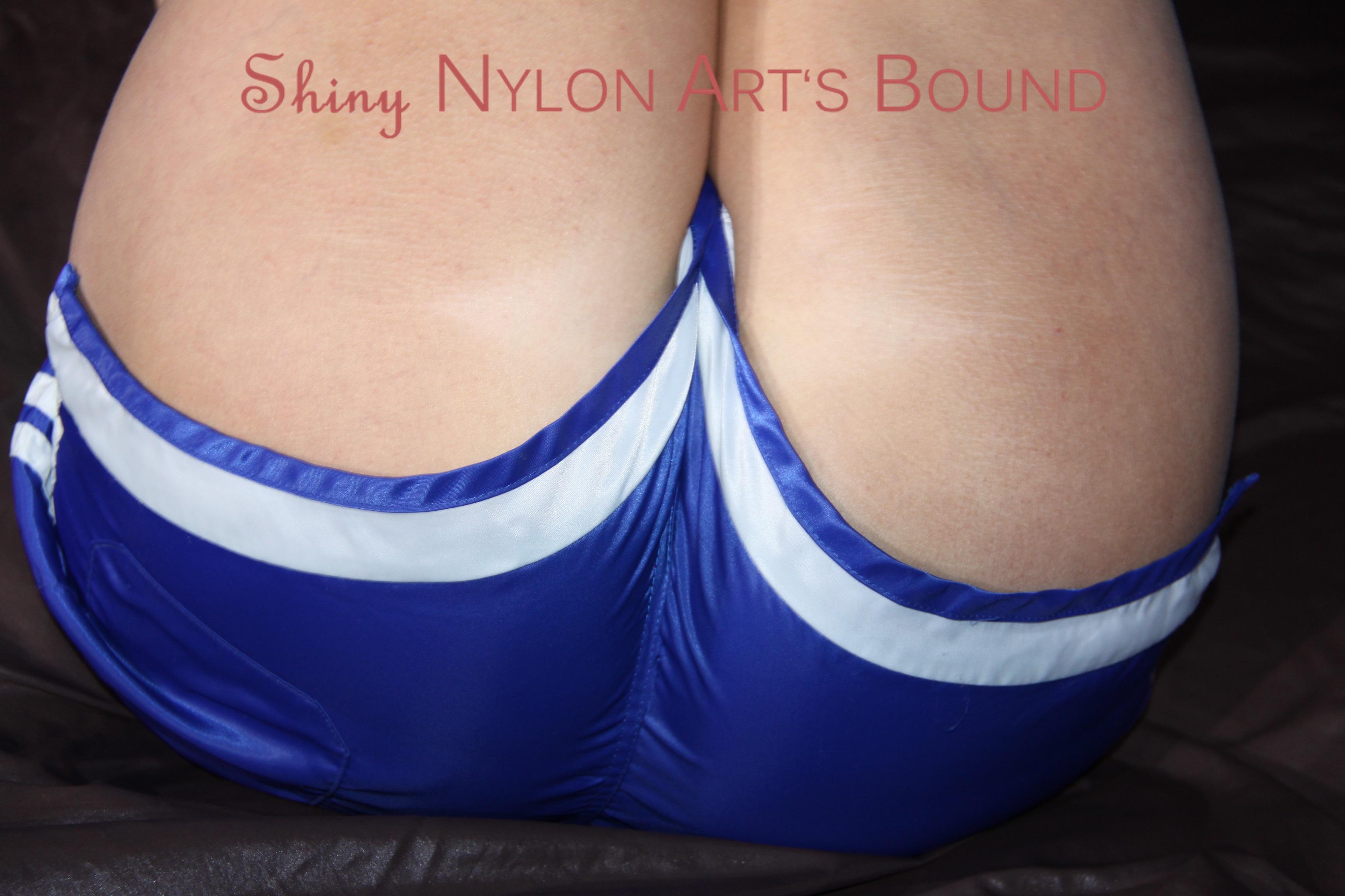 Watching sexy Pia wearing a supersexy blue shiny nylon shorts and a top being tied and gaggedoverhead with ropes and a clothgag (Pics)