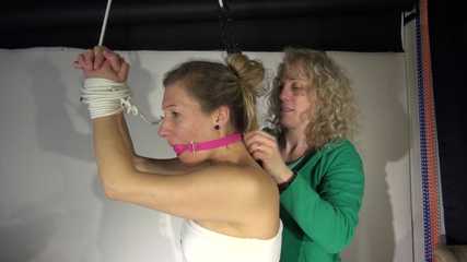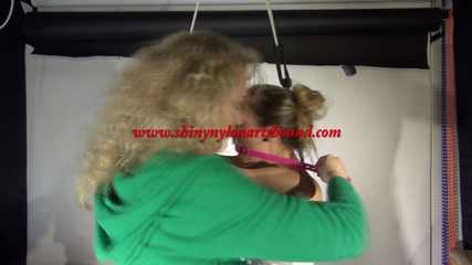 Watching sexy Sandra being tied and gagged with ropes and a ballgag overhead wearing shiny nylon shorts and a top (Video)