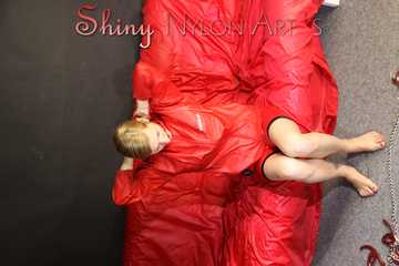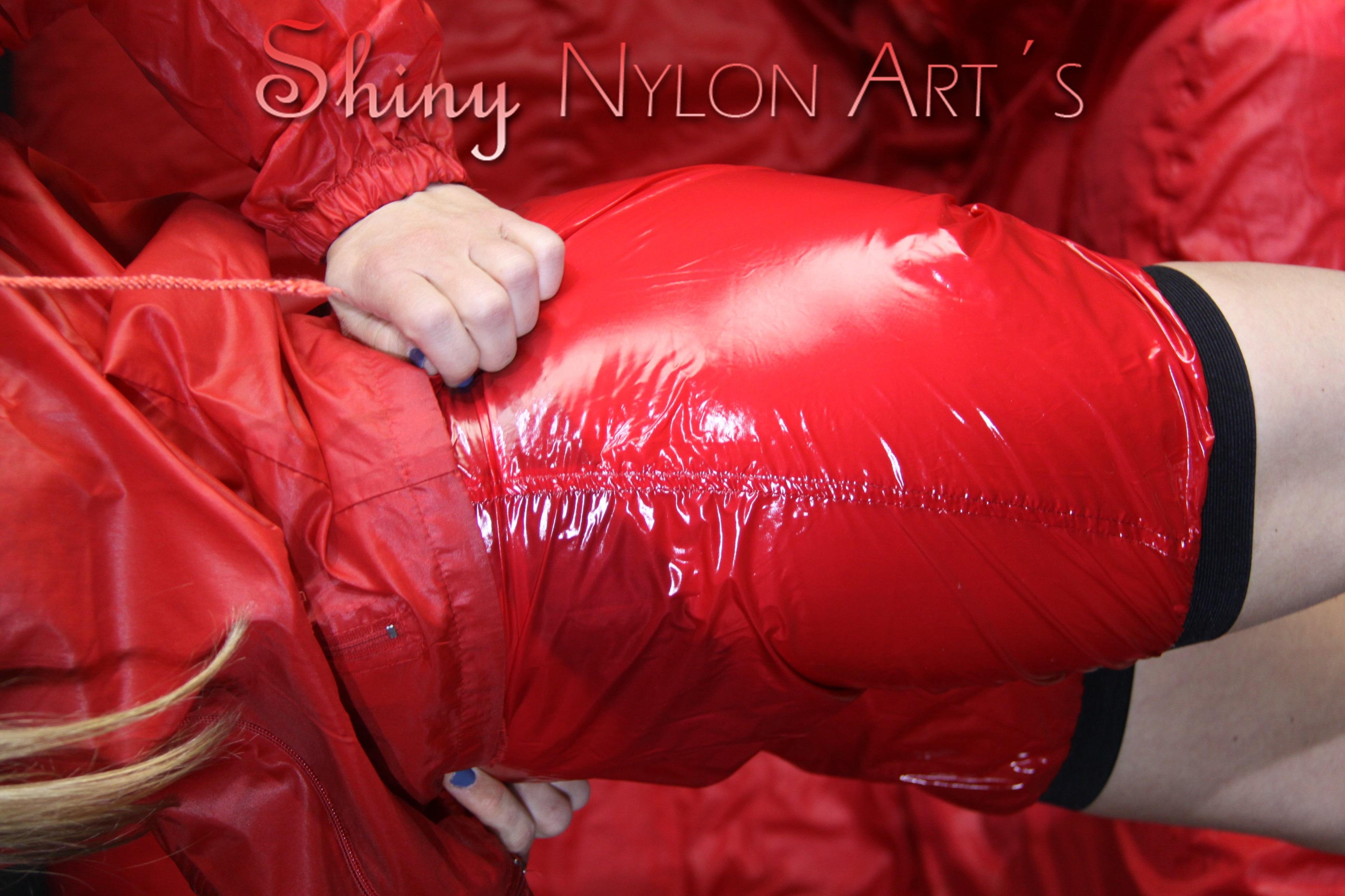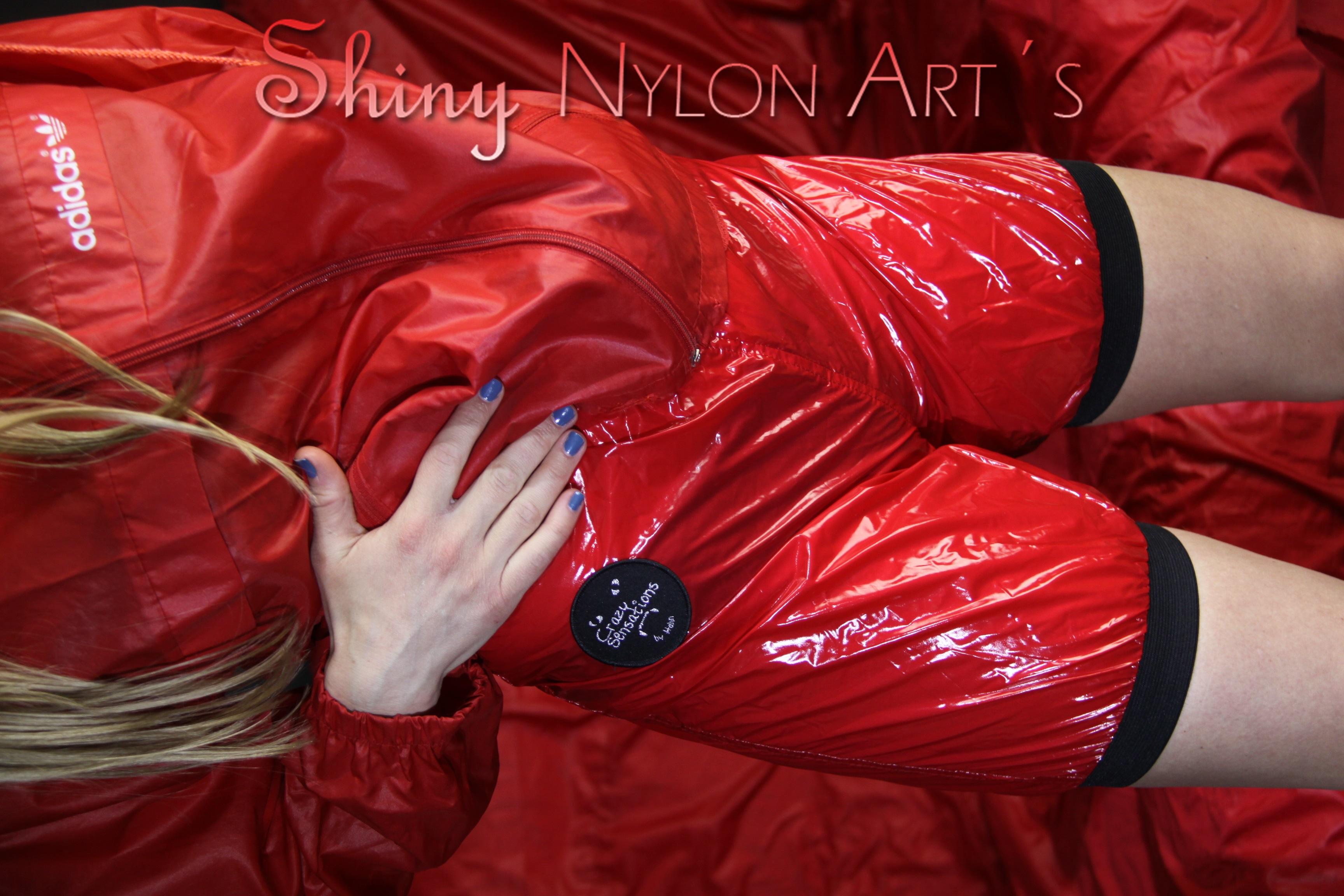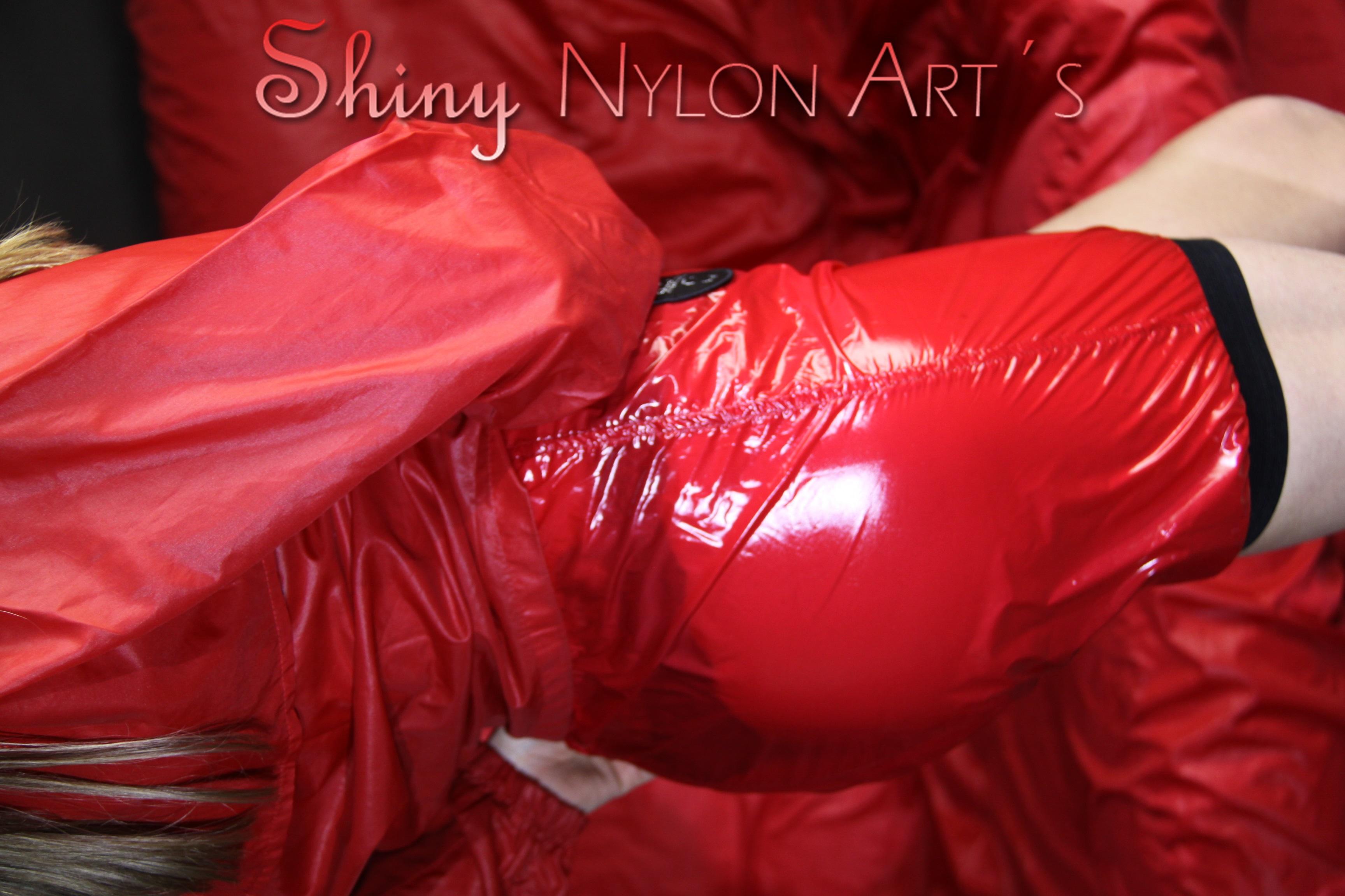Watching sexy Sandra during her selfbondage action with cuffs in a red shiny nylon Crazy Sensations Chillshorty and a shiny nylon rain jacket in red (www.crazysensations.com). Buy the original Short (used) from us.