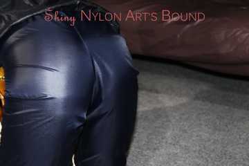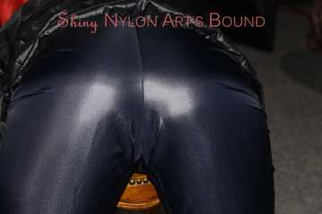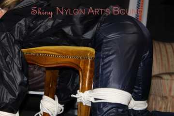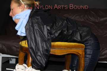 Watching sexy Sandra wearing a sexy blue shiny nylon pants and a rain jacket being tied and gagged with ropes and a clothgag on a stool (Pics)