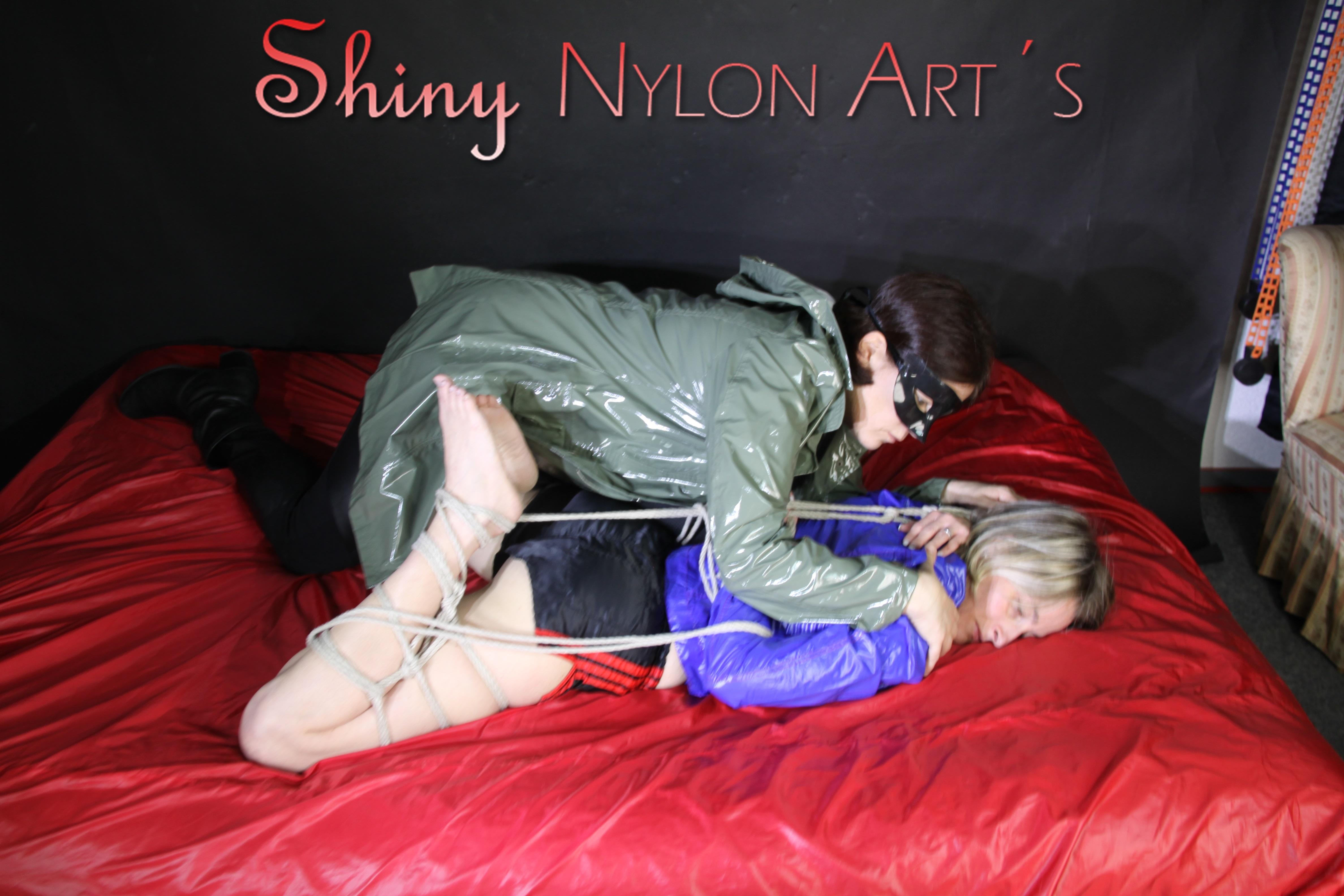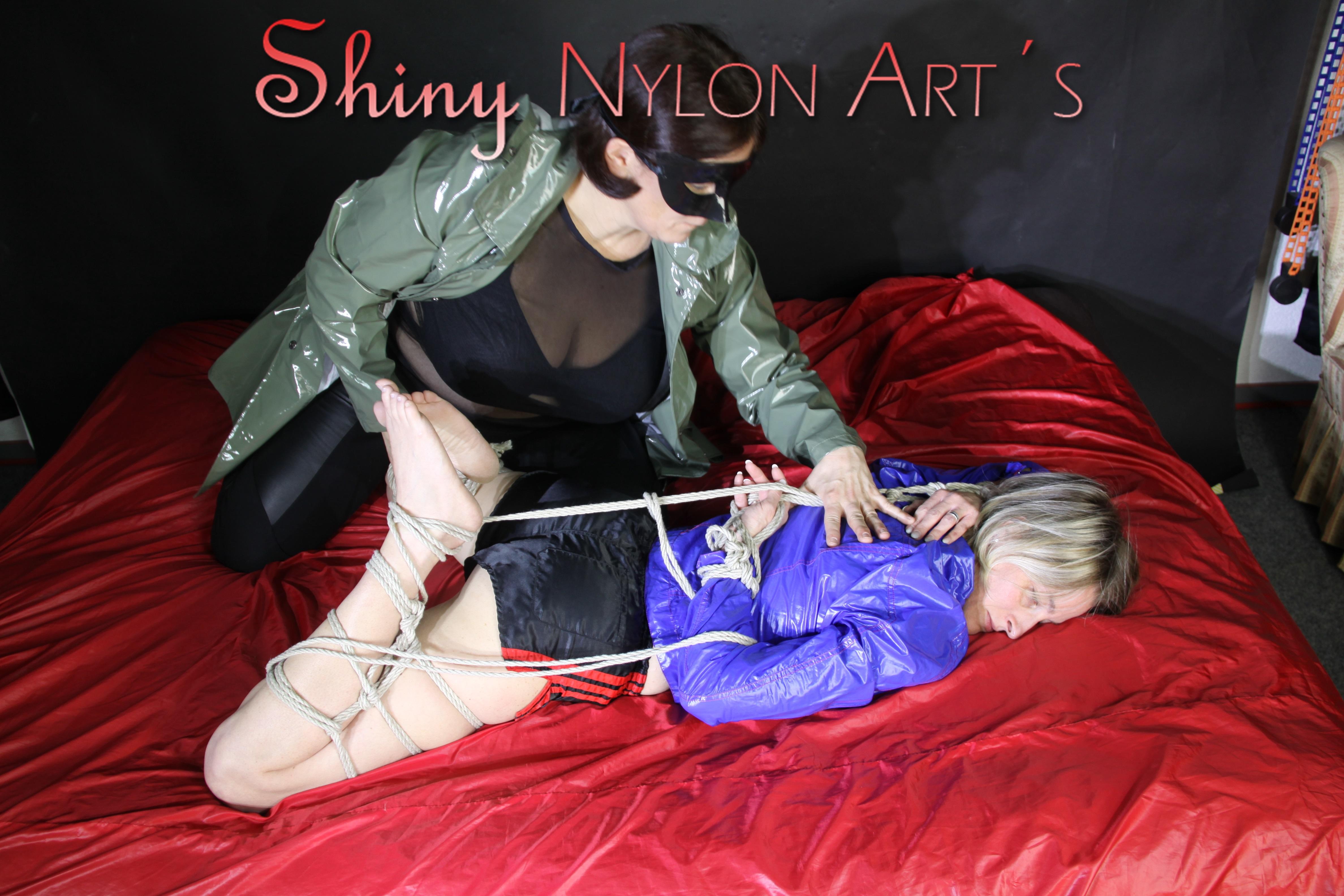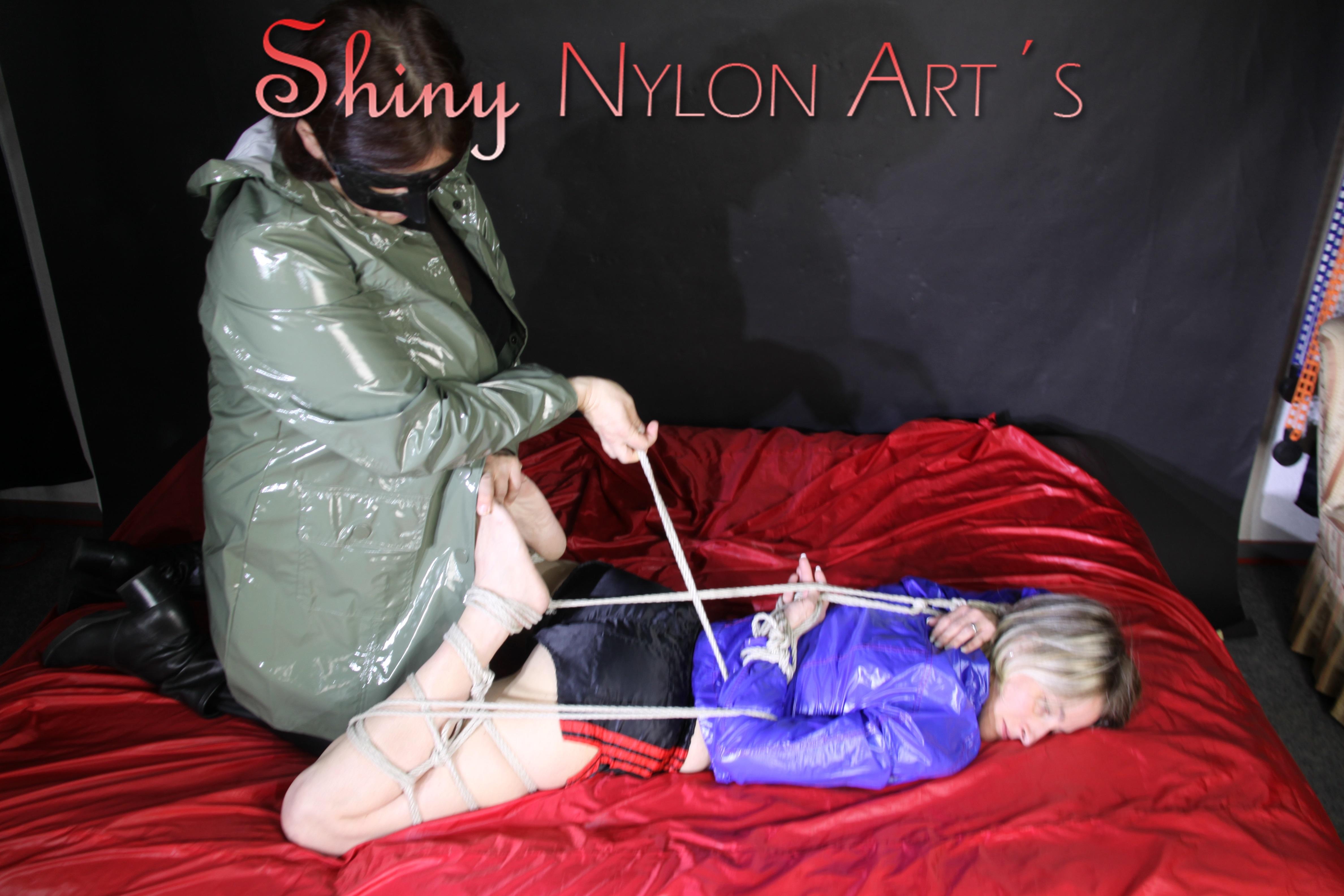 Watching sexy Sonja wearing a sexy shiny nylon shorts and a rain jacket being tied from Miss D with ropes (Pics)