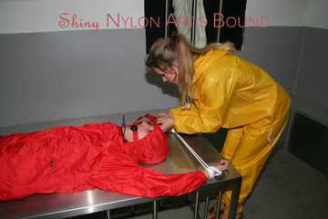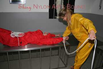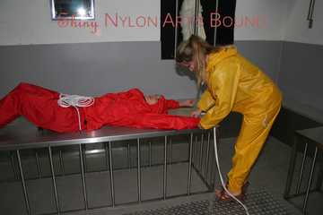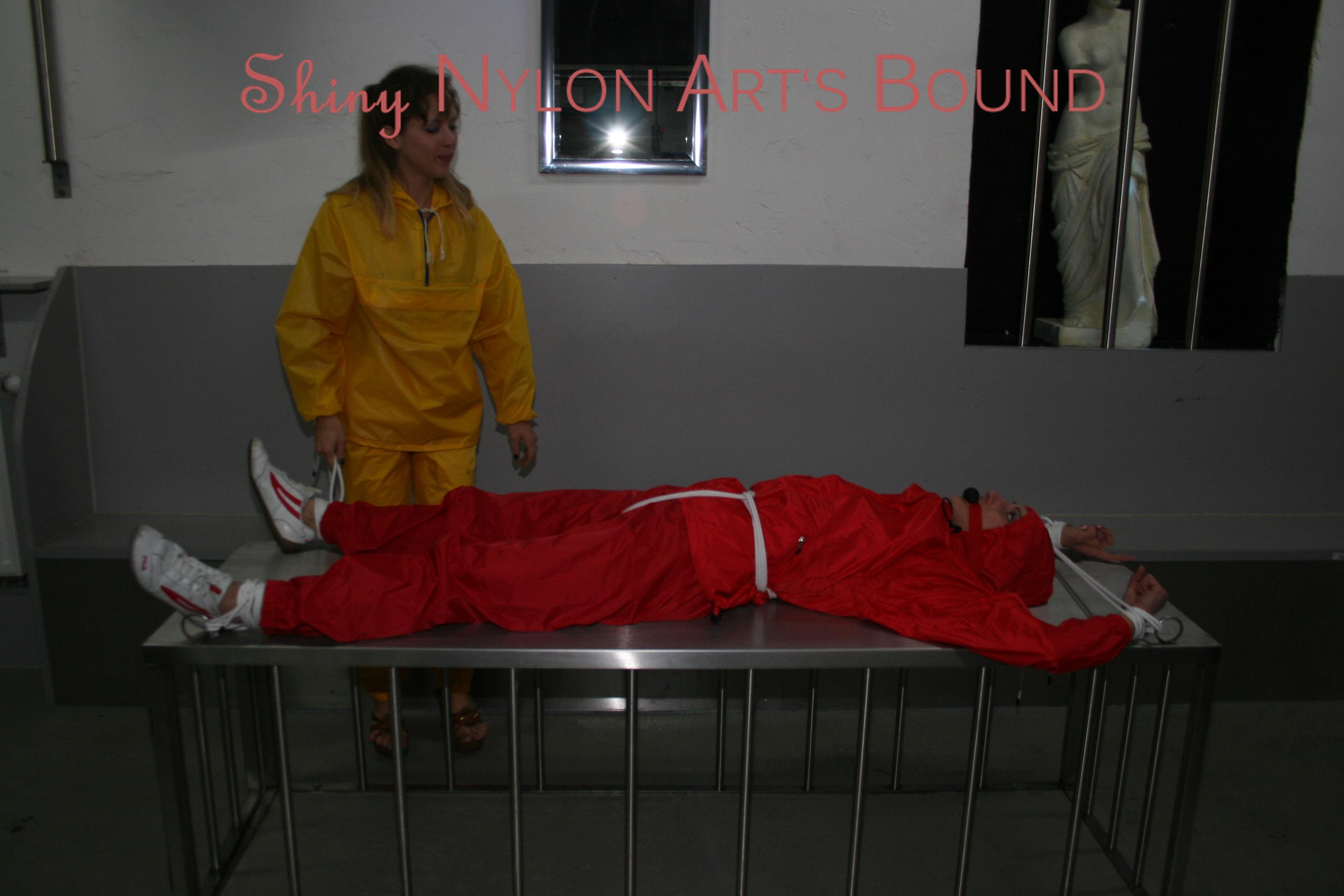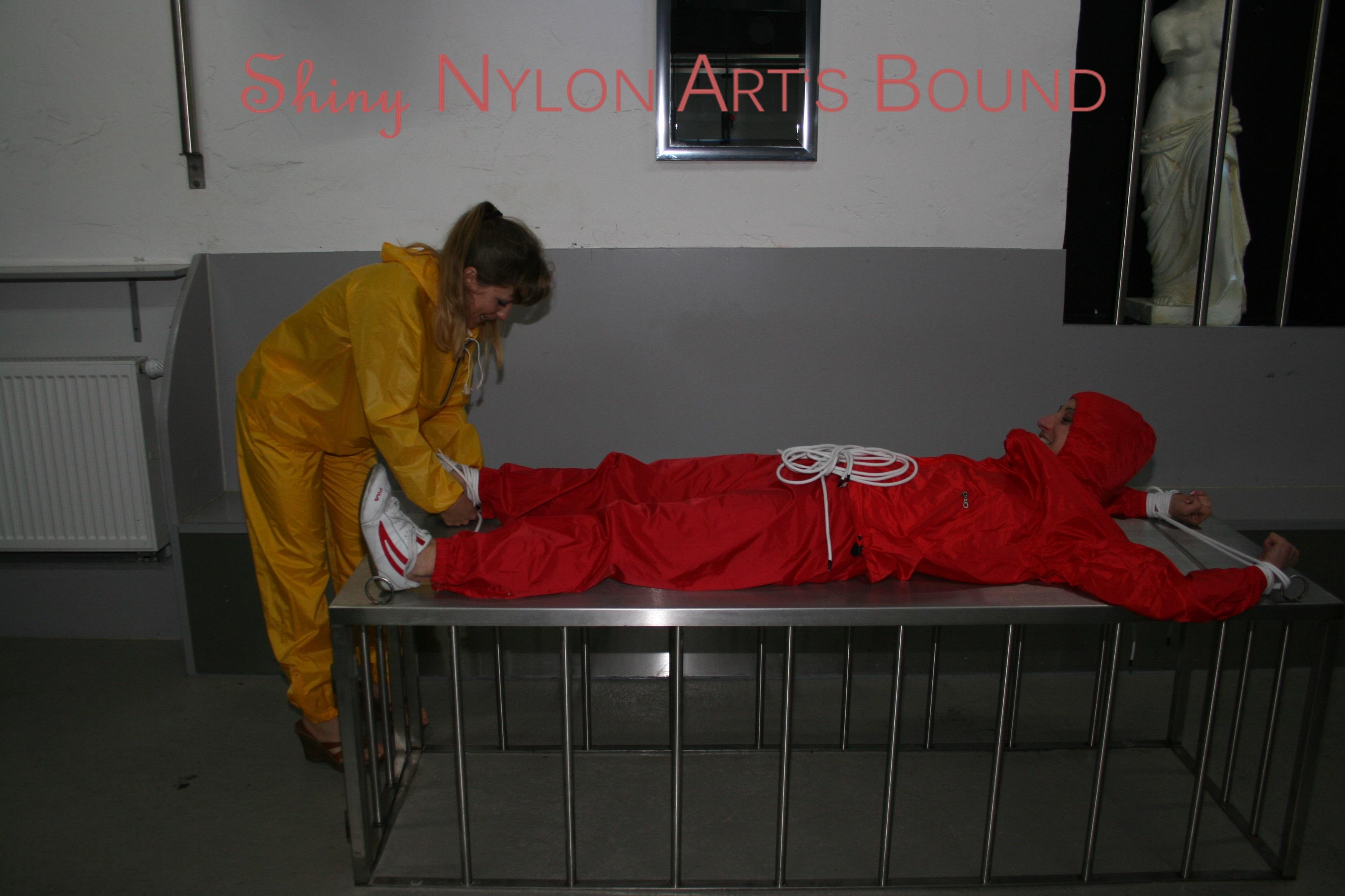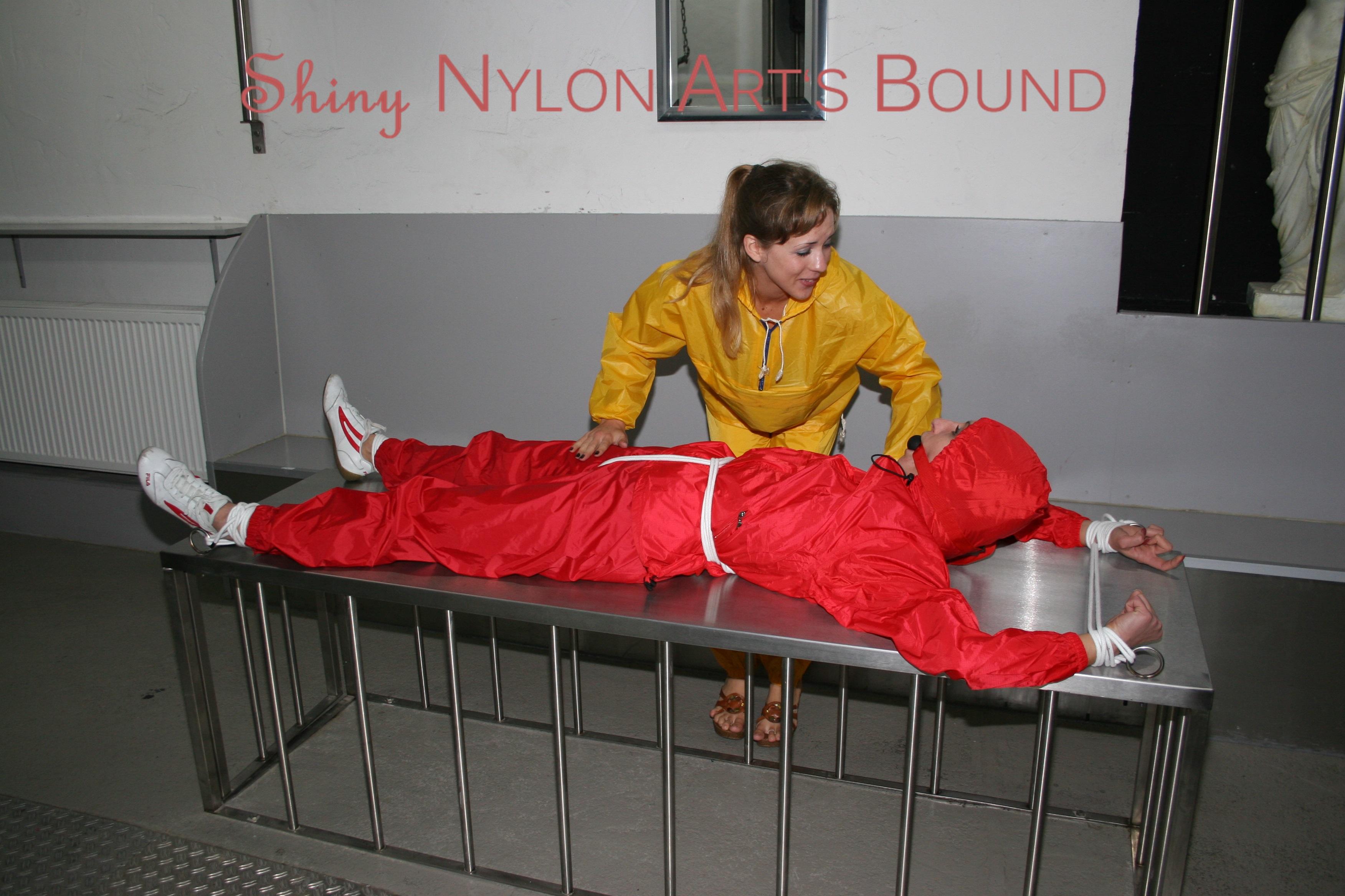 Watching Stella being tied and gagged with ropes and a ballgag on a operating table from Leonie both wearing sexy shiny nylon rainwear (Pics)