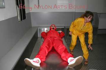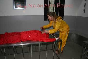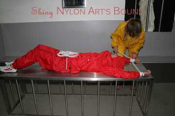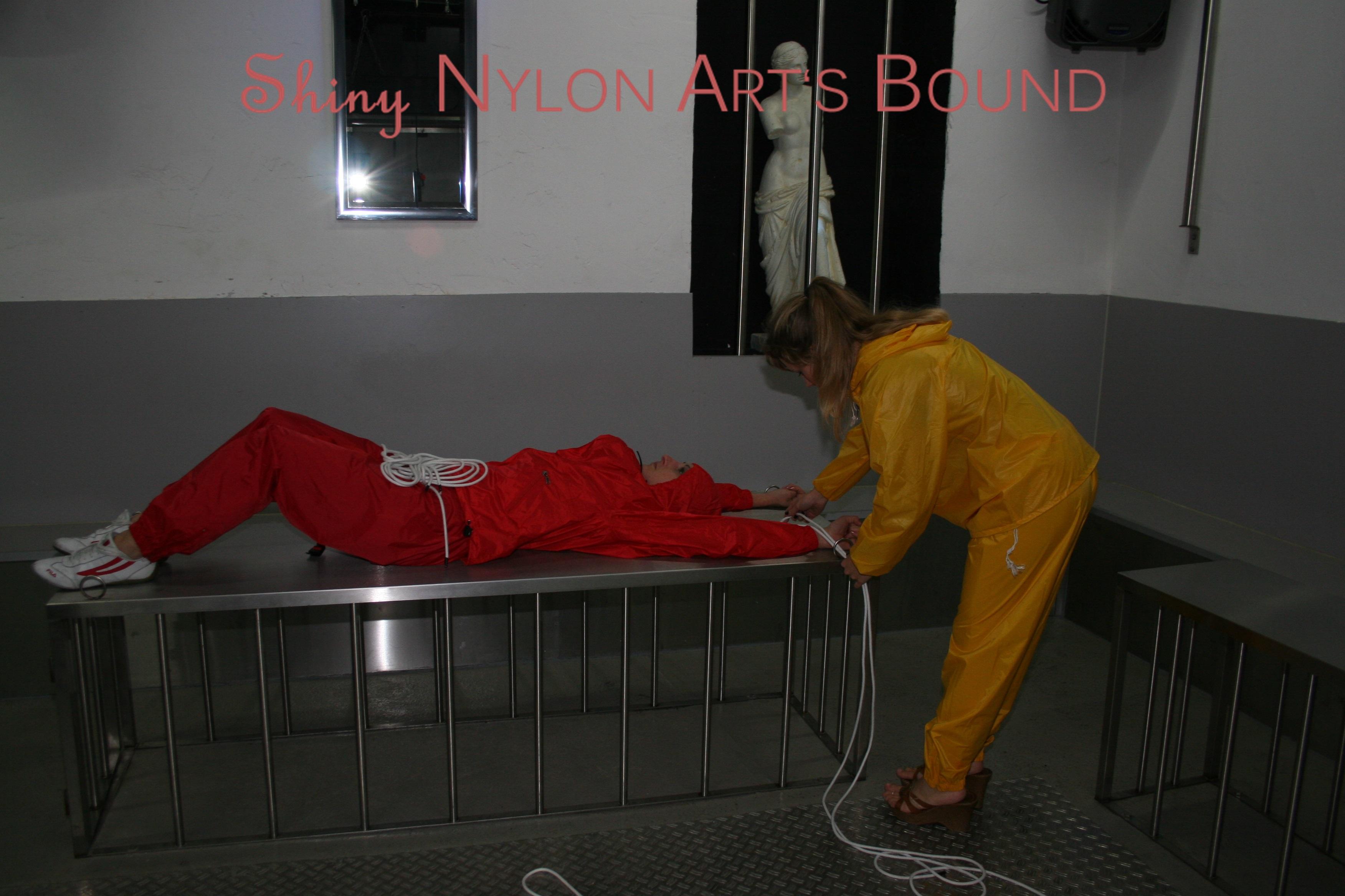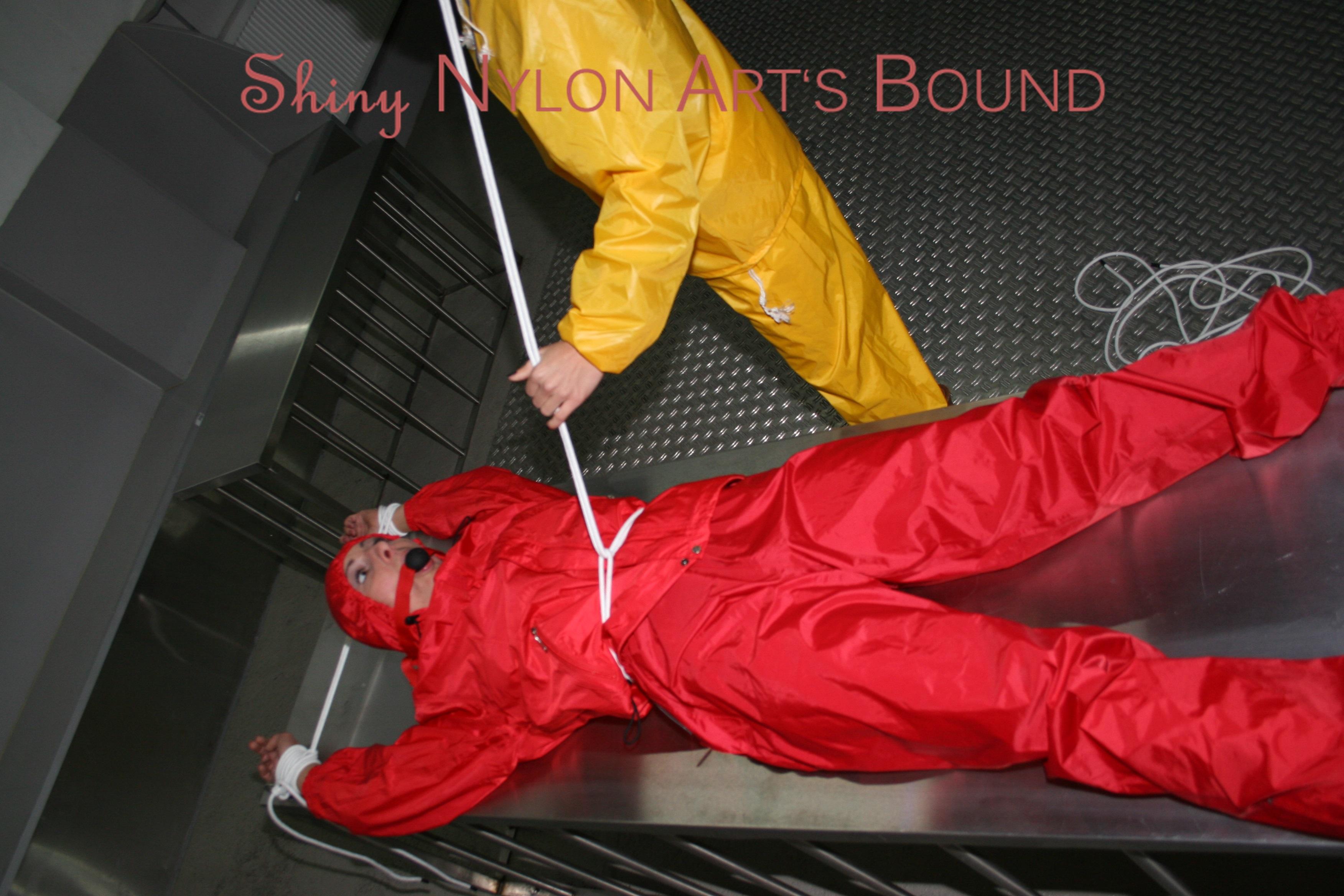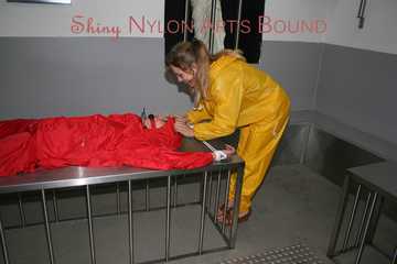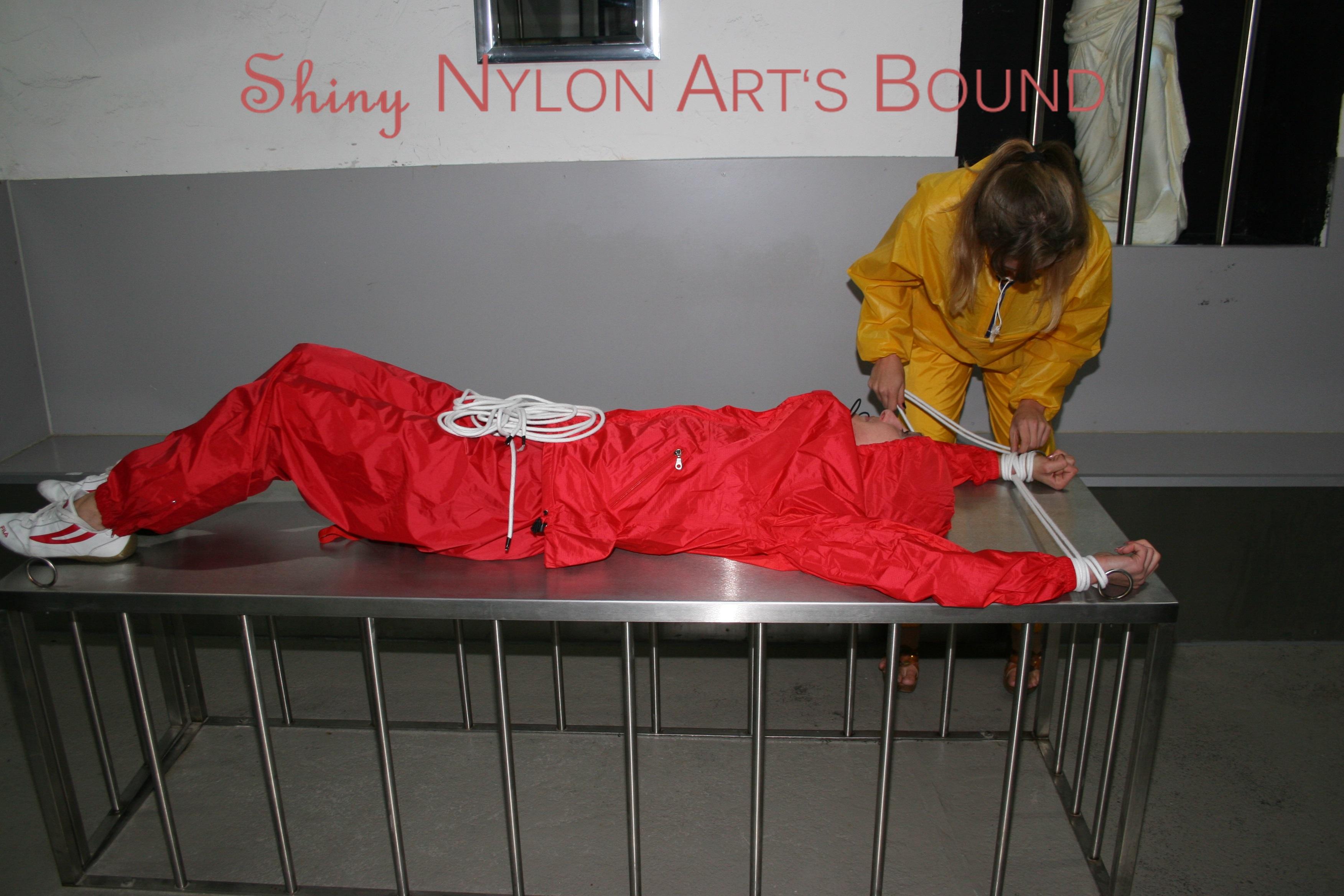 Watching Stella being tied and gagged with ropes and a ballgag on a operating table from Leonie both wearing sexy shiny nylon rainwear (Pics)
