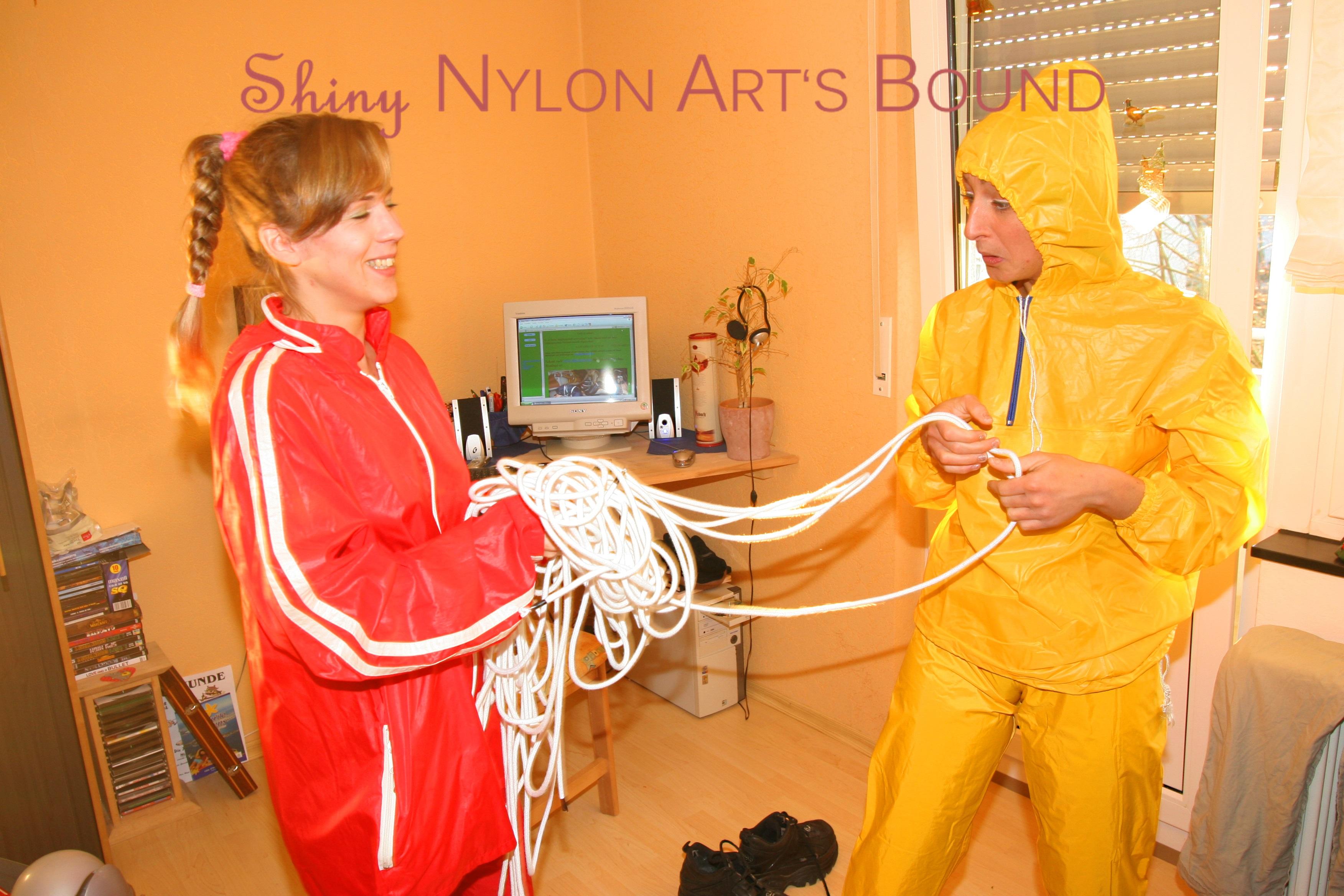 SEXY SANDRA being tied and gagged with ropes and a clothgag from Stella both wearing sexy shiny nylon AGU rainwear (Video)