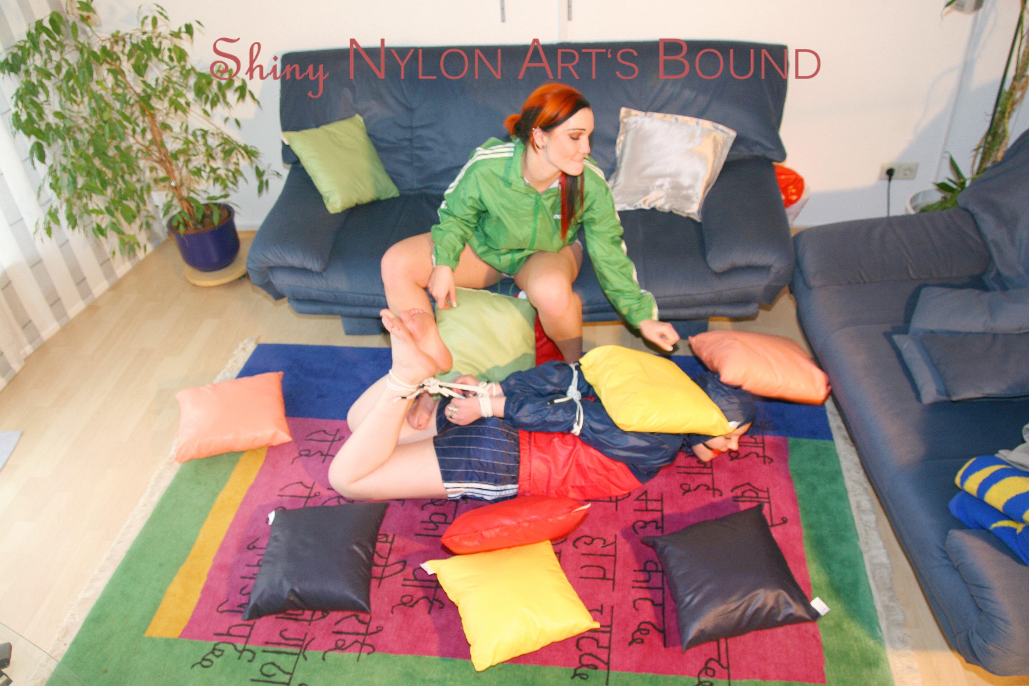 Watching sexy SONJA being tied and gagged with ropes and a clothgag by another girl on the bed both wearing sexy shiny nylon clothes (Video)
